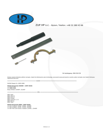 ZUP HP s.c. - Bytom, Telefon: +48 32 280 43 66 Nr katalogowy: 904 010 35 Zestaw zawiera blokadę wałków rozrządu, trzpień do blokowania wału korbowego, przyrząd do pozycjonowania czujnika wałka rozrządu oraz trzpień blokujący napinacza łańcucha. =============================== SUZUKI ======================================= SUZUKI Wagon R+ (2005-2008 Silniki benzynowe SUZUKI - (1997-2010) 1.0 TWIN CAMS 1.2 TWIN CAMS Kody silników: Z10XEP ; Z12XEP ================================ OPEL ========================================= OPEL OPEL OPEL OPEL OPEL OPEL OPEL Agila Astra G Astra H Combo Corsa B / C / D Meriva Tigra Silniki benzynowe OPEL- (1997-2010) 1.0 12V o kodach: X10XE ; Z10XE ; Z10XEP 1.2 16V o kodach: X12XE ; Z12XE ; Z12XEP 1.4 16V Twin Cam Ecotec o kodach: Z14XEL ; Z14XEP Strona 1 z 1