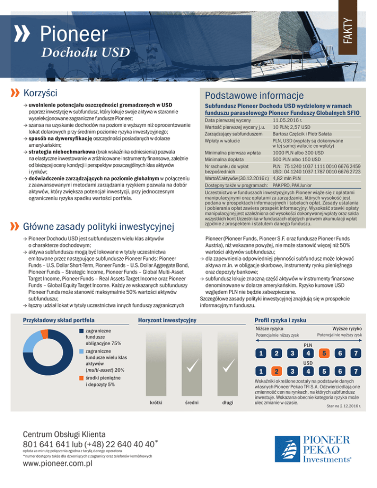FAKTY Pioneer Dochodu USD Korzyści → uwolnienie potencjału oszczędności gromadzonych w USD poprzez inwestycję w subfundusz, który lokuje swoje aktywa w starannie wyselekcjonowane zagraniczne fundusze Pioneer; → szansa na uzyskanie dochodów na poziomie wyższym niż oprocentowanie lokat dolarowych przy średnim poziomie ryzyka inwestycyjnego; → sposób na dywersyfikację oszczędności posiadanych w dolarze amerykańskim; → strategia niebechmarkowa (brak wskaźnika odniesienia) pozwala na elastyczne inwestowanie w zróżnicowane instrumenty finansowe, zależnie od bieżącej oceny kondycji i perspektyw poszczególnych klas aktywów i rynków; → doświadczenie zarządzających na poziomie globalnym w połączeniu z zaawansowanymi metodami zarządzania ryzykiem pozwala na dobór aktywów, który zwiększa potencjał inwestycji, przy jednoczesnym ograniczeniu ryzyka spadku wartości portfela. Główne zasady polityki inwestycyjnej → Pioneer Dochodu USD jest subfunduszem wielu klas aktywów o charakterze dochodowym; → aktywa subfunduszu mogą być lokowane w tytuły uczestnictwa emitowane przez następujące subfundusze Pioneer Funds: Pioneer Funds – U.S. Dollar Short-Term, Pioneer Funds – U.S. Dollar Aggregate Bond, Pioneer Funds – Strategic Income, Pioneer Funds – Global Multi-Asset Target Income, Pioneer Funds – Real Assets Target Income oraz Pioneer Funds – Global Equity Target Income. Każdy ze wskazanych subfunduszy Pioneer Funds może stanowić maksymalnie 50% wartości aktywów subfunduszu; → łączny udział lokat w tytuły uczestnictwa innych funduszy zagranicznych Przykładowy skład portfela Podstawowe informacje Subfundusz Pioneer Dochodu USD wydzielony w ramach funduszu parasolowego Pioneer Funduszy Globalnych SFIO Data pierwszej wyceny Wartość pierwszej wyceny j.u. Zarządzający subfunduszem Wpłaty w walucie 11.05.2016 r. 10 PLN; 2,57 USD Bartosz Częścik i Piotr Sałata PLN, USD (wypłaty są dokonywane w tej samej walucie co wpłaty) Minimalna pierwsza wpłata 1000 PLN albo 300 USD Minimalna dopłata 500 PLN albo 150 USD Nr rachunku do wpłat PLN: 75 1240 1037 1111 0010 6676 2459 bezpośrednich USD: 04 1240 1037 1787 0010 6676 2723 Wartość aktywów (30.12.2016 r.) 4,82 mln PLN Dostępny także w programach: PAK PRO, PAK Junior Uczestnictwo w funduszach inwestycyjnych Pioneer wiąże się z opłatami manipulacyjnymi oraz opłatami za zarządzanie, których wysokość jest podana w prospektach informacyjnych i tabelach opłat. Zasady ustalania i pobierania opłat zawiera prospekt informacyjny. Wysokość stawki opłaty manipulacyjnej jest uzależniona od wysokości dokonywanej wpłaty oraz salda wszystkich kont Uczestnika w funduszach objętych prawem akumulacji wpłat zgodnie z prospektem i statutem danego funduszu. Pioneer (Pioneer Funds, Pioneer S.F. oraz fundusze Pioneer Funds Austria), niż wskazane powyżej, nie może stanowić więcej niż 50% wartości aktywów subfunduszu; → dla zapewnienia odpowiedniej płynności subfundusz może lokować aktywa m.in. w obligacje skarbowe, instrumenty rynku pieniężnego oraz depozyty bankowe; → subfundusz lokuje znaczną część aktywów w instrumenty finansowe denominowane w dolarze amerykańskim. Ryzyko kursowe USD względem PLN nie będzie zabezpieczane. Szczegółowe zasady polityki inwestycyjnej znajdują się w prospekcie informacyjnym funduszu. Horyzont inwestycyjny Profil ryzyka i zysku Niższe ryzyko z agraniczne fundusze obligacyjne 75% 1 z agraniczne fundusze wielu klas aktywów (multi-asset ) 20% 1 ś rodki pieniężne i depozyty 5% krótki entrum Obsługi Klienta C 801 641 641 lub (+48) 22 640 40 40* o płata za minutę połączenia zgodna z taryfą danego operatora *numer dostępny także dla dzwoniących z zagranicy oraz telefonów komórkowych www.pioneer.com.pl Wyższe ryzyko Potencjalnie wyższy zysk Potencjalnie niższy zysk średni długi 2 2 3 3 PLN 4 USD 4 5 6 7 5 6 7 Wskaźniki określone zostały na podstawie danych własnych Pioneer Pekao TFI S.A. Odzwierciedlają one zmienność cen na rynkach, na których subfundusz inwestuje. Wskazana obecnie kategoria ryzyka może ulec zmianie w czasie. Stan na 2.12.2016 r. Pioneer Dochodu USD Subfundusz może zainteresować osoby, które: → posiadają oszczędności w dolarach amerykańskich i poszukują innego niż depozyty walutowe sposobu ich inwestowania; → planują zainwestować środki w horyzoncie średnio i długoterminowym; → akceptują średni poziom ryzyka inwestycyjnego wynikający z inwestowania części aktywów subfunduszu w zagraniczne fundusze denominowane w dolarze amerykańskim, które lokują swoje aktywa głównie w instrumenty finansowe o charakterze dłużnym, w tym emitentów o podwyższonym ryzyku kredytowym, a także w zagraniczne fundusze denominowane w dolarze amerykańskim koncentrujące się na inwestycjach w instrumenty finansowe generujące regularne dochody w formie dywidend, odsetek (głównie akcje spółek wypłacających regularnie dywidendy powyżej średniej wartości dywidendy w poszczególnych branżach oraz obligacje przedsiębiorstw wypłacających odsetki na ponadprzeciętnym poziomie); → s ą świadome, że istnieje możliwość zarówno wzrostu, jak i spadku wartości inwestycji, a także w przypadku inwestycji w PLN są świadome dodatkowego ryzyka zmian kursowych. Dolar jedną z najbardziej cenionych walut świata → Dolar amerykański jest oficjalną walutą w 14 krajach. → W amerykańskiej walucie ulokowanych było, według danych Międzynarodowego Funduszu Walutowego, na koniec 2015 roku ok. 64% globalnych rezerw walutowych. → Dolar jest najczęściej używaną walutą w transakcjach międzynarodowych. Tę dominującą pozycję amerykańska waluta zdobyła po II wojnie światowej. → W dolarze nominowanych jest większość globalnych kontraktów, np. na ropę. → Wiele dużych gospodarek – w tym Chiny, Hongkong, Malezja, Singapur – związało sztywno swo