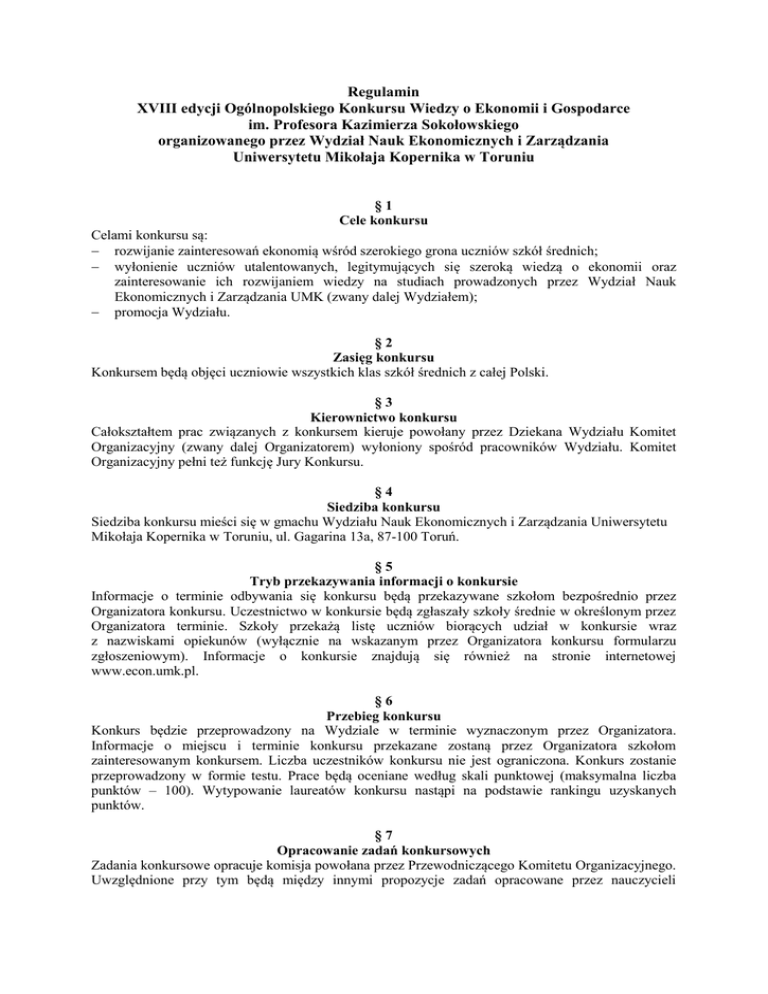 Regulamin XVIII edycji Ogólnopolskiego Konkursu Wiedzy o Ekonomii i Gospodarce im. Profesora Kazimierza Sokołowskiego organizowanego przez Wydział Nauk Ekonomicznych i Zarządzania Uniwersytetu Mikołaja Kopernika w Toruniu §1 Cele konkursu Celami konkursu są: rozwijanie zainteresowań ekonomią wśród szerokiego grona uczniów szkół średnich; wyłonienie uczniów utalentowanych, legitymujących się szeroką wiedzą o ekonomii oraz zainteresowanie ich rozwijaniem wiedzy na studiach prowadzonych przez Wydział Nauk Ekonomicznych i Zarządzania UMK (zwany dalej Wydziałem); promocja Wydziału. §2 Zasięg konkursu Konkursem będą objęci uczniowie wszystkich klas szkół średnich z całej Polski. §3 Kierownictwo konkursu Całokształtem prac związanych z konkursem kieruje powołany przez Dziekana Wydziału Komitet Organizacyjny (zwany dalej Organizatorem) wyłoniony spośród pracowników Wydziału. Komitet Organizacyjny pełni też funkcję Jury Konkursu. §4 Siedziba konkursu Siedziba konkursu mieści się w gmachu Wydziału Nauk Ekonomicznych i Zarządzania Uniwersytetu Mikołaja Kopernika w Toruniu, ul. Gagarina 13a, 87-100 Toruń. §5 Tryb przekazywania informacji o konkursie Informacje o terminie odbywania się konkursu będą przekazywane szkołom bezpośrednio przez Organizatora konkursu. Uczestnictwo w konkursie będą zgłaszały szkoły średnie w określonym przez Organizatora terminie. Szkoły przekażą listę uczniów biorących udział w konkursie wraz z nazwiskami opiekunów (wyłącznie na wskazanym przez Organizatora konkursu formularzu zgłoszeniowym). Informacje o konkursie znajdują się również na stronie internetowej www.econ.umk.pl. §6 Przebieg konkursu Konkurs będzie przeprowadzony na Wydziale w terminie wyznaczonym przez Organizatora. Informacje o miejscu i terminie konkursu przekazane zostaną przez Organizatora szkołom zainteresowanym konkursem. Liczba uczestników konkursu nie jest ograniczona. Konkurs zostanie przeprowadzony w formie testu. Prace będą oceniane według skali punktowej (maksymalna liczba punktów – 100). Wytypowanie laureatów konkursu nastąpi na podstawie rankingu uzyskanych punktów. §7 Opracowanie zadań konkursowych Zadania konkursowe opracuje komisja powołana przez Przewodniczącego Komitetu Organizacyjnego. Uwzględnione przy tym będą między innymi propozycje zadań opracowane przez nauczycieli zainteresowanych szkół średnich, które Komitet Organizacyjny będzie przyjmował w ciągu całego roku. Tajemnicę zadań zabezpiecza Przewodniczący Komitetu Organizacyjnego. §8 Ocena prac konkursowych Ocena prac konkursowych zostanie dokonana przez Zespół Oceniający Prace Konkursowe powołany przez Przewodniczącego Komitetu Organizacyjnego spośród pracowników Wydziału. Po dokonaniu oceny prac Zespół opracuje zestawienie wyników i przedstawi je do zatwierdzenia przez Jury Konkursu. §9 Ogłoszenie wyników konkursu Tryb ogłoszenia wyników konkursu zostanie określony przez Organizatora. Laureaci konkursu oraz szkoły finalistów konkursu zostaną powiadomieni odpowiednimi pismami. § 10 Odwołania Pisemne odwołania od decyzji Jury Konkursu dotyczące wyników konkursu należy kierować do Przewodniczącego Komitetu Organizacyjnego w terminie siedmiu dni od daty ogłoszenia wyników. § 11 Nagrody Na podstawie Uchwały Nr 37 Senatu Uniwersytetu Mikołaja Kopernika w Toruniu z dnia 25 marca 2014 r. laureatom konkursu, tj. uczestnikom, którzy zajmą pierwszych dziesięć miejsc, przysługują uprawnienia w postaci maksymalnej liczby punktów z postępowania kwalifikacyjnego na kierunki: ekonomia, matematyka i ekonomia, finanse i rachunkowość oraz zarządzanie prowadzone na Wydziale Nauk Ekonomicznych i Zarządzania UMK, a także na kierunki: pedagogika, pedagogika specjalna i praca socjalna prowadzone na Wydziale Nauk Pedagogicznych UMK (z uprawnień można skorzystać w ciągu trzech lat od roku uzyskania świadectwa dojrzałości). Ponadto, Laureaci konkursu zostaną uhonorowani dyplomami oraz nagrodami rzeczowymi. Laureatom konkursu zostaną również przekazane materiały promocyjne UMK. Tryb i termin wręczenia dyplomów i nagród laureatom konkursu zostanie określony przez Organizatora. § 12 Postanowienia końcowe W przypadku zgłoszenia zbyt małej liczby szkół Wydział w danym roku może odstąpić od przeprowadzenia konkursu.