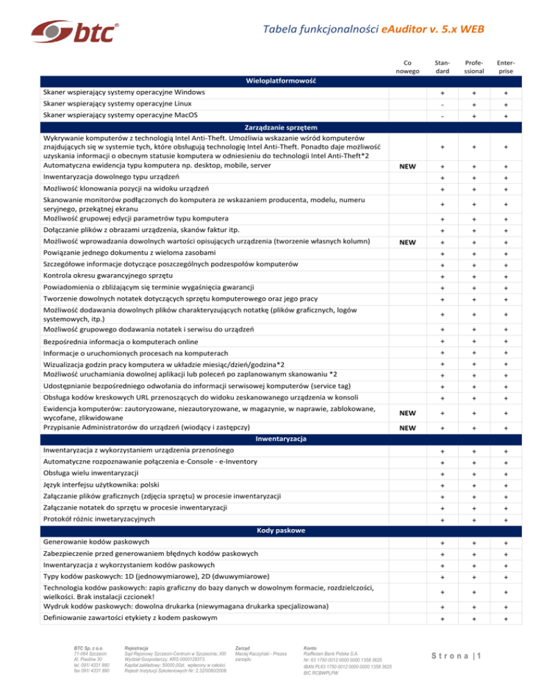 Tabela funkcjonalności eAuditor v. 5.x WEB Co nowego Standard Professional Enterprise Skaner wspierający systemy operacyjne Windows + + + Skaner wspierający systemy operacyjne Linux - + + Skaner wspierający systemy operacyjne MacOS - + + Zarządzanie sprzętem Wykrywanie komputerów z technologią Intel Anti-Theft. Umożliwia wskazanie wśród komputerów znajdujących się w systemie tych, które obsługują technologię Intel Anti-Theft. Ponadto daje możliwość uzyskania informacji o obecnym statusie komputera w odniesieniu do technologii Intel Anti-Theft*2 Automatyczna ewidencja typu komputera np. desktop, mobile, server + + + Wieloplatformowość + + + Inwentaryzacja dowolnego typu urządzeń NEW + + + Możliwość klonowania pozycji na widoku urządzeń + + + + + + + + + + + + + + + Powiązanie jednego dokumentu z wieloma zasobami + + + Szczegółowe informacje dotyczące poszczególnych podzespołów komputerów + + + Kontrola okresu gwarancyjnego sprzętu + + + Powiadomienia o zbliżającym się terminie wygaśnięcia gwarancji + + + Tworzenie dowolnych notatek dotyczących sprzętu komputerowego oraz jego pracy + + + + + + + + + Bezpośrednia informacja o komputerach online + + + Informacje o uruchomionych procesach na komputerach + + + Wizualizacja godzin pracy komputera w układzie miesiąc/dzień/godzina*2 Możliwość uruchamiania dowolnej aplikacji lub poleceń po zaplanowanym skanowaniu *2 + + + + + + Udostępnianie bezpośredniego odwołania do informacji serwisowej komputerów (service tag) + + + Obsługa kodów kreskowych URL przenoszących do widoku zeskanowanego urządzenia w konsoli + + + NEW + + + NEW + + + Inwentaryzacja z wykorzystaniem urządzenia przenośnego + + + Automatyczne rozpoznawanie połączenia e-Console - e-Inventory + + + Obsługa wielu inwentaryzacji + + + Język interfejsu użytkownika: polski + + + Załączanie plików graficznych (zdjęcia sprzętu) w procesie inwentaryzacji + + + Załączanie notatek do sprzętu w procesie inwentaryzacji + + + + + + Generowanie kodów paskowych + + + Zabezpieczenie przed generowaniem błędnych kodów paskowych + + + Inwentaryzacja z wykorzystaniem kodów paskowych + + + Typy kodów paskowych: 1D (jednowymiarowe), 2D (dwuwymiarowe) + + + + + + + + + + + + Skanowanie monitorów podłączonych do komputera ze wskazaniem producenta, modelu, numeru seryjnego, przekątnej ekranu Możliwość grupowej edycji parametrów typu komputera Dołączanie plików z obrazami urządzenia, skanów faktur itp. Możliwość wprowadzania dowolnych wartości opisujących urządzenia (tworzenie własnych kolumn) NEW Możliwość dodawania dowolnych plików charakteryzujących notatkę (plików graficznych, logów systemowych, itp.) Możliwość grupowego dodawania notatek i serwisu do urządzeń Ewidencja komputerów: zautoryzowane, niezautoryzowane, w magazynie, w naprawie, zablokowane, wycofane, zlikwidowane Przypisanie Administratorów do urządzeń (wiodący i zastępczy) Inwentaryzacja Protokół różnic inwetaryzacyjnych Kody paskowe Technologia kodów paskowych: zapis graficzny do bazy danych w dowolnym formacie, rozdzielczości, wielkości. Brak instalacji czcionek! Wydruk kodów paskowych: dowolna drukarka (niewymagana drukarka specjalizowana) Definiowanie zawartości etykiety z kodem paskowym BTC Sp. z o.o. 71-064 Szczecin Al. Piastów 30 tel. 091/ 4331 880 fax 091/ 4331 890 Rejestracja Sąd Rejonowy Szczecin-Centrum w Szczecinie, XIII Wydział Gospodarczy, KRS 0000129373. Kapitał zakładowy: 50000,00zł, wpłacony w całości. Rejestr Instytucji Szkoleniowych Nr: 2.32/0080/2008. Zarząd Maciej Kaczyński - Prezes zarządu Konto Raiffeisen Bank Polska S.A. Nr: 63 1750 0012 0000 0000 1358 3625 IBAN PL63 1750 0012 0000 0000 1358 3625 BIC RCBWPLPW St ro n a |1 Tabela funkcjonalności eAuditor v. 5.x WEB Magazyn IT Obsługa magazynu IT + + + Dowolna ilość magazynów w różnych lokalizacjach + + + Obsługa dokumentów PZ, WZ, MM, LI, RW + + + Generowanie własnych dokumentów + + + + + + Ewidencja zdarzeń serwisowych + + + Planowanie serwisów urządzeń + + + Dołączanie zeskanowanych faktur dotyczących przeprowadzonych serwisów + + + Dostępne pole komentarza dla dopisywania dodatkowych informacji użytkownika + + + Zarządzanie zmianami sprzętu - historia zmian + + + Zarządzanie zmianami oprogramowania (rejestry systemowe) - historia zmian + + + Tworzenie historii edycji/zmian zasobu + + + Możliwość monitorowania zmian w plikach i multimediach w przedziałach czasowych Zarządzanie licencjami Możliwość wprowadzania i definiowania dowolnych typów licencji + + + + + + Możliwość oznaczania licencji wymagających klucza sprzętowego + + + Ewidencja ilościowo-wartościowa Zarządzanie serwisem Zarządzanie zmianami Możliwość przypisywania licencji do komputerów NEW + + + Ewidencja licencji przypisanych do komputerów a faktycznie zainstalowanych NEW + + + Możliwość wprowadzania dowolnych wartości opisujących licencje (tworzenie własnych kolumn) NEW + + + Rozpoznawanie licencji komercyjnych (na podstawie bazy wzorców publicznych lub prywatnych) + + + Automatyczne uwzględnianie licencji typu freeware + + + Dołączanie plików graficznych (zeskanowane licencje, faktury, klucze itp.) + + + Automatyczna weryfikacja liczby posiadanych licencji z liczbą używanego oprogramowania + + + Zarządzanie licencjami w ujęciu dowolnej struktury organizacyjnej (korporacyjne zarządzanie licencjami) + + + Ewidencja szczegółowych informacji dotyczących zakupu licencji (numer faktury, data, kwota) + + + Określanie terminu wygaśnięcia licencji + + + Automatyczne rozliczanie wygasłych licencji czasowych + + + Powiadomienia o zbliżającym się terminie wygaśnięcia licencji + + + Dowolne komentarze użytkownika do wprowadzonych licencji + + + Odczytywanie Identyfikatorów produktowych wybranych produktów + + + Prezentacja kluczy licencyjnych (produktowych) dla produktów MS Office + + + Prezentacja klu