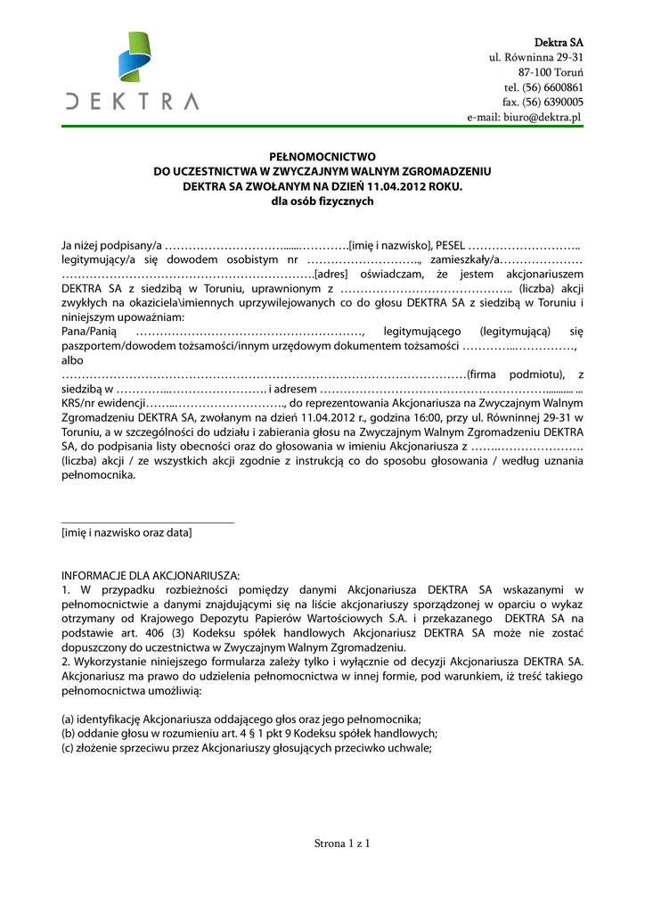 Dektra SA ul. Równinna 29-31 87-100 Toruń tel. (56) 6600861 fax. (56) 6390005 e-mail: [email protected] PEŁNOMOCNICTWO DO UCZESTNICTWA W ZWYCZAJNYM WALNYM ZGROMADZENIU DEKTRA SA ZWOŁANYM NA DZIEŃ 11.04.2012 ROKU. dla osób fizycznych Ja niżej podpisany/a …………………………......………….[imię i nazwisko], PESEL ……………………….. legitymujący/a się dowodem osobistym nr ……………………….., zamieszkały/a………………… ……………………………………………………….[adres] oświadczam, że jestem akcjonariuszem DEKTRA SA z siedzibą w Toruniu, uprawnionym z …………………………………….. (liczba) akcji zwykłych na okaziciela\imiennych uprzywilejowanych co do głosu DEKTRA SA z siedzibą w Toruniu i niniejszym upoważniam: Pana/Panią …………………………………………………, legitymującego (legitymującą) się paszportem/dowodem tożsamości/innym urzędowym dokumentem tożsamości …………..……………, albo …………………………………………………………………………………………(firma podmiotu), z siedzibą w …………..……………………. i adresem …………………………………………………........... ... KRS/nr ewidencji……..………………………., do reprezentowania Akcjonariusza na Zwyczajnym Walnym Zgromadzeniu DEKTRA SA, zwołanym na dzień 11.04.2012 r., godzina 16:00, przy ul. Równinnej 29-31 w Toruniu, a w szczególności do udziału i zabierania głosu na Zwyczajnym Walnym Zgromadzeniu DEKTRA SA, do podpisania listy obecności oraz do głosowania w imieniu Akcjonariusza z …….…………………. (liczba) akcji / ze wszystkich akcji zgodnie z instrukcją co do sposobu głosowania / według uznania pełnomocnika. _____________________________ [imię i nazwisko oraz data] INFORMACJE DLA AKCJONARIUSZA: 1. W przypadku rozbieżności pomiędzy danymi Akcjonariusza DEKTRA SA wskazanymi w pełnomocnictwie a danymi znajdującymi się na liście akcjonariuszy sporządzonej w oparciu o wykaz otrzymany od Krajowego Depozytu Papierów Wartościowych S.A. i przekazanego DEKTRA SA na podstawie art. 406 (3) Kodeksu spółek handlowych Akcjonariusz DEKTRA SA może nie zostać dopuszczony do uczestnictwa w Zwyczajnym Walnym Zgromadzeniu. 2. Wykorzystanie niniejszego formularza zależy tylko i wyłącznie od decyzji Akcjonariusza DEKTRA SA. Akcjonariusz ma prawo do udzielenia pełnomocnictwa w innej formie, pod warunkiem, iż treść takiego pełnomocnictwa umożliwią: (a) identyfikację Akcjonariusza oddającego głos oraz jego pełnomocnika; (b) oddanie głosu w rozumieniu art. 4 § 1 pkt 9 Kodeksu spółek handlowych; (c) złożenie sprzeciwu przez Akcjonariuszy głosujących przeciwko uchwale; Strona 1 z 1