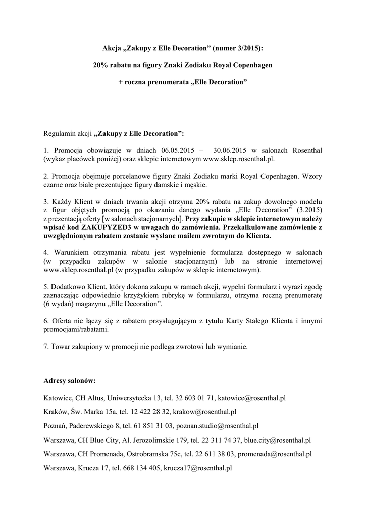 Akcja „Zakupy z Elle Decoration” (numer 3/2015): 20% rabatu na figury Znaki Zodiaku Royal Copenhagen + roczna prenumerata „Elle Decoration” Regulamin akcji „Zakupy z Elle Decoration”: 1. Promocja obowiązuje w dniach 06.05.2015 – 30.06.2015 w salonach Rosenthal (wykaz placówek poniżej) oraz sklepie internetowym www.sklep.rosenthal.pl. 2. Promocja obejmuje porcelanowe figury Znaki Zodiaku marki Royal Copenhagen. Wzory czarne oraz białe prezentujące figury damskie i męskie. 3. Każdy Klient w dniach trwania akcji otrzyma 20% rabatu na zakup dowolnego modelu z figur objętych promocją po okazaniu danego wydania „Elle Decoration” (3.2015) z prezentacją oferty [w salonach stacjonarnych]. Przy zakupie w sklepie internetowym należy wpisać kod ZAKUPYZED3 w uwagach do zamówienia. Przekalkulowane zamówienie z uwzględnionym rabatem zostanie wysłane mailem zwrotnym do Klienta. 4. Warunkiem otrzymania rabatu jest wypełnienie formularza dostępnego w salonach (w przypadku zakupów w salonie stacjonarnym) lub na stronie internetowej www.sklep.rosenthal.pl (w przypadku zakupów w sklepie internetowym). 5. Dodatkowo Klient, który dokona zakupu w ramach akcji, wypełni formularz i wyrazi zgodę zaznaczając odpowiednio krzyżykiem rubrykę w formularzu, otrzyma roczną prenumeratę (6 wydań) magazynu „Elle Decoration”. 6. Oferta nie łączy się z rabatem przysługującym z tytułu Karty Stałego Klienta i innymi promocjami/rabatami. 7. Towar zakupiony w promocji nie podlega zwrotowi lub wymianie. Adresy salonów: Katowice, CH Altus, Uniwersytecka 13, tel. 32 603 01 71, [email protected] Kraków, Św. Marka 15a, tel. 12 422 28 32, [email protected] Poznań, Paderewskiego 8, tel. 61 851 31 03, [email protected] Warszawa, CH Blue City, Al. Jerozolimskie 179, tel. 22 311 74 37, [email protected] Warszawa, CH Promenada, Ostrobramska 75c, tel. 22 611 38 03, [email protected] Warszawa, Krucza 17, tel. 668 134 405, [email protected] Białystok, CH Alfa, Świętojańska 15, tel. 85 741 11 60, [email protected] Gdańsk, CH Galeria Bałtycka, Al. Grunwaldzka 141, tel. 510 156 088, [email protected] Gdynia, CH Riviera, Kazimierza Górskiego 2, tel. 500-692-756, [email protected] Lublin, Krakowskie Przedmieście 58, tel. 81 525 29 73, [email protected] Łódź, CH Manufaktura, Karskiego 5, tel. 42 630 99 10, [email protected] Rybnik, Rynek 11, tel. 32 422 36 77, [email protected] Wrocław, pl. T. Kościuszki 2, tel. 71 343 36 16, [email protected] Rzeszów, 3 Maja 1, tel. 17 859 30 12, [email protected] Zielona Góra, Stary Rynek 24/1, tel. 68 320 26 35, [email protected] Bydgoszcz, Długa 26, tel. 52 345 41 34 Szczecin, Ks. Bogusława 14/2A, tel. 91 434 16 80 Szczecin, CH Kaskada, Al. Niepodległości 36, tel. 91 810 22 09 Toruń, CH PDT Dom Towarowy, Rynek Staromiejski 36/38, tel. 56 652 22 00 Opole, (MiD) Salon Rosenthal, Rynek 15c/1, tel. 77 43 10 264 Kalisz, Staszica 23, tel. 62 764 64 88 Kielce, Ambiente, Sienkiewicza 4c, tel. 41 344 66 49 Olsztyn, Ellaart, Warszawska 2, tel. 89 527 53 44 Gorzów Wlkp., Spichrzowa 6, tel. 95 720 00 18 Poznań, 30.04.2015r.