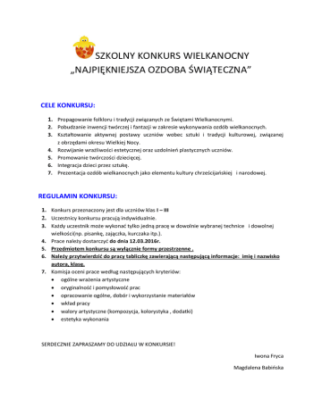 SZKOLNY KONKURS WIELKANOCNY „NAJPIĘKNIEJSZA OZDOBA ŚWIĄTECZNA” CELE KONKURSU: 1. Propagowanie folkloru i tradycji związanych ze Świętami Wielkanocnymi. 2. Pobudzanie inwencji twórczej i fantazji w zakresie wykonywania ozdób wielkanocnych. 3. Kształtowanie aktywnej postawy uczniów wobec sztuki i tradycji kulturowej, związanej z obrzędami okresu Wielkiej Nocy. 4. Rozwijanie wrażliwości estetycznej oraz uzdolnień plastycznych uczniów. 5. Promowanie twórczości dziecięcej. 6. Integracja dzieci przez sztukę. 7. Prezentacja ozdób wielkanocnych jako elementu kultury chrześcijańskiej i narodowej. REGULAMIN KONKURSU: 1. Konkurs przeznaczony jest dla uczniów klas I – III 2. Uczestnicy konkursu pracują indywidualnie. 3. Każdy uczestnik może wykonać tylko jedną pracę w dowolnie wybranej technice i dowolnej wielkości(np. pisankę, zajączka, kurczaka itp.). 4. Prace należy dostarczyć do dnia 12.03.2016r. 5. Przedmiotem konkursu są wyłącznie formy przestrzenne . 6. Należy przytwierdzić do pracy tabliczkę zawierającą następującą informacje: imię i nazwisko autora, klasę. 7. Komisja oceni prace według następujących kryteriów: ogólne wrażenia artystyczne oryginalność i pomysłowość prac opracowanie ogólne, dobór i wykorzystanie materiałów wkład pracy walory artystyczne (kompozycja, kolorystyka , dodatki) estetyka wykonania SERDECZNIE ZAPRASZAMY DO UDZIAŁU W KONKURSIE! Iwona Fryca Magdalena Babińska