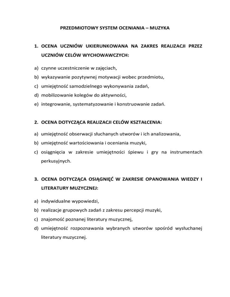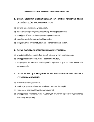 PRZEDMIOTOWY SYSTEM OCENIANIA – MUZYKA 1. OCENA UCZNIÓW UKIERUNKOWANA NA ZAKRES REALIZACJI PRZEZ UCZNIÓW CELÓW WYCHOWAWCZYCH: a) czynne uczestniczenie w zajęciach, b) wykazywanie pozytywnej motywacji wobec przedmiotu, c) umiejętność samodzielnego wykonywania zadań, d) mobilizowanie kolegów do aktywności, e) integrowanie, systematyzowanie i konstruowanie zadań. 2. OCENA DOTYCZĄCA REALIZACJI CELÓW KSZTAŁCENIA: a) umiejętność obserwacji słuchanych utworów i ich analizowania, b) umiejętność wartościowania i oceniania muzyki, c) osiągnięcia w zakresie umiejętności śpiewu i gry na instrumentach perkusyjnych. 3. OCENA DOTYCZĄCA OSIĄGNIĘĆ W ZAKRESIE OPANOWANIA WIEDZY I LITERATURY MUZYCZNEJ: a) indywidualne wypowiedzi, b) realizacje grupowych zadań z zakresu percepcji muzyki, c) znajomość poznanej literatury muzycznej, d) umiejętność rozpoznawania wybranych utworów spośród wysłuchanej literatury muzycznej. Sposoby sprawdzania umiejętności i wiadomości uczniów. I. Sprawdzanie opanowania melodii i tekstu piosenek poprzez: 1. Śpiewanie solo piosenki lub jej fragmentu 2. Śpiewanie w małych grupach, utworzonych z dwóch do czterech uczniów zdolniejszych i mniej zdolnych Szczegółowe kryteria oceny śpiewu ucznia: Ocena - celujący: Ocena - bardzo dobry: Ocena - dobry: Ocena - dostateczny: Ocena - dopuszczający: śpiew solo na pamięć, intonacja bezbłędna śpiew solo, na pamięć, pojedyncze, przypadkowe, nieprecyzyjnie zaśpiewane dźwięki śpiew w grupach 2 osobowych, na ogół utrzymywanie się w tonacji, ale rozchwiane interwały śpiew w grupach 3-4 osobowych, liczne zmiany tonacji, chwiejne interwały utrzymywanie jedynie konturu melodii UWAGA ! Chęć śpiewania gwarantuje uczniowi ocenę dopuszczającą. II. Sprawdzanie zakresu opanowanej wiedzy o muzyce poprzez: 1. Wypowiedzi uczniów w trakcie dyskusji oraz w związku ze słuchaniem muzyki 2. Sprawdziany wiadomości – po zrealizowaniu materiału z każdej epoki. 3. Muzyczne ćwiczenia, zagadki, quizy, rebusy 4. Samodzielną pracę uczniów, np. przygotowanie materiałów do określonego tematu lekcji III. Ocena z muzyki uwzględnia także udział ucznia w: 1. Muzycznych zajęciach pozalekcyjnych - aktywne i systematyczne uczestnictwo w zajęciach muzycznych gwarantuje uczniowi cząstkową ocenę celującą i może znacząco wpłynąć na ocenę z przedmiotu. 2. Programach artystycznych szkolnych uroczystości - występy zespołowe i solowe 3. Umiejętność gry na dowolnym instrumencie muzycznym gwarantują uczniowi cząstkową ocenę celującą i mogą znacząco wpłynąć na ocenę z przedmiotu. POZIOM WYMAGAŃ POZIOM Konieczny Podstawowy Rozszerzający Dopełniający Wykraczający (poza treści programowe) OCENA Dopuszczająca Dostateczna Dobra Bardzo dobra Celująca Ocenę celującą otrzymuje uczeń, który: 1. Czynnie uczestniczy w zajęciach, wykazuje pozytywną motywację wobec stawianych zadań i aktywną postawę podczas lekcji; 2. Potrafi bez pomocy nauczyciela zaśpiewać bezbłędnie pod względem muzycznym pieśni jedno i dwugłosowe; 3. Potrafi rozpoznać i określać style muzyczne 4. Ma wiedzę z historii muzyki, wykraczającą poza treści nauczania; 5. Rozpoznaje brzmienia instrumentów i rodzaje zespołów wykonawczych; 6. Rozpoznaje utwory z poznanej literatury muzycznej ( obowiązkowej i nadobowiązkowej); 7. Rozpoznaje polskie tańce ludowe oraz folklor innych narodów; 8. Osiąga sukcesy w konkursach, przeglądach, festiwalach muzycznych, lub posiada inne porównywalne osiągnięcia, uczestniczy w zajęciach chóru szkolnego i koncertów muzycznych organizowanych na terenie szkoły i poza nią. 9. Uczestniczy w koncertach muzycznych i przedstawia przynajmniej jedną recenzję koncertu w semestrze. 10. Aktywnie i systematycznie uczestniczy w zajęciach muzycznych. Ocenę bardzo dobrą otrzymuje uczeń, który: 1. Czynnie uczestniczy w zajęciach, wykazuje pozytywną motywację wobec stawianych zadań i aktywną postawę podczas lekcji. 2. Potrafi bez pomocy nauczyciela zaśpiewać poprawnie pod względem muzycznym pieśni jednogłosowe; 3. Posługuje się zapisem nutowym ; 4. Rozpoznaje utwory literatury obowiązkowej; 5. Opanował wiedzę z historii muzyki określoną programem nauczania; 6. Rozpoznaje podstawowe instrumenty; 7. Rozpoznaje polskie tańce ludowe i narodowe; Ocenę dobrą otrzymuje uczeń, który: 1. Czynnie uczestniczy w zajęciach, wykazuje pozytywną postawę wobec stawianych zadań i aktywną postawę podczas lekcji; 2. Potrafi przy pomocy nauczyciela zaśpiewać poprawnie pod względem muzycznym pieśni jednogłosowe; 3. Rozpoznaje niektóre utwory literatury obowiązkowej; 4. Opanował podstawową wiedzę z historii muzyki; 5. Rozpoznaje niektóre instrumenty muzyczne; 6. Rozpoznaje polskie tańce narodowe. Ocenę dostateczną otrzymuje uczeń, który: 1. Czynnie uczestniczy w zajęciach, wykazuje pozytywną postawę wobec stawianych mu zadań i aktywną postawę podczas lekcji; 2. Potrafi przy pomocy nauczyciela zaśpiewać kilka pieśni, utrzymując tonację i rytm; 3. Opanował podstawowe wiadomości z historii muzyki; 4. Rozpoznaje niektóre motywy muzyczne z twórczości słynnych kompozytorów; 5. Rozpoznaje brzmienia niektórych instrumentów muzycznych; 6. Rozpoznaje niektóre polski tańce ludowe (narodowe). Ocenę dopuszczającą otrzymuje uczeń, który: 1. Czynnie uczestniczy w zajęciach, wykazuje pozytywną postawę wobec stawianych ma zadań i aktywną postawę podczas lekcji; 2. Potrafi, korzystając z pomocy nauczyciela, zaśpiewać kilka łatwych piosenek; 3. Opanował w ograniczonym zakresie wiedzę z historii muzyki. Ocenę niedostateczną otrzymuje uczeń, który: 1. Pomimo starań nauczyciela nie przejawiał zainteresowania przedmiotem oraz żadnej aktywności na lekcjach muzyki; l 2. Nie opanował żadnych umiejętności muzycznych; 3. Nie potrafi, nawet przy pomocy nauczyciela, zaśpiewać żadnej piosenki; 4. Nie o