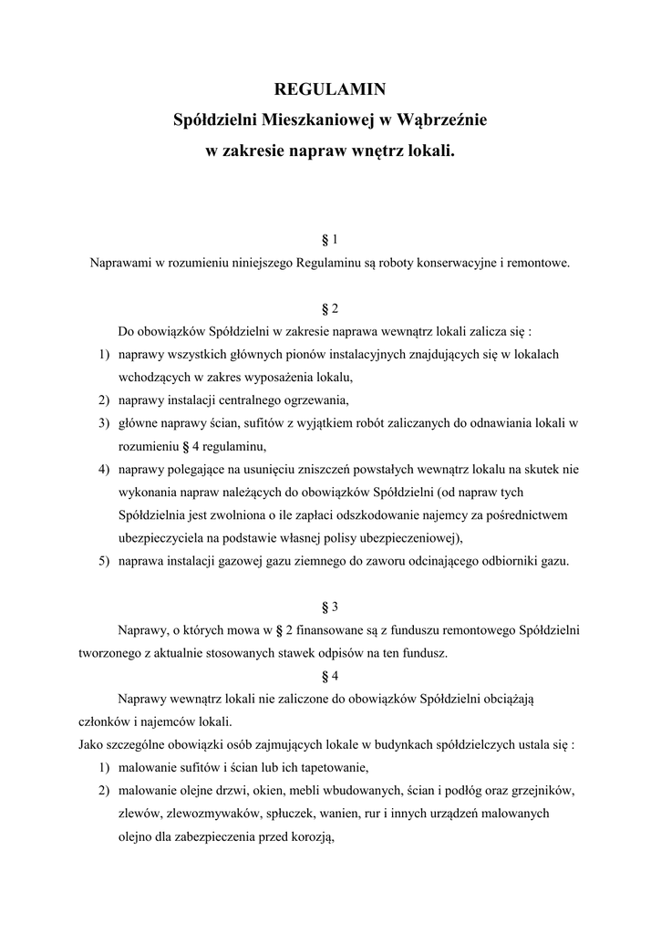 REGULAMIN Spółdzielni Mieszkaniowej w Wąbrzeźnie w zakresie napraw wnętrz lokali. §1 Naprawami w rozumieniu niniejszego Regulaminu są roboty konserwacyjne i remontowe. §2 Do obowiązków Spółdzielni w zakresie naprawa wewnątrz lokali zalicza się : 1) naprawy wszystkich głównych pionów instalacyjnych znajdujących się w lokalach wchodzących w zakres wyposażenia lokalu, 2) naprawy instalacji centralnego ogrzewania, 3) główne naprawy ścian, sufitów z wyjątkiem robót zaliczanych do odnawiania lokali w rozumieniu § 4 regulaminu, 4) naprawy polegające na usunięciu zniszczeń powstałych wewnątrz lokalu na skutek nie wykonania napraw należących do obowiązków Spółdzielni (od napraw tych Spółdzielnia jest zwolniona o ile zapłaci odszkodowanie najemcy za pośrednictwem ubezpieczyciela na podstawie własnej polisy ubezpieczeniowej), 5) naprawa instalacji gazowej gazu ziemnego do zaworu odcinającego odbiorniki gazu. §3 Naprawy, o których mowa w § 2 finansowane są z funduszu remontowego Spółdzielni tworzonego z aktualnie stosowanych stawek odpisów na ten fundusz. §4 Naprawy wewnątrz lokali nie zaliczone do obowiązków Spółdzielni obciążają członków i najemców lokali. Jako szczególne obowiązki osób zajmujących lokale w budynkach spółdzielczych ustala się : 1) malowanie sufitów i ścian lub ich tapetowanie, 2) malowanie olejne drzwi, okien, mebli wbudowanych, ścian i podłóg oraz grzejników, zlewów, zlewozmywaków, spłuczek, wanien, rur i innych urządzeń malowanych olejno dla zabezpieczenia przed korozją, 2 3) naprawy i wymiana urządzeń techniczno- sanitarnych : a) instalacja CO – wymiana zaworu termostatycznego ; b) instalacja kanalizacyjno- wodociągowa : - naprawa i wymiana spłuczki oraz muszli ustępowej, - wymiana umywalki i zlewozmywaka, - wymiana wanny, - naprawa i wymiana baterii, - zapewnienie drożności przewodów odpływowych do pionu głównego, - legalizacja i wymiana wodomierzy oraz odpowiedzialność za naruszenie plomb na wodomierzach ; c) instalacja elektryczna : - wymiana osprzętu (gniazda, wyłączniki, lampy), - wymiana i naprawa wewnętrznej instalacji do zabezpieczenia przedlicznikowego, - wymiana zabezpieczenia mieszkaniowego i przedlicznikowego wraz z pełną odpowiedzialnością plomb na licznikach i zabezpieczeniach ; d) instalacja gazu płynnego : - wymiana reduktora, - wymiana węża łączącego odbiornik, - naprawa lub wymiana kuchenki gazowej ; e) instalacja gazu ziemnego : - prawidłowa eksploatacja urządzeń (piec dwufunkcyjny, kuchenka), - wykonywanie przeglądów gwarancyjnych i pogwarancyjnych pieców gazowych dwufunkcyjnych, - wykonywanie napraw urządzeń gazowych będących na wyposażeniu mieszkania. 4) właściwe dla rodzaju podłóg ich eksploatowanie, konserwowanie i utrzymanie wyglądu estetyczno – użytkowego. §5 Wszelkie uszkodzenia wewnątrz lokalu oraz poza nim powstałe z winy członka lub jego domowników obciążają członka Spółdzielni. 3 §6 Naprawy wewnątrz lokalu zaliczane do obowiązków członka mogą być wykonane przez Spółdzielnię na indywidualne zlecenie członka i tylko za odpłatnością poza normalnymi opłatami czynszowymi za używanie lokalu. §7 W odniesieniu do najemców lokali użytkowych w budynkach spółdzielczych stosuje się podział napraw wnętrz lokali na obciążające Spółdzielnię oraz najemców, zgodnie z umową najmu zawartą z poszczególnym najemcą lokalu. §8 1. W razie awarii wywołującej szkodę lub zagrażającej bezpośrednio powstaniem szkody, osoba korzystająca z lokalu jest obowiązana niezwłocznie udostępnić lokal w celu usunięcia awarii. Jeżeli osoba ta jest nieobecna w mieszkaniu lub odmawia udostępnienia lokalu, Spółdzielnia ma prawo wejść do lokalu w obecności funkcjonariusza Policji a gdy wymaga to pomocy Straży Pożarnej - także przy jej udziale. 2. Jeżeli otwarcie lokalu nastąpiło pod nieobecność pełnoletniej osoby Spółdzielnia jest obowiązana zabezpieczyć lokal i znajdujące się w nim rzeczy do czasu przybycia osoby pełnoletniej zamieszkałej w lokalu. 3. Ponadto użytkownicy mieszkań obowiązani są do udostępnienia przedstawicielom Spółdzielni lokali w celu: - dokonania okresowego bądź doraźnego przeglądu stanu wyposażenia technicznego lokalu oraz ustalenia zakresu niezbędnych prac i ich wykonania ; - zastępczego wykonania przez Spółdzielnię prac obciążających członka Spółdzielni ; - zainstalowania w lokalu urządzeń pomiarowych i podzielnikowych, kontroli stanu tych urządzeń oraz odczytu wskazań tych urządzeń. 4. Jeżeli lokal lub budynek wymaga remontu obciążającego Spółdzielnię, przebudowy lub przeprowadzenia modernizacji Spółdzielnia żąda od osób korzystających z tego lokalu lub budynku jego udostępnienia w celu wykonania koniecznych robót. 4 §9 1. Niniejszy regulamin został zatwierdzony przez Radę Nadzorczą Uchwałą Nr 2/2004 na posiedzeniu w dniu 29.01.2004r. i wchodzi w życie z dniem podjęcia. 2. Uchyla się pełne brzmienie Regulaminu w zakresie napraw wnętrz lokali oraz rozliczeń Spółdzielni z członkami i najemcami zwalniającymi lokale z dnia 26.09.1996r. SEKRETARZ RADY NADZORCZEJ PRZEWODNICZĄCY RADY NADZORCZEJ 5 REGULAMIN Spółdzielni Mieszkaniowej w Wąbrzeźnie w zakresie napraw wnętrz lokali. §1 Naprawami w rozumieniu niniejszego Regulaminu są roboty konserwacyjne i remontowe. I. OBOWIĄZKI SPÓŁDZIELNI W ZAKRESIE NAPRAW WNĘTRZ LOKALI. §2 1. Podstawowy zakres obowiązków spółdzielni w dziedzinie napraw wnętrz lokali obejmuje naprawy i wymiany wewnętrznej instalacji wodociągowej , gazowej i ciepłej wody – bez urządzeń odbiorczych a także naprawy i wymiany wewnętrznej instalacji kanalizacyjnej , centralnego ogrzewania wraz z grzejnikami , instalacji elektrycznej oraz anteny zbiorczej z wyjątkiem osprzętu. 2. Ponadto naprawami należącymi do spółdzielni są : - główne naprawy ścian , sufitów 