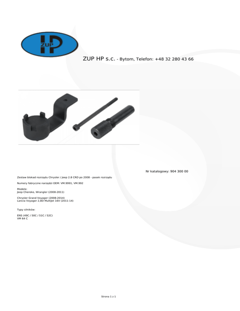 ZUP HP s.c. - Bytom, Telefon: +48 32 280 43 66 Nr katalogowy: 904 300 00 Zestaw blokad rozrządu Chrysler / Jeep 2.8 CRD po 2008 - pasek rozrządu Numery fabryczne narzędzi OEM: VM.9991, VM.992 Modele: Jeep Cheroke, Wrangler (2008-2011) Chrysler Grand Voyager (2008-2014) Lancia Voyager 2,8D MultiJet 16V (2011-14) Typy silników: ENS (49C / 50C / 51C / 52C) VM 64 C Strona 1 z 1