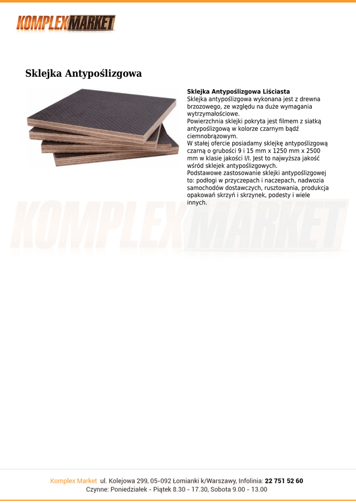 Sklejka Antypoślizgowa Sklejka Antypoślizgowa Liściasta Sklejka antypoślizgowa wykonana jest z drewna brzozowego, ze względu na duże wymagania wytrzymałościowe. Powierzchnia sklejki pokryta jest filmem z siatką antypoślizgową w kolorze czarnym bądź ciemnobrązowym. W stałej ofercie posiadamy sklejkę antypoślizgową czarną o grubości 9 i 15 mm x 1250 mm x 2500 mm w klasie jakości I/I. Jest to najwyższa jakość wśród sklejek antypoślizgowych. Podstawowe zastosowanie sklejki antypoślizgowej to: podłogi w przyczepach i naczepach, nadwozia samochodów dostawczych, rusztowania, produkcja opakowań skrzyń i skrzynek, podesty i wiele innych. Wymiary/ceny 9mm x 1250mm x 2500mm 15mm x 1250mm x 2500mm