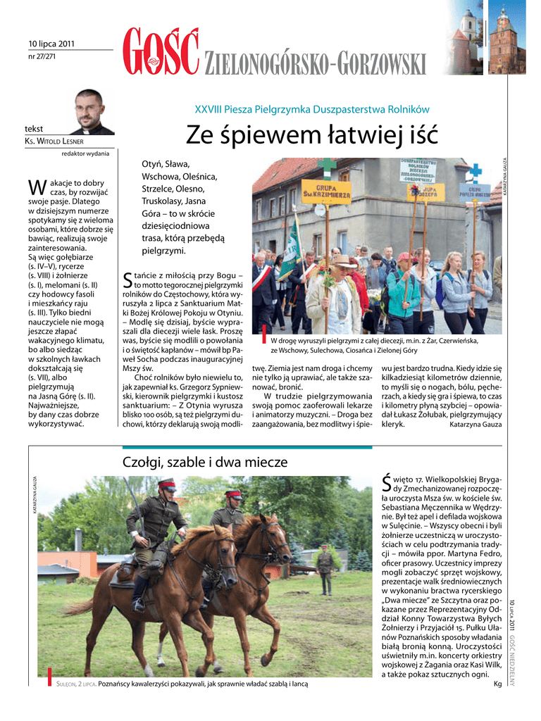 10 lipca 2011 nr 27/271 XXVIII Piesza Pielgrzymka Duszpasterstwa Rolników redaktor wydania Otyń, Sława, Wschowa, Oleśnica, Strzelce, Olesno, Truskolasy, Jasna Góra – to w skrócie dziesięciodniowa trasa, którą przebędą pielgrzymi. W akacje to dobry czas, by rozwijać swoje pasje. Dlatego w dzisiejszym numerze spotykamy się z wieloma osobami, które dobrze się bawiąc, realizują swoje zainteresowania. Są więc gołębiarze (s. IV–V), rycerze (s. VIII) i żołnierze (s. I), melomani (s. II) czy hodowcy fasoli i mieszkańcy raju (s. III). Tylko biedni nauczyciele nie mogą jeszcze złapać wakacyjnego klimatu, bo albo siedząc w szkolnych ławkach dokształcają się (s. VII), albo pielgrzymują na Jasną Górę (s. II). Najważniejsze, by dany czas dobrze wykorzystywać. Katarzyna Gauza Ze śpiewem łatwiej iść tekst Ks. Witold Lesner S tańcie z miłością przy Bogu – to motto tegorocznej pielgrzymki rolników do Częstochowy, która wyruszyła 2 lipca z Sanktuarium Matki Bożej Królowej Pokoju w Otyniu. – Modlę się dzisiaj, byście wypraszali dla diecezji wiele łask. Proszę was, byście się modlili o powołania i o świętość kapłanów – mówił bp Paweł Socha podczas inauguracyjnej Mszy św. Choć rolników było niewielu to, jak zapewniał ks. Grzegorz Sypniewski, kierownik pielgrzymki i kustosz sanktuarium: – Z Otynia wyrusza blisko 100 osób, są też pielgrzymi duchowi, którzy deklarują swoją modli- W drogę wyruszyli pielgrzymi z całej diecezji, m.in. z Żar, Czerwieńska, ze Wschowy, Sulechowa, Ciosańca i Zielonej Góry twę. Ziemia jest nam droga i chcemy nie tylko ją uprawiać, ale także szanować, bronić. W trudzie pielgrzymowania swoją pomoc zaoferowali lekarze i animatorzy muzyczni. – Droga bez zaangażowania, bez modlitwy i śpie- Czołgi, szable i dwa miecze wu jest bardzo trudna. Kiedy idzie się kilkadziesiąt kilometrów dziennie, to myśli się o nogach, bólu, pęcherzach, a kiedy się gra i śpiewa, to czas i kilometry płyną szybciej – opowiadał Łukasz Żołubak, pielgrzymujący kleryk. Katarzyna Gauza Ś Katarzyna Gauza Sulęcin, 2 lipca. Poznańscy kawalerzyści pokazywali, jak sprawnie władać szablą i lancą Kg 10 lipca 2011 Gość Niedzielny więto 17. Wielkopolskiej Brygady Zmechanizowanej rozpoczęła uroczysta Msza św. w kościele św. Sebastiana Męczennika w Wędrzynie. Był też apel i defilada wojskowa w Sulęcinie. – Wszyscy obecni i byli żołnierze uczestniczą w uroczystościach w celu podtrzymania tradycji – mówiła ppor. Martyna Fedro, oficer prasowy. Uczestnicy imprezy mogli zobaczyć sprzęt wojskowy, prezentacje walk średniowiecznych w wykonaniu bractwa rycerskiego „Dwa miecze” ze Szczytna oraz pokazane przez Reprezentacyjny Oddział Konny Towarzystwa Byłych Żołnierzy i Przyjaciół 15. Pułku Ułanów Poznańskich sposoby władania białą bronią konną. Uroczystości uświetniły m.in. koncerty orkiestry wojskowej z Żagania oraz Kasi Wilk, a także pokaz sztucznych ogni. gość zielonogórsko-gorzowski II gość zielonogórsko-gorzowski Organy, flet i barokowe solo Chłopaki odpoczywają w Paradyżu 44 nasionka Wakacje w Raju ks. Witold Lesner dzyrzeczu (kościół Jana Chrzciciela). – Pomyślałem, że miło będzie, kiedy słuchacze w Przytocznej zapoznają się z piękną i wartościową muzyką, graną na prawdziwych instrumentach. Tutaj takich koncertów jest mało i dlatego na tych ziemiach dopiero tworzymy razem kulturę muzyczną – mówił współorganizator Zdzisław Musiał. Oaza Dzieci Bożych w Rokitnie Katarzyna Gauza Przytoczna. Inauguracja Festiwalu Muzycznego „Letnie Koncerty Organowe 2011” odbyła się 3 lipca w kościele Trójcy Świętej. Utwory m.in. Bacha, Haendla, Masseneta zaprezentowali lubuscy artyści: Alina Kubik, Ludmiła Pawłowska, Rafał Jędrzejewski i Zdzisław Musiał. Kolejne dwa koncerty odbędą się: 9 lipca w Skwierzynie (parafia św. Mikołaja) oraz 10 lipca w Mię- Święto filmowego miasta kg Wycieczki rowerowe, spływy kajakowe, codzienna modlitwa, pielgrzymka do Rokitna – to główne atrakcje ośmiodniowego wypoczynku. Wdzięczność z trud Elżbieta Grudzińska miłości – mówił 1 lipca podczas Apelu Jasnogórskiego bp Edward Dajczak, delegat KEP ds. Krajowego Duszpasterstwa Nauczycieli. Centralnym punktem pielgrzymki była sobotnia Msza św., której przewodniczył bp bielsko-żywiecki Tadeusz Rakoczy. Powiedział on m.in.: – Zazwyczaj spotykacie się z wymaganiami, coraz częściej z niesprawiedliwą krytyką i małą wdzięcznością. Przyjmijcie, więc dzisiaj od nas najserdeczniejsze podziękowanie i uznanie. wl 1 lipca w Sali o. Kordeckiego odbyło się X Ogólnopolskie Nauczycielskie Sympozjum. Wśród słuchających był ks. Jan Pawlak, duszpasterz zielonogórskich nauczycieli Pod okiem Maryi, przez 15 dni pielęgnowali kiełkującą wiarę. W Zmarł sąsiad i przyjaciel B erlin . Po długiej chorobie 30 czerwca w wieku 75 lat zmarł kard. Georg Maximilian Sterzinsky (na zdjęciu). – Kilkakrotnie odwiedzał sanktuarium w Rokitnie. Był m.in. na uroczystości 20-lecia koronacji obrazu Matki Bożej Cierpliwie Słuchającej. Można powiedzieć, że był zaprzyjaźniony z naszą diecezją – powiedział GN bp Stefan Regmunt. Kard. Sterzinsky odwiedzał nasze sanktuarium również prywatnie. Urodził się w 1936 r. w Worlawkach (dawniej Warlack) na Warmii. Po wojnie jego rodzina osiedliła się w Turyngii. W 1960 r. przyjął święcenia kapłańskie w Erfurcie. W latach 1981–1989 był wikariuszem generalnym diecezji Erfurt–Meiningen, a w 1989 r. został mianowany biskupem podzielonego jeszcze wówczas Berlina. W 1991 r. Jan Paweł II wyniósł go do godności kardynalskiej, a w czerwcu 1994 r. mianował metropolitą Berlina, którym był do stycznia 2011 r. wl [email protected] Adres redakcji: 65-075 Zielona Góra pl. Powstańców Wielkopolskich 2 Telefon (68) 411 02 54 Redagują: ks. Witold Lesner –