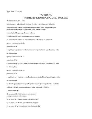 Sygn. akt II Ca 180/14 WYROK W IMIENIU RZECZYPOSPOLITEJ POLSKIEJ Dnia 12 czerwca 2014 roku Sąd Okręgowy w Lublinie II Wydział Cywilny - Odwoławczy w składzie: Przewodniczący Sędzia Sądu Okręgowego Dariusz Iskra (sprawozdawca) Sędziowie: Sędzia Sądu Okręgowego Anna Ścioch - Kozak Sędzia Sądu Okręgowego Tomasz Lebowa Protokolant Sekretarz sądowy Katarzyna Gustaw po rozpoznaniu w dniu 29 maja 2014 roku w Lublinie, na rozprawie sprawy z powództwa M. C. przeciwko S. W. o zapłatę kwoty 7500 zł z odsetkami ustawowymi od dnia l grudnia 2011 roku do dnia zapłaty sprawy z powództwa K. C. przeciwko S. W. o zapłatę kwoty 7500 zł z odsetkami ustawowymi od dnia l grudnia 2011 roku do dnia zapłaty sprawy z powództwa R. W. przeciwko S. W. o zapłatę kwoty 15000 zł z odsetkami ustawowymi od dnia l grudnia 2011 roku do dnia zapłaty na skutek apelacji pozwanego od wyroku Sądu Rejonowego Lublin - zachód w Lublinie z dnia 21 października 2013 roku, w sprawie I C 68/12 I. oddala apelację; II. zasądza od S. W. tytułem zwrotu kosztów postępowania odwoławczego: 1) na rzecz M. C. kwotę 300 zł (trzysta złotych), 2) na rzecz K. C. kwotę 300 zł (trzysta złotych) 3) na rzecz R. W. kwotę 600 zł (sześćset złotych). Sygn. akt II Ca 180/14 UZASADNIENIE Wyrokiem z dnia 21 października 2013 roku Sąd Rejonowy Lublin – Zachód w Lublinie orzekł, że: I. zasądza od S. W. na rzecz M. C. kwotę 6958,33 zł z odsetkami ustawowymi od dnia 22 października 2013 roku do dnia zapłaty; II. oddala powództwo M. C. w pozostałej części; III. zasądza od S. W. na rzecz M. C. kwotę 992 zł tytułem zwrotu kosztów procesu; IV. zasądza od S. W. na rzecz K. C. kwotę 6958,33 zł z odsetkami ustawowymi od dnia 22 października 2013 roku do dnia zapłaty; V. oddala powództwo K. C. w pozostałej części; VI. zasądza od S. W. na rzecz K. C. kwotę 992 zł tytułem zwrotu kosztów procesu; VII. zasądza od S. W. na rzecz R. W. kwotę 13916,67 zł z odsetkami ustawowymi od dnia 22 października 2013 roku do dnia zapłaty; VIII. oddala powództwo R. W. w pozostałej części; IX. zasądza od S. W. na rzecz R. W. kwotę 1967 zł tytułem zwrotu kosztów procesu; X. nakazuje pobranie od S. W. na rzecz Skarbu Państwa – Sądu Rejonowego Lublin – Zachód w Lublinie kwoty 238,60 zł tytułem nieuiszczonych w części kosztów sądowych. W uzasadnieniu wyroku Sąd Rejonowy ustalił, że prawomocnym postanowieniem z dnia 31 maja 2011 roku, wydanym w sprawie I Ns 981/11, Sąd Rejonowy Lublin – Zachód w Lublinie stwierdził, że spadek po zmarłej dnia 7 grudnia 2008 roku w L. i ostatnio stale tutaj zamieszkałej Z. W., na podstawie ustawy nabyły jej i S. dzieci: J. R., E. P., R. W., J. W. (1), S. W. po 1/6 części każde z nich oraz jej wnukowie: M. C., syn W. i A. i K. C., syn W. i A. po 1/12 części każdy z nich. Sąd ustalił, że Z. W. nie pozostawiła w spadku żadnego mienia o wymiernej wartości ekonomicznej. Do dnia 16 września 1986 roku Z. W. była współwłaścicielem w udziale wynoszącym 51040/136100 części nieruchomości rolnej o powierzchni 1,36 ha, położonej w L. przy obecnej ulicy (...), a drugim współwłaścicielem tej nieruchomości, w udziale wynoszącym 85070/136100, był jej mąż – S. W.. Z. W. była również do tej daty właścicielem zabudowanej parterowym murowanym budynkiem mieszkalnym oraz murowanym budynkiem gospodarczym i garażem nieruchomości o powierzchni 0,4948 ha, położonej przy Alei (...) w L.. W tym bowiem dniu Z. W. i jej mąż – S. W. zawarli z ich synem – S. W. umowę przekazania gospodarstwa rolnego za emeryturę, w drodze której przenieśli na jego rzecz własność obu tych nieruchomości, a S. W. ustanowił na ich rzecz osobistą służebność mieszkania w budynku mieszkalnym, prawo korzystania z budynków gospodarczych i prawo użytkowania gruntu o powierzchni 0,18 ha z działki przy Alei (...) w L.. Sąd Rejonowy ustalił, że S. W. i jego żona – Z. W. zobowiązali jednak ich syna – S. W., na co ten zgodził się, do podzielenia się przez niego z nimi i z pozostałymi ich dziećmi, czyli z E. P., A. C., J. W. (1), J. R. i R. W., w równych częściach, pieniędzmi uzyskanymi przez niego w razie zbycia otrzymanej nieruchomości. To zobowiązanie zostało sporządzone w formie pisemnej, a mąż Z. S. (...) polecił J. R., która była prawnikiem, aby dopilnowała wywiązania się przez jej brata – S. W. z tego zobowiązania. Sąd ustalił, że zawarcie przez S. W. i jego żonę – Z. W. z ich synem – S. W. umowy przekazania gospodarstwa rolnego było następstwem zamiaru uzyskania świadczeń emerytalnych oraz tego, że to właśnie ten ich syn miał wymagane w tym czasie kwalifikacje do nabycia własności gospodarstwa rolnego, to jest wydane na jego rzecz w dniu 24 października 1977 roku świadectwo wykwalifikowanego rolnika. Sąd ustalił, że w dniu 27 maja 1995 roku S. W. zbył na rzecz (...) Spółki z ograniczoną odpowiedzialnością w W., za cenę w kwocie 320000 zł, otrzymane przez niego wcześniej prawo własności zabudowanej nieruchomości przy Alei (...) w L.. Otrzymane w ten sposób pieniądze, ale w mniejszej kwocie (300000 zł), S. W. podzielił pomiędzy siebie i jego rodzeństwo, w częściach równych, to jest po 50000 zł, wykonując dobrowolnie swoje zobowiązanie podjęte przez niego w 1986 roku; jednak kwotę 20000 zł zatrzymał dla siebie, wskazując, że stanowi ona wartość zbudowanego przez niego drewnianego pomieszczenia sklepowego. Sąd ustalił, że w związku z tym, iż mieszkająca na tej nieruchomości Z. W. musiała ją opuścić, jej dzieci – J. R., S. W., E. P., R. W., J. W. (1) i A. C. wspólnie uzgodniły, że z uzyskanych z tytułu ceny pieniędzy każde z nich przeznaczy kwotę 10000 zł w celu zakupienia na jej rzecz prawa do mieszkania, w którym będzie ona mogła zamieszkać. To uzgodnienie zostało wprowadzone w czyn i w dniu 12 czerwca 1995 roku Z. W. na