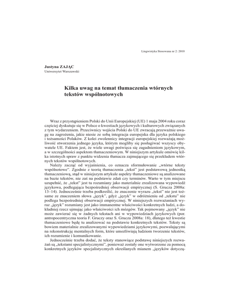 227 Lingwistyka Stosowana nr 2: 2010 Justyna ZAJĄC Uniwersytet Warszawski Kilka uwag na temat tłumaczenia wtórnych tekstów wspólnotowych Wraz z przystąpieniem Polski do Unii Europejskiej (UE) 1 maja 2004 roku coraz częściej dyskutuje się w Polsce o kwestiach językowych i kulturowych związanych z tym wydarzeniem. Przeciwnicy wejścia Polski do UE zwracają przeważnie uwagę na zagrożenia, jakie niesie ze sobą integracja europejska dla języka polskiego i tożsamości Polaków. Z kolei zwolennicy integracji europejskiej rozważają możliwość stworzenia jednego języka, którym mogliby się posługiwać wszyscy obywatele UE. Faktem jest, że wiele uwagi poświęca się zagadnieniom językowym, a w szczególności aspektom tłumaczeniowym. W niniejszym artykule omówię kilka istotnych spraw z punktu widzenia tłumacza zajmującego się przekładem wtórnych tekstów wspólnotowych. Należy zacząć od wyjaśnienia, co oznacza sformułowanie „wtórne teksty wspólnotowe”. Zgodnie z teorią tłumaczenia „tekst” jest podstawową jednostką tłumaczeniową, stąd w niniejszym artykule aspekty tłumaczeniowe są analizowane na bazie tekstów, nie zaś na podstawie zdań czy terminów. Warto w tym miejscu uzupełnić, że „tekst” jest tu rozumiany jako materialnie zrealizowana wypowiedź językowa, podlegająca bezpośredniej obserwacji empirycznej (S. Grucza 2008a: 13–14). Jednocześnie trzeba podkreślić, że znaczenie wyrazu „tekst” nie jest tożsame ze znaczeniem słowa „język”, gdyż „język” w odróżnieniu od „tekstu” nie podlega bezpośredniej obserwacji empirycznej. W niniejszych rozważaniach wyraz „język” rozumiany jest jako immanentne właściwości konkretnych ludzi, a dokładniej rzecz ujmując jako właściwości ich mózgów. Tak pojmowany „język” nie może zawierać się w żadnych tekstach ani w wypowiedziach językowych (por. antropocentryczna teoria F. Gruczy oraz S. Grucza 2008a: 18), dlatego też kwestie tłumaczeniowe będę tu analizować na podstawie konkretnych tekstów. Teksty są bowiem materialnie zrealizowanymi wypowiedziami językowymi, pozwalającymi na rekonstrukcję mentalnych form, które umożliwiają ludziom tworzenie tekstów, ich rozumienie i komunikowanie. Jednocześnie trzeba dodać, że teksty stanowiące podstawę niniejszych rozważań są „tekstami specjalistycznymi”, ponieważ zostały one wytworzone za pomocą konkretnych języków specjalistycznych określanych mianem „języków dotyczą- 228 JUSTYNA ZAJĄC cych europejskiej integracji i Unii Europejskiej” (F. Grucza 2004: 9 i nast.). Zanim przejdę do dalszych rozważań na temat wyrażenia „wtórne teksty wspólnotowe”, zasygnalizuję kilka istotnych aspektów odnośnie do „języków dotyczących europejskiej integracji i Unii Europejskiej”, gdyż spełniają one bardzo ważne funkcje nie tylko z punktu widzenia konkretnej grupy specjalistów, lecz również w wymiarze powszechnym (ibid.). Ponadto nabierają one i będą nabierały w przyszłości coraz większego znaczenia. Jak wspomniałam powyżej, „języki dotyczące europejskiej integracji i Unii Europejskiej” to języki specjalistyczne, tzn. są one immanentnymi właściwościami konkretnych specjalistów i w żadnym wypadku nie należy ich traktować jako byty autonomiczne. Jednocześnie należy podkreślić, że „języki dotyczące europejskiej integracji i Unii Europejskiej” nie są typowymi językami specjalistycznymi (F. Grucza 2002: 15 i nast.). Po pierwsze z uwagi na fakt, że europejska integracja i UE stanowią zakresy rzeczywistości decydujące o jakości życia wszystkich członków Wspólnot Europejskich, to należy traktować „języki dotyczące europejskiej integracji i Unii Europejskiej” nie tylko jako właściwości mózgów konkretnych specjalistów, lecz także jako właściwości mózgów obywateli UE. W związku z europejską integracją wiele państw członkowskich dostosowuje różne elementy swojego ustroju do wymogów UE. Z wprowadzanymi zmianami muszą być zaznajomieni obywatele poszczególnych państw, aby mogli możliwie najpełniej korzystać z osiągnięć Wspólnot Europejskich. Oznacza to, że istniejące do tej pory narodowe języki specjalistyczne należy zastąpić nowymi, ponieważ tylko w „nowym języku” można opisać nowe jakości oraz mówić o nowej rzeczywistości. Języki „stare”, czyli języki „narodowe”, odwzorowują wyłącznie rzeczywistości narodowe, nacechowane bardzo mocno historycznie, i niemożliwe jest wiarygodne posługiwanie się nimi w odniesieniu do jakości europejskich. W momencie gdy „nowe” języki zostaną wykreowane, należy wprowadzić je do obiegu komunikacyjnego i upowszechnić umiejętność posługiwania się nimi (F. Grucza 2002: 25). Dodatkowo odpowiednie zmiany muszą nastąpić w mentalności, tożsamości i w postawie obywateli UE, gdyż język (specjalistyczny) istnieje zawsze w powiązaniu ze specyficzną kulturą, pragmatyką językową itp. Po drugie „języki dotyczące europejskiej integracji i Unii Europejskiej” są językami dynamicznymi, ponieważ odnoszą się one do aspektów rzeczywistości będących w nieustannym rozwoju. „Integracja europejska” jest pewnego rodzaju procesem i rozumiana w ten sposób znajduje się permanentnie w stanie rozwoju. Z kolei „Unia Europejska” to wytwór „integracji europejskiej” oraz warunek jej urzeczywistnienia (F. Grucza 2004: 18 i nast.). „Unia Europejska” może być też postrzegana jako instytucja, która stanowi konkretyzację „integracji europejskiej”. W związku z tym, że „integracja europejska” znajduje się nieustannie in statu nascendi, to również „Unia Europejska”, która jest nierozerwalnie związana z „integracją europejską”, musi być traktowania jako twór dynamiczny, co z kolei prowadzi do wniosku, że także „języki dotyczące europejskiej integracji i Unii Europejs