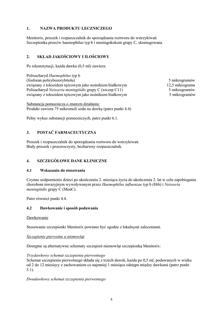 1. NAZWA PRODUKTU LECZNICZEGO Menitorix, proszek i rozpuszczalnik do sporządzania roztworu do wstrzykiwań Szczepionka przeciw haemophilus typ b i meningokokom grupy C, skoniugowana 2. SKŁAD JAKOŚCIOWY I ILOŚCIOWY Po rekonstytucji, każda dawka (0,5 ml) zawiera: Polisacharyd Haemophilus typ b (fosforan polirybozorybitolu) związany z toksoidem tężcowym jako nośnikiem białkowym Polisacharyd Neisseria meningitidis grupy C (szczep C11) związany z toksoidem tężcowym jako nośnikiem białkowym 5 mikrogramów 12,5 mikrograma 5 mikrogramów 5 mikrogramów Substancja pomocnicza o znanym działaniu: Produkt zawiera 75 mikromoli sodu na dawkę (patrz punkt 4.4) Pełny wykaz substancji pomocniczych, patrz punkt 6.1. 3. POSTAĆ FARMACEUTYCZNA Proszek i rozpuszczalnik do sporządzania roztworu do wstrzykiwań. Biały proszek i przezroczysty, bezbarwny rozpuszczalnik. 4. 4.1 SZCZEGÓŁOWE DANE KLINICZNE Wskazania do stosowania Czynne uodpornienie dzieci po ukończeniu 2. miesiąca życia do ukończenia 2. lat w celu zapobiegania chorobom inwazyjnym wywoływanym przez Haemophilus influenzae typ b (Hib) i Neisseria meningitidis grupy C (MenC). Patrz również punkt 4.4. 4.2 Dawkowanie i sposób podawania Dawkowanie Stosowanie szczepionki Menitorix powinno być zgodne z lokalnymi zaleceniami. Szczepienie pierwotne u niemowląt Dostępne są alternatywne schematy szczepień niemowląt szczepionką Menitorix: Trzydawkowy schemat szczepienia pierwotnego Schemat szczepienia pierwotnego składa się z trzech dawek, każda po 0,5 ml, podawanych w wieku od 2 do 12 miesięcy z zachowaniem co najmniej 1 miesiąca odstępu między dawkami (patrz punkt 5.1). Dwudawkowy schemat szczepienia pierwotnego 5 Schemat szczepienia pierwotnego składa się z dwóch dawek, każda po 0,5 ml, podawanych w wieku od 3 do 12 miesięcy z zachowaniem co najmniej 2 miesięcy odstępu między dawkami (patrz punkt 5.1). Wcześniaki (urodzone po 25-36 tygodniach ciąży) Schemat szczepienia pierwotnego składa się z trzech dawek, każda po 0,5 ml, podawanych w wieku od 2 do 12 miesięcy z zachowaniem co najmniej 2 miesięcy odstępu między dawkami (patrz punkt 5.1). Nie ma danych dotyczących stosowania w schemacie szczepienia pierwotnego jednej lub dwóch dawek szczepionki Menitorix i użycia innych skoniugowanych szczepionek zawierających Hib i (lub) MenC jako pozostałych dawek. Niemowlęta, którym w szczepieniu pierwotnym, jako pierwszą dawkę podano Menitorix powinny otrzymać tę szczepionkę również jako drugą i trzecią dawkę. Szczepienie przypominające: Dzieciom, u których zastosowano szczepienie pierwotne, należy podać szczepienie uzupełniające zawierające Hib i MenC. U dzieci, które jako niemowlęta, otrzymały w cyklu szczepienia pierwotnego skojarzoną bezkomórkową szczepionkę przeciw krztuścowi zawierającą Hib, szczepienie uzupełniające Hib należy przeprowadzić przed ukończeniem 2. roku życia. Jedna (0,5 ml) dawka szczepionki Menitorix może być podana jako szczepienie przypominające u dzieci, które ukończyły 3-dawkowy cykl szczepienia pierwotnego wykonanego szczepionką Menitorix lub inną skoniugowaną szczepionką przeciwko Hib i MenC (patrz punkt 5.1). Dawkę przypominającą szczepionki Menitorix należy podać przed ukończeniem 2. roku życia. Dawkę przypominającą należy podać po ukończeniu przez dziecko 12 miesięcy i co najmniej 6 miesięcy po ostatniej dawce szczepienia pierwotnego. U dzieci, które otrzymały dwie dawki szczepienia pierwotnego, dawkę przypominającą należy podać co najmniej 5 miesięcy po zakończeniu szczepienia pierwotnego. Dzieci i młodzież Nie ma danych dotyczących bezpieczeństwa i skuteczności stosowania szczepionki Menitorix u dzieci w wieku powyżej 2 lat. Sposób podawania Instrukcja dotycząca rekonstytucji produktu leczniczego przed podaniem, patrz punkt 6.6. Menitorix podaje się wyłącznie domięśniowo, najlepiej w przednio-boczną część uda. U dzieci w wieku od 12 do 24 miesięcy szczepionka może zostać podana w mięsień naramienny (patrz także punkty 4.4 i 4.5). Szczepionki Menitorix w żadnym wypadku nie wolno podawać donaczyniowo, śródskórnie lub podskórnie. 4.3 Przeciwwskazania Nadwrażliwość na substancje czynne, w tym toksoid tężcowy (patrz punkt 2), lub którąkolwiek substancję pomocniczą (wymienioną w punkcie 6.1). Reakcje nadwrażliwości po uprzednim podaniu szczepionki Menitorix. Ostre, ciężkie choroby z gorączką. Łagodne zakażenie nie jest przeciwwskazaniem do podania szczepionki Menitorix. 4.4 Specjalne ostrzeżenia i środki ostrożności dotyczące stosowania 6 Tak jak w przypadku innych szczepionek do wstrzykiwania, należy zapewnić pacjentom możliwość odpowiedniego, natychmiastowego leczenia w przypadku wystąpienia po szczepieniu reakcji anafilaktycznych. Szczepienie powinno być poprzedzone przeprowadzeniem dokładnego wywiadu lekarskiego (ze szczególnym uwzględnieniem poprzednich szczepień i działań niepożądanych, które mogły być nimi spowodowane) oraz badaniem lekarskim. Szczepionka Menitorix powinna być ostrożnie stosowana u osób z trombocytopenią lub zaburzeniami krzepnięcia. Nie ma danych dotyczących podskórnego podawania szczepionki Menitorix, dlatego też wpływ tej drogi podania na ewentualne wystąpienie objawów niepożądanych lub zmniejszenie skuteczności szczepienia jest nieznany. Menitorix może jedynie chronić przed zakażeniami wywoływanymi przez Haemophilus influenzae typ b (Hib) i Neisseria meningitidis grupy C (MenC). Należy pamiętać, że jak każda szczepionka, Menitorix może nie zapewnić całkowitej ochrony u wszystkich zaszczepionych osób. Nie ma danych dotyczących stosowania szczepionki Menitorix u dzieci nie poddanych wcześniej szczepieniu pierwotnemu skoniugowaną szczepionką zawierającą Hib i MenC. Czas trwania ochrony przeciw meningokokom grupy C u osób zaszczepionych jest nieznany. Z upływem czasu obserwowano spad