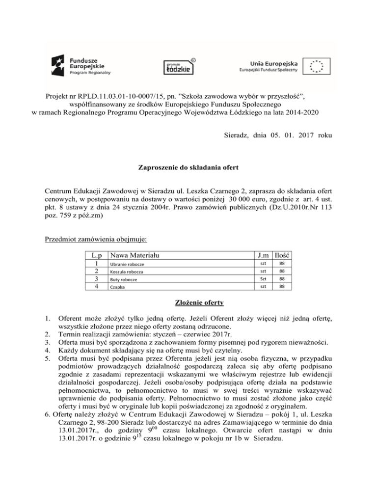 Zaproszenie do składania ofert z dn. 5.01.2017 ubrania robocze