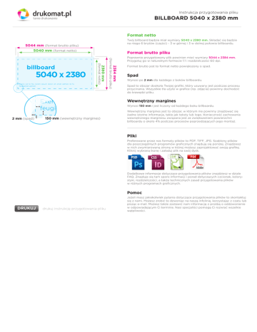Exero od te feu feugiamet ad do odiamconsent augait la feugiam Instrukcja przygotowania pliku commod eu facilissed tin et lumdrukomat.pl tanie drukowanie san henibh eum at dolut venit no- BILLBOARD 5040 x 2380 mm strud tat nulput prat, quamet lore te doloreet, vel dolesto dolenis Format netto Twój billboard będzie miał wymiary 5040 x 2380 mm. Składać się będzie dit praessequate na niego 6 brytów (części) - 3 w górnej i 3 w dolnej połowie billboardu. 5044 mm (format brutto pliku) 5040 mm (format netto) drukomat.pl tanie drukowanie Exero od feugiamet 2 mm (spad) 150 mm (wewnętrzny margines) 2384 mm Exero od te feu lorem ipsum dolor sit amet admen te fu feugiamet admen (format brutto pliku) 5040 x 2380 2380 mm billboard Format brutto pliku (format netto) Exero od te feu feugiamet ad do odiamconsent augait la feugiam commod eu facilissed tin et lumsan henibh eum at dolut venit nostrud tat nulput prat, quamet lore te doloreet, vel dolesto dolenis dit praessequate Poprawnie przygotowany plik powinien mieć wymiary 5044 x 2384 mm. Przygotuj go w naturalnym formacie 1:1 i rozdzielczości 60 dpi. Format brutto jest to format netto powiększony o spad. Spad Wynosi po 2 mm dla każdego z boków billboardu. Spad to obszar dookoła Twojej grafiki, który usuwany jest podczas procesu przycinania. Wszystkie tła użyte w grafice (np. zdjęcia) powinny dochodzić do krawędzi pliku. Wewnętrzny margines Wynosi 150 mm i jest liczony od każdego boku billboardu. Wewnętrzny margines jest to obszar, w którym nie powinny znajdować się żadne istotne informacje, takie jak teksty lub logo. Konieczność zachowania wewnętrznego marginesu związana jest ze zwiększeniem powierzchni billboardu o około 4% podczas procesów poprzedzających jego montaż. Pliki Preferowane przez nas formaty plików to PDF, TIFF, JPG. Szablony plików dla poszczególnych programów graficznych znajdują się poniżej. Znajdziesz w nich zwymiarowaną stronę w której możesz zaprojektować swoją grafikę. Kliknij wybraną ikonę i załaduj plik na swój dysk. Dodatkowe informacje dotyczące przygotowania plików znajdziesz w dziale FAQ. Znajduje się tam sporo informacji i porad dotyczących czcionek, kolorystyki, rozdzielczości, a także technicznych zasad przygotowania plików w różnych programach graficznych. Pomoc DRUKUJ drukuj instrukcję przygotowania pliku Jeżeli masz jakiekolwiek pytania dotyczące przygotowania plików to skontaktuj się z nami. Możesz zrobić to dzwoniąc na naszą infolinię, korzystając z czatu lub pisząc e-mail. Możesz także zostawić nam informację z prośbą o oddzwonienie w odpowiadającym Ci terminie. Nasi specjaliści pomogą Ci rozwiać wszelkie wątpliwości.