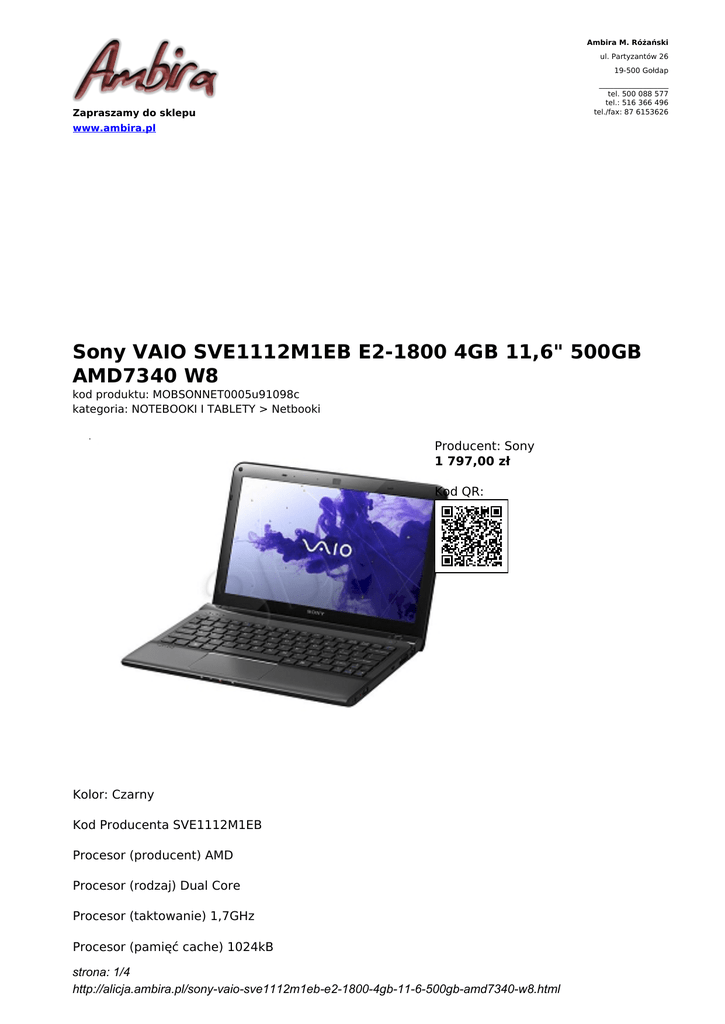 Ambira M. Różański ul. Partyzantów 26 19-500 Gołdap ___________________ tel. 500 088 577 tel.: 516 366 496 tel./fax: 87 6153626 Zapraszamy do sklepu www.ambira.pl Sony VAIO SVE1112M1EB E2-1800 4GB 11,6" 500GB AMD7340 W8 kod produktu: MOBSONNET0005u91098c kategoria: NOTEBOOKI I TABLETY > Netbooki Producent: Sony 1 797,00 zł Kod QR: Kolor: Czarny Kod Producenta SVE1112M1EB Procesor (producent) AMD Procesor (rodzaj) Dual Core Procesor (taktowanie) 1,7GHz Procesor (pamięć cache) 1024kB strona: 1/4 http://alicja.ambira.pl/sony-vaio-sve1112m1eb-e2-1800-4gb-11-6-500gb-amd7340-w8.html Procesor (opis) AMD E-Series E2-1800 (1.7 GHz / 1 MB) Technologia Intel vPro Nie Matryca (przekątna) 11,6cale Ekran dotykowy Nie Matryca (rozdzielczość) WXGA 1366 x 768 (16:9) Matryca (powłoka) świecąca Pamięć zainstalowana (pojemność) 4GB Pamięć (zajęte/wolne sloty) 1/1 Pamięć (max. pojemność) 8GB Pamięć (technologia) DDR3 SDRAM PC3-10600 1333 Dysk twardy (pojemność) 500GB Dysk twardy (interfejs) SATA Dysk twardy (prędkość) 5400obr/min Napęd optyczny (typ) Brak Karta graficzna (producent) AMD Karta graficzna (model) Radeon Karta dźwiękowa HD Aduio Podświetlana klawiatura Nie Wbudowany mikrofon Tak Karta sieciowa przewodowa 10/100/1000 Mbps Gigabit Ethernet Karta sieciowa bezprzewodowa Tak Karta sieciowa bezprzewodowa (opis) IEEE 802.11b/g/n Bluetooth Tak Bluetooth (opis) Standard Bluetooth Modem 3G Nie Fax modem Nie ExpressCard 34 Nie ExpressCard 54 Nie Czytnik Smart Card Nie E-SATA Nie strona: 2/4 http://alicja.ambira.pl/sony-vaio-sve1112m1eb-e2-1800-4gb-11-6-500gb-amd7340-w8.html Czytnik linii papilarnych Nie Platforma szyfrująca TPM Nie Kensington Lock Tak Display Port Nie DVI-D Nie HDMI Tak VGA (RGB) Tak S-video/TV-out Nie AV-in (Tuner TV) Nie Line-in Nie Line-out Tak Wejście mikrofonu Tak S/PDIF Nie RS232 (szeregowy) Nie Czytnik kart pamięci Tak Czytnik kart pamięci (opis) Zgodność z SDHC i SDXC Panel klawiszy multimedialnych Nie Złącze replikatora portów Nie Fire-Wire (IEEE1394) Nie USB 2.0 2szt. USB 3.0 1szt. System operacyjny Windows 8 64 bit System operacyjny (wer. Językowa) polski Dodatkowe oprogramowanie Preinstalowany Office 2010 Wbudowana kamera Tak Wbudowana kamera (rozdzielczość) 1,31 Wbudowana kamera (opis) Kamera internetowa HD z przetwornikiem Wbudowana kamera obrotowa Nie Urządzenie wskazujące Touch Pad z obsługą gestów Akumulator (technologia) Litowy (VGP-BPS21B) strona: 3/4 http://alicja.ambira.pl/sony-vaio-sve1112m1eb-e2-1800-4gb-11-6-500gb-amd7340-w8.html Akumulator (czas pracy) 6h Wymiary (wysokość) 23,5mm Wymiary (szerokość) 290mm Wymiary (głębokość) 204mm Waga 1,5kg Gwarancja 24mies Gwarancja międzynarodowa Tak Gwarancja baterii 12mies Wyposażenie Zasilacz sieciowy (VGP-AC19V39) strona: 4/4 http://alicja.ambira.pl/sony-vaio-sve1112m1eb-e2-1800-4gb-11-6-500gb-amd7340-w8.html
