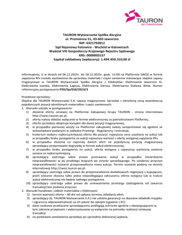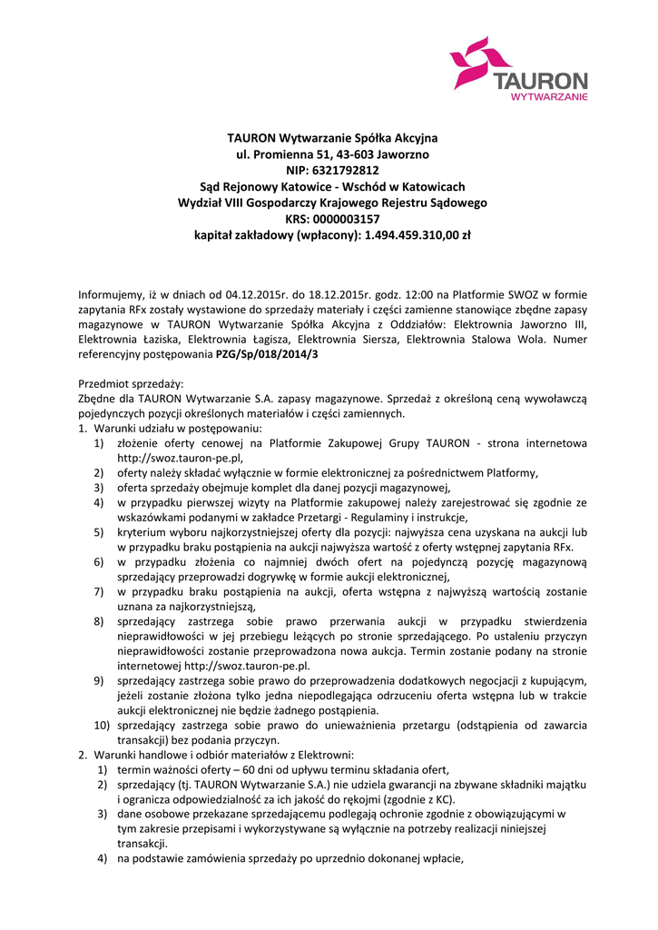 TAURON Wytwarzanie Spółka Akcyjna ul. Promienna 51, 43-603 Jaworzno NIP: 6321792812 Sąd Rejonowy Katowice - Wschód w Katowicach Wydział VIII Gospodarczy Krajowego Rejestru Sądowego KRS: 0000003157 kapitał zakładowy (wpłacony): 1.494.459.310,00 zł Informujemy, iż w dniach od 04.12.2015r. do 18.12.2015r. godz. 12:00 na Platformie SWOZ w formie zapytania RFx zostały wystawione do sprzedaży materiały i części zamienne stanowiące zbędne zapasy magazynowe w TAURON Wytwarzanie Spółka Akcyjna z Oddziałów: Elektrownia Jaworzno III, Elektrownia Łaziska, Elektrownia Łagisza, Elektrownia Siersza, Elektrownia Stalowa Wola. Numer referencyjny postępowania PZG/Sp/018/2014/3 Przedmiot sprzedaży: Zbędne dla TAURON Wytwarzanie S.A. zapasy magazynowe. Sprzedaż z określoną ceną wywoławczą pojedynczych pozycji określonych materiałów i części zamiennych. 1. Warunki udziału w postępowaniu: 1) złożenie oferty cenowej na Platformie Zakupowej Grupy TAURON - strona internetowa http://swoz.tauron-pe.pl, 2) oferty należy składać wyłącznie w formie elektronicznej za pośrednictwem Platformy, 3) oferta sprzedaży obejmuje komplet dla danej pozycji magazynowej, 4) w przypadku pierwszej wizyty na Platformie zakupowej należy zarejestrować się zgodnie ze wskazówkami podanymi w zakładce Przetargi - Regulaminy i instrukcje, 5) kryterium wyboru najkorzystniejszej oferty dla pozycji: najwyższa cena uzyskana na aukcji lub w przypadku braku postąpienia na aukcji najwyższa wartość z oferty wstępnej zapytania RFx. 6) w przypadku złożenia co najmniej dwóch ofert na pojedynczą pozycję magazynową sprzedający przeprowadzi dogrywkę w formie aukcji elektronicznej, 7) w przypadku braku postąpienia na aukcji, oferta wstępna z najwyższą wartością zostanie uznana za najkorzystniejszą, 8) sprzedający zastrzega sobie prawo przerwania aukcji w przypadku stwierdzenia nieprawidłowości w jej przebiegu leżących po stronie sprzedającego. Po ustaleniu przyczyn nieprawidłowości zostanie przeprowadzona nowa aukcja. Termin zostanie podany na stronie internetowej http://swoz.tauron-pe.pl. 9) sprzedający zastrzega sobie prawo do przeprowadzenia dodatkowych negocjacji z kupującym, jeżeli zostanie złożona tylko jedna niepodlegająca odrzuceniu oferta wstępna lub w trakcie aukcji elektronicznej nie będzie żadnego postąpienia. 10) sprzedający zastrzega sobie prawo do unieważnienia przetargu (odstąpienia od zawarcia transakcji) bez podania przyczyn. 2. Warunki handlowe i odbiór materiałów z Elektrowni: 1) termin ważności oferty – 60 dni od upływu terminu składania ofert, 2) sprzedający (tj. TAURON Wytwarzanie S.A.) nie udziela gwarancji na zbywane składniki majątku i ogranicza odpowiedzialność za ich jakość do rękojmi (zgodnie z KC). 3) dane osobowe przekazane sprzedającemu podlegają ochronie zgodnie z obowiązującymi w tym zakresie przepisami i wykorzystywane są wyłącznie na potrzeby realizacji niniejszej transakcji. 4) na podstawie zamówienia sprzedaży po uprzednio dokonanej wpłacie, 5) odbiór do 14 dni od otrzymania zawiadomienia o przygotowaniu materiału do odbioru staraniem i na koszt Kupującego. Wszelkie wyjaśnienia w ramach niniejszego postępowania będą prowadzone w formie elektronicznej poprzez Platformę Zakupową. W przedmiotowej sprawie można kontaktować się z naszymi przedstawicielami: - Jan Jasiński, tel. 32 715 5588, - Krzysztof Straszak, tel. 32 715 5580, - Marek Migas, tel. 32 715 5576, w dniach roboczych od godz. 8:00 do 13:00.