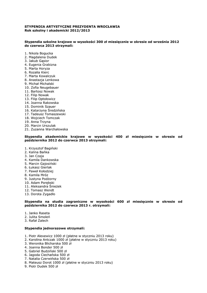 STYPENDIA ARTYSTYCZNE PREZYDENTA WROCŁAWIA Rok szkolny i akademicki 2012/2013 Stypendia szkolne krajowe w wysokości 300 zł miesięcznie w okresie od września 2012 do czerwca 2013 otrzymali: 1. Nikola Bogucka 2. Magdalena Dudek 3. Jakub Gąsior 4. Eugenia Grabizna 5. Marta Horyza 6. Rozalia Kierc 7. Marta Kowalczuk 8. Anastazja Lenkowa 9. Michał Michalski 10. Zofia Neugebauer 11. Bartosz Nowak 12. Filip Nowak 13. Filip Optołowicz 14. Joanna Rakowska 15. Dominik Szauer 16. Katarzyna Średzińska 17. Tadeusz Tomaszewski 18. Wojciech Tomczak 19. Anna Trzyna 20. Marcin Urszulak 21. Zuzanna Warchałowska Stypendia akademickie krajowe w wysokości października 2012 do czerwca 2013 otrzymali: 400 zł miesięcznie w okresie od 1. Krzysztof Bagiński 2. Kalina Bańka 3. Jan Czaja 4. Kamila Dankowska 5. Marcin Gajosiński 6. Łukasz Gierlak 7. Paweł Kołodziej 8. Kamila Mróz 9. Justyna PodŜorny 10. Adam Porębski 11. Aleksandra ŚnieŜek 12. Tomasz Wendt 13. Dorota Zygadło Stypendia na studia zagraniczne w wysokości 600 zł miesięcznie w okresie od października 2012 do czerwca 2013 r. otrzymali: 1. Janko Raseta 2. Julita Smoleń 3. Rafał Zalech Stypendia jednorazowe otrzymali: 1. 2. 3. 4. 5. 6. 7. 8. 9. Piotr Alexewicz 1000 zł (płatne w styczniu 2013 roku) Karolina Antczak 1000 zł (płatne w styczniu 2013 roku) Weronika Blicharska 500 zł Joanna Bonder 500 zł Gabriel Budziński 500 zł Jagoda Ciechańska 500 zł Natalia Czerwińska 500 zł Mateusz Dorot 1000 zł (płatne w styczniu 2013 roku) Piotr Dudek 500 zł 10. 11. 12. 13. 14. 15. 16. 17. 18. 19. 20. 21. 22. 23. 24. 25. 26. 27. 28. 29. 30. 31. 32. 33. 34. 35. 36. 37. 38. 39. 40. 41. 42. 43. 44. 45. 46. 47. 48. 49. 50. 51. 52. 53. 54. 55. 56. 57. Zuzanna Dyrda 500 zł Patryk GiŜyński 500 zł Karolina Gorzkowska 800 zł Weronika Górska 1000 zł (płatne w styczniu 2013 roku) Agata Grobel 800 zł Martyna Grzegorzak 1000 zł (płatne w styczniu 2013 roku) Hanna Hurkot 1000 zł (płatne w styczniu 2013 roku) Łukasz Jakimów 1000 zł (płatne w styczniu 2013 roku) Sara Jakubus 500 zł Paulina Jodła 500 zł Nela Just 800 zł Nicole Kiełbasiewicz 1000 zł (płatne w styczniu 2013 roku) Karolina Knapek 800 zł Ewa Korpak 1000 zł (płatne w styczniu 2013 roku) Anna Kosarevska 500 zł Maria Kownacka 500 zł Magdalena Kreis 500 zł Justyna Król 800 zł Mikołaj Laskowski 1100 zł Rafał Łuc 1000 zł (płatne w styczniu 2013 roku) Anna Makowska-Kowalczyk 800 zł Marzena Malinowska 1000 zł (płatne w styczniu 2013 roku) Paulina Marcisz1000 zł (płatne w styczniu 2013 roku) Michał Mastalarz 500 zł Małgorzata Mazij 1000 zł (płatne w styczniu 2013 roku) Aleksandra Mikulska 500 zł Magdalena Napora 500 zł Zuzanna Nycz 500 zł Wojciech Oliszewski 1000 zł (płatne w styczniu 2013 roku) Alicja Patanowska 2000 zł (płatne w styczniu 2013 roku) Grzegorz Piasecki 1000 zł (płatne w styczniu 2013 roku) Daniel Pochwała 1000 zł (płatne w styczniu 2013 roku) Krzysztof Potocznik 1000 zł (płatne w styczniu 2013 roku) Małgorzata Radochońska 1000 zł (płatne w styczniu 2013 roku) Edyta Rutowska 1000 zł (płatne w styczniu 2013 roku) Agnieszka Sierzputowska 500 zł Weronika Skonieczna 500 zł Karol Śledź 500 zł Piotr Świątkowski 1000 zł (płatne w styczniu 2013 roku) Antoni Tomaszewski 1000 zł (płatne w styczniu 2013 roku) Łukasz Twarkowski 1000 zł Jan Walasek 500 zł Maja Welc 500 zł Martyna Wrześniewska 1000 zł (płatne w styczniu 2013 roku) Barbara Zakrzewska 1000 zł (płatne w styczniu 2013 roku) Klaudia Ziobro 1000 zł (płatne w styczniu 2013 roku) Justyna śak 2000 zł (płatne w styczniu 2013 roku) Marcin śłobiński 500 zł
