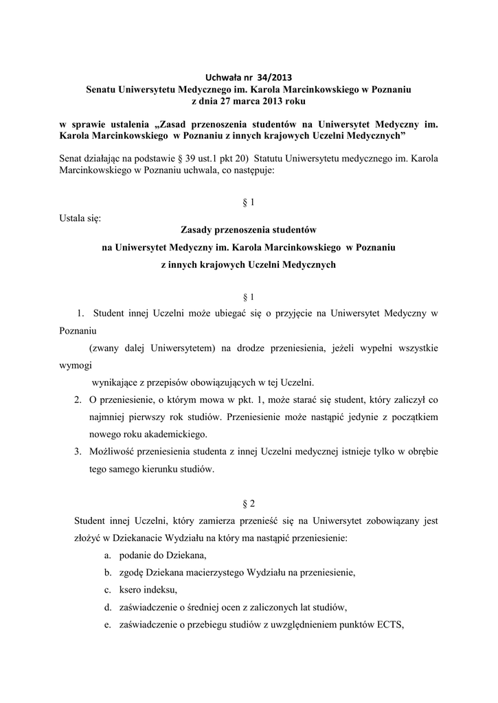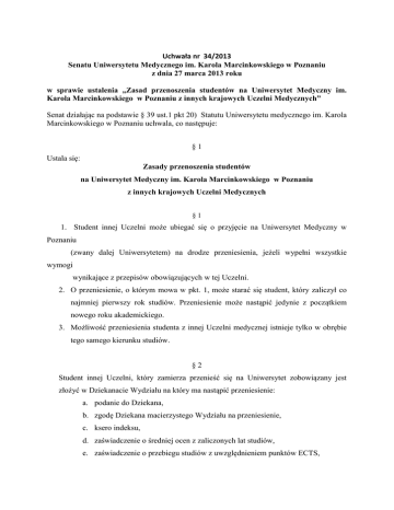 Uchwała nr 34/2013 Senatu Uniwersytetu Medycznego im. Karola Marcinkowskiego w Poznaniu z dnia 27 marca 2013 roku w sprawie ustalenia „Zasad przenoszenia studentów na Uniwersytet Medyczny im. Karola Marcinkowskiego w Poznaniu z innych krajowych Uczelni Medycznych” Senat działając na podstawie § 39 ust.1 pkt 20) Statutu Uniwersytetu medycznego im. Karola Marcinkowskiego w Poznaniu uchwala, co następuje: §1 Ustala się: Zasady przenoszenia studentów na Uniwersytet Medyczny im. Karola Marcinkowskiego w Poznaniu z innych krajowych Uczelni Medycznych §1 1. Student innej Uczelni może ubiegać się o przyjęcie na Uniwersytet Medyczny w Poznaniu (zwany dalej Uniwersytetem) na drodze przeniesienia, jeżeli wypełni wszystkie wymogi wynikające z przepisów obowiązujących w tej Uczelni. 2. O przeniesienie, o którym mowa w pkt. 1, może starać się student, który zaliczył co najmniej pierwszy rok studiów. Przeniesienie może nastąpić jedynie z początkiem nowego roku akademickiego. 3. Możliwość przeniesienia studenta z innej Uczelni medycznej istnieje tylko w obrębie tego samego kierunku studiów. §2 Student innej Uczelni, który zamierza przenieść się na Uniwersytet zobowiązany jest złożyć w Dziekanacie Wydziału na który ma nastąpić przeniesienie: a. podanie do Dziekana, b. zgodę Dziekana macierzystego Wydziału na przeniesienie, c. ksero indeksu, d. zaświadczenie o średniej ocen z zaliczonych lat studiów, e. zaświadczenie o przebiegu studiów z uwzględnieniem punktów ECTS, f. zaświadczenie o liczbie uzyskanych w trakcie rekrutacji na pierwotnej Uczelni punktów oraz liczbie punktów niezbędnych w celu przyjęcia na tejże Uczelni w roku rekrutacji, g. zaświadczenie o innych osiągnięciach, h. inne dokumenty według uznania. 2. Dokumenty wymienione w punkcie 1 należy złożyć w terminie do 30 sierpnia danego roku akademickiego poprzedzającego rok podjęcia studiów na Uniwersytecie Medycznym w Poznaniu. 3. Kryteriami przyjęcia studenta są: a. możliwości finansowe i dydaktyczne Uniwersytetu Medycznego w Poznaniu, b. przebieg studiów z uwzględnieniem średniej ocen, c. wypełnienie wszystkich obowiązków wynikających z przepisów obowiązujących na Uczelni, którą student opuszcza, d. w przypadku przenoszenia w obrębie kierunków studiów lekarski i lekarskodentystyczny, warunkiem są wolne miejsca w odniesieniu do limitu określonego przez Ministra Nauki i Szkolnictwa Wyższego, zgodnie z art. 8 ust.9 ustawy z dnia 27 lipca 2005r. Prawo o szkolnictwie wyższym. 4. Nie można przyjąć studenta z innej Uczelni, jeżeli: a. nie zaliczył pierwszego roku studiów, b. jest zawieszony w prawach studenta, c. prowadzone jest przeciwko studentowi postępowanie dyscyplinarne lub wcześniej został ukarany karą dyscyplinarną. §3 1. Zgodę na przeniesienie studenta wyraża Dziekan odpowiedniego Wydziału Uniwersytetu Medycznego w Poznaniu po zasięgnięciu opinii Kolegium Dziekańskiego. Wydana decyzja musi zawierać: 1) rok studiów, na który student ma być przeniesiony, 2) listę przedmiotów, które zostaną studentowi zaliczone wraz z uzyskanymi ocenami i punktami ECTS, 3) informacje o stwierdzonych różnicach programowych niezbędnych do uzupełnienia wraz z wyznaczonym terminem ich uzupełnienia, 4) informacje o wysokości opłat dla studentów niestacjonarnych. 2. Oceny z przedmiotów zaliczonych przez studenta w Uczelni, z której się przenosi są uznawane za oceny uzyskane na Uczelni przyjmującej przy pełnej ich zgodności godzinowej i programowej. 3. Decyzja o przeniesieniu studenta z innej Uczelni na Uniwersytet Medyczny w Poznaniu jest oparta o Rozporządzenie MNiSW z dnia 14 września 2011 roku w sprawie warunków i trybu przenoszenia zajęć zaliczonych przez studenta (Dz.U.Nr 201, poz.1187) oraz § 10 Regulaminu Studiów Uniwersytetu Medycznego im. Karola Marcinkowskiego w Poznaniu (załącznik do uchwały nr 104/2012 Senatu Uniwersytetu Medycznego im. Karola Marcinkowskiego w Poznaniu z 27 czerwca 2012 r.). §4 1. Przeniesienie studenta z innej Uczelni na Uniwersytet Medyczny w Poznaniu może nastąpić po rozwiązaniu umowy z Uczelnią, z której student się przenosi i podpisania umowy z Uniwersytetem Medycznym w Poznaniu. 2. Dziekani Wydziałów Uniwersytetu Medycznego w Poznaniu mogą odmówić przyjęcia i przeniesienia studenta, jeżeli względy organizacyjne na to nie pozwalają. §5 Zasady przenoszenia studentów w ramach studiów anglojęzycznych określa odrębny regulamin. §6 Wykonanie uchwały powierza się Rektorowi. §7 Uchwała wchodzi w życie z dniem podjęcia. Rektor prof. dr hab. Jacek Wysocki