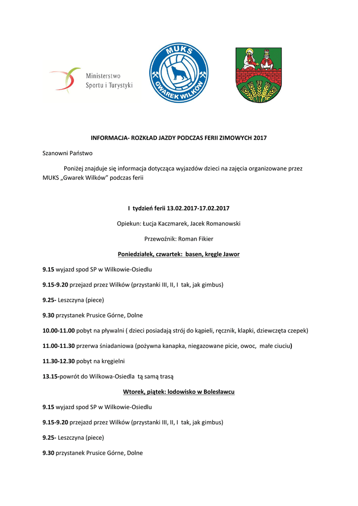 INFORMACJA- ROZKŁAD JAZDY PODCZAS FERII ZIMOWYCH 2017 Szanowni Państwo Poniżej znajduje się informacja dotycząca wyjazdów dzieci na zajęcia organizowane przez MUKS „Gwarek Wilków” podczas ferii I tydzień ferii 13.02.2017-17.02.2017 Opiekun: Łucja Kaczmarek, Jacek Romanowski Przewoźnik: Roman Fikier Poniedziałek, czwartek: basen, kręgle Jawor 9.15 wyjazd spod SP w Wilkowie-Osiedlu 9.15-9.20 przejazd przez Wilków (przystanki III, II, I tak, jak gimbus) 9.25- Leszczyna (piece) 9.30 przystanek Prusice Górne, Dolne 10.00-11.00 pobyt na pływalni ( dzieci posiadają strój do kąpieli, ręcznik, klapki, dziewczęta czepek) 11.00-11.30 przerwa śniadaniowa (pożywna kanapka, niegazowane picie, owoc, małe ciuciu) 11.30-12.30 pobyt na kręgielni 13.15-powrót do Wilkowa-Osiedla tą samą trasą Wtorek, piątek: lodowisko w Bolesławcu 9.15 wyjazd spod SP w Wilkowie-Osiedlu 9.15-9.20 przejazd przez Wilków (przystanki III, II, I tak, jak gimbus) 9.25- Leszczyna (piece) 9.30 przystanek Prusice Górne, Dolne 10.00-12.30 pobyt na lodowisku z przerwą śniadaniową 12.30- 13.30 powrót tą samą trasą Proszę o wysokie skarpety do łyżew oraz rękawiczki, pożywną kanapkę, niegazowane picie najlepiej ciepłe, małe ciuciu. Jeżeli życzycie sobie Państwo dodatkowy sprzęt ochronny typu kask, ochraniacze lub pingwina do nauki to w ramach własnych środków. Ponieważ obiekt jest zadaszony proszę nie ubierać dzieci w grube ubrania, szaliki, czapy. środa: 9.00-12.00 zajęcia sportowe na sali gimnastycznej lub w terenie- dzieci zostaną poinformowane przez opiekunów na zajęciach we wtorek- obowiązuje strój sportowy i obuwie zmienne. W tym dniu dzieci przyjeżdżają do szkoły/ dochodzą samodzielnie W razie, gdyby dopisał śnieg planowany jest wyjazd na sanki na Łysą Górę. W szkole znajdują się sanki, ale prosimy również o zabranie własnego sprzętu. Dzieci powinny być odpowiednio ubrane na śnieg, proszę zapewnić zmienne spodnie np. dresy na drogę powrotną. Wyjazd planowany jest w tym dniu o godzinie 9.15 a powrót ok.13.00 (przejeżdżamy trasą jak do Bolesławca) Bardzo proszę nie dawać dzieciom chipsów, napojów gazowanych, pączków, torby słodyczy II tydzień ferii: 20.02.2017-24.02.2017 Opiekun: Lidia Haba, Paweł Choczaj Przewoźnik: Edward Nocuń Poniedziałek 9.00-12.00 zajęcia sportowe na sali gimnastycznej lub w terenie- dzieci zostaną poinformowane przez opiekunów SMS-em - obowiązuje strój sportowy i obuwie zmienne. W tym dniu dzieci przyjeżdżają do szkoły/ dochodzą samodzielnie W razie, gdyby dopisał śnieg planowany jest wyjazd na sanki na Łysą Górę. W szkole znajdują się sanki, ale prosimy również o zabranie własnego sprzętu. Dzieci powinny być odpowiednio ubrane na śnieg, proszę zapewnić zmienne spodnie np. dresy na drogę powrotną. Wyjazd planowany jest w tym dniu o godzinie 9.15 a powrót ok.13.00 (przejeżdżamy trasą jak do Bolesławca) Wtorek, czwartek: lodowisko w Bolesławcu 9.15 wyjazd spod SP w Wilkowie-Osiedlu 9.15-9.20 przejazd przez Wilków (przystanki III, II, I tak, jak gimbus) 9.25- Leszczyna (piece) 9.30 przystanek Prusice Górne, Dolne 10.00-12.30 pobyt na lodowisku z przerwą śniadaniową 12.30- 13.30 powrót tą samą trasą Proszę o wysokie skarpety do łyżew oraz rękawiczki, pożywną kanapkę, niegazowane picie najlepiej ciepłe, małe ciuciu. Jeżeli życzycie sobie Państwo dodatkowy sprzęt ochronny typu kask, ochraniacze lub pingwina do nauki to w ramach własnych środków. Środa, piątek: basen, kręgle Jawor 9.15 wyjazd spod SP w Wilkowie-Osiedlu 9.15-9.20 przejazd przez Wilków (przystanki III, II, I tak, jak gimbus) 9.25- Leszczyna (piece) 9.30 przystanek Prusice Górne, Dolne 10.00-11.00 pobyt na pływalni ( dzieci posiadają strój do kąpieli, ręcznik, klapki, dziewczęta czepek) 11.00-11.30 przerwa śniadaniowa (pożywna kanapka, niegazowane picie, owoc, małe ciuciu) 11.30-12.30 pobyt na kręgielni 13.15-powrót do Wilkowa-Osiedla tą samą trasą Bardzo proszę nie dawać dzieciom chipsów, napojów gazowanych, pączków, torby słodyczy Jolanta Choczaj