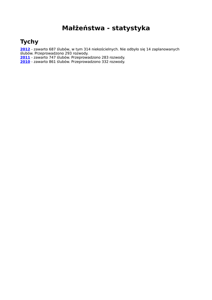 Małżeństwa - statystyka Tychy 2012 - zawarto 687 ślubów, w tym 314 niekościelnych. Nie odbyło się 14 zaplanowanych ślubów. Przeprowadzono 293 rozwody. 2011 - zawarto 747 ślubów. Przeprowadzono 283 rozwody. 2010 - zawarto 861 ślubów. Przeprowadzono 332 rozwody.