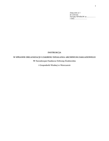 1 Załącznik nr 3 do uchwały Zarządu NFOŚiGW nr.................... z dnia............................ INSTRUKCJA W SPRAWIE ORGANIZACJI I ZAKRESU DZIAŁANIA ARCHIWUM ZAKŁADOWEGO W Narodowym Funduszu Ochrony Środowiska i Gospodarki Wodnej w Warszawie 2 SPIS TREŚCI: str. Rozdział 1 Przepisy ogólne 3 Rozdział 2 Organizacja i zadania archiwum zakładowego 5 Rozdział 3 Obsada archiwum zakładowego 5 Rozdział 4 Lokal archiwum zakładowego 6 Rozdział 5 Przejmowanie dokumentacji do archiwum zakładowego 8 Rozdział 6 Przechowywanie i zabezpieczanie zgromadzonej dokumentacji oraz prowadzenie jej ewidencji 9 Rozdział 7 Przeprowadzanie skontrum dokumentacji w archiwum zakładowym oraz porządkowanie dokumentacji w archiwum zakładowym 10 Rozdział 8 Udostępnianie dokumentacji przechowywanej w archiwum zakładowym 11 Rozdział 9 Wycofywanie dokumentacji ze stanu archiwum zakładowego 13 Rozdział 10 Brakowanie dokumentacji niearchiwalnej 13 Rozdział 11 Przekazywanie materiałów archiwalnych do archiwum państwowego 14 Rozdział 12 Sprawozdawczość archiwum zakładowego 15 nr 1 Warunki wilgotności i temperatury w pomieszczeniach archiwum zakładowego, 16 nr 2 Wzór wykazu spisów zdawczo-odbiorczych 17 nr 3 Wzór karty udostępnienia akt 18 nr 4 Wzór protokołu w sprawie zaginięcia, uszkodzenia lub braków wypożyczonych akt, 20 nr 5 Wzór protokołu wycofania akt z ewidencji archiwum 21 Załączniki: 3 zakładowego nr 6 Wzór spisu spraw 22 nr 7 Spis zdawczo – odbiorczy akt 23 nr 8 Spis dokumentacji niearchiwalnej (aktowej) przeznaczonej na makulaturę lub zniszczenie 24 nr 9 Spis zdawczo – odbiorczy materiałów archiwalnych do Archiwum Państwowego 25 nr 10 Protokół oceny dokumentacji niearchiwalnej 26 nr 11 Opis teczki aktowej 27 nr 12 Spis dokumentacji na nośniku informatycznym 28 ROZDZIAŁ I Przepisy ogólne § 1. Instrukcja o organizacji i zakresie działania archiwum zakładowego zwana dalej „instrukcją archiwalną”, określa organizację, zadania i zakres działania archiwum zakładowego w Narodowym Funduszu Ochrony Środowiska i Gospodarki Wodnej, zwana dalej ‘NFOŚiGW”, oraz postępowanie w archiwum zakładowym z wszelką dokumentacją spraw zakończonych, niezależnie od techniki jej wytwarzania, postaci fizycznej oraz informacji w niej zawartych. § 2. Użyte w instrukcji archiwalnej określenia oznaczają: 1) archiwista pracownika lub pracowników realizujących zadania archiwum zakładowego; archiwum zakładowe NFOŚiGW, 2) archiwum zakładowe 3) informatyczny nośnik danych 4) kierownik komórki organizacyjnej 5) informatyczny nośnik danych, na którym zapisano dokumentację w postaci elektronicznej osobę kierującą komórką organizacyjną lub osobę upoważnioną do wykonywania jej zadań; komórka organizacyjna wydzieloną organizacyjnie część NFOŚiGW np. zespół, wydział, departament etc. 4 6) Prezes Zarządu NFOŚiGW 7) skład informatycznych nośników danych uporządkowany zbiór informatycznych nośników danych teczka aktowa materiał biurowy używany do przechowywania dokumentacji 8) osoba dysponująca ostateczną władzą wykonawczą w NFOŚiGW lub upoważnioną przez niego osobę na czas jego nieobecności; zawierających dokumentację w postaci elektronicznej; w postaci nieelektronicznej; 9) wykaz akt jednolity rzeczowy wykaz akt. § 3. 1. Dokumentacja przekazywana i przechowywana w archiwum zakładowym musi być zakwalifikowana do właściwych kategorii archiwalnych. 2. Podstawą kwalifikacji archiwalnej są wykazy akt, obowiązujące w czasie, gdy dokumentacja powstawała i była gromadzona, chyba że przepis szczególny stanowi inaczej. 3. Dyrektor właściwego miejscowo archiwum państwowego może dokonać zmiany kategorii archiwalnej dokumentacji. § 4. 1. Dopuszcza się wykorzystanie narzędzi informatycznych, w szczególności w celu: 1) sporządzania środków ewidencyjnych dokumentacji do przekazania do archiwum zakładowego, ich przesyłania, jak i w celu sporządzania środków ewidencyjnych dokumentacji przechowywanej w archiwum zakładowym; 2) prowadzenia ewidencji dokumentacji w archiwum zakładowym; 3) prowadzenia ewidencji udostępniania dokumentacji; 4) sporządzania środków ewidencyjnych dokumentacji w związku z procedurą brakowania dokumentacji niearchiwalnej lub przekazywania materiałów archiwalnych do właściwego miejscowo archiwum państwowego; 5) prowadzenia ewidencji wyników pomiaru temperatury i wilgotności powietrza w magazynach archiwum; 6) informowania o dokumentacji przechowywanej w archiwum zakładowym. 2. Narzędzia informatyczne, o których mowa w ust. 1, mogą być stosowane zamiast dokumentacji w postaci papierowej, jeżeli dane w postaci elektronicznej: 1) są zabezpieczone przed wprowadzeniem zmian przez osoby nieupoważnione, 2) są zabezpieczone przed utratą przez co najmniej sporządzanie kopii zabezpieczającej na odrębnym informatycznym nośniku danych, nie później niż dobę po zmianie treści tych danych, ale nie rzadziej niż raz na 6 miesięcy. 5 3. Kopie zabezpieczające wykonuje się kolejno na co najmniej dwóch różnych informatycznych nośnikach danych, tak aby stale dysponować co najmniej dwoma nośnikami umożliwiającymi odzyskanie danych. ROZDZIAŁ 2 Organizacja i zadania archiwum zakładowego § 5. 1. W NFOŚiGW działa jedno archiwum zakładowe. 2. Archiwum zakładowe gromadzi i przechowuje materiały archiwalne (akta kategorii A) i dokumentację niearchiwalną (akta kategorii B) ze wszystkich komórek organizacyjnych NFOŚiGW oraz dokumentację odziedziczoną. § 6. Do zadań archiwum zakładowego należy: 1) przejmowanie dokumentacji; 2) przechowywanie i zabezpieczanie zgromadzonej dokumentacji oraz prowadzenie jej ewidencji; 3) przeprowadzanie skontrum dokumentacji; 4) porządkowanie przechowywanej dokumentacji, przejętej w latach wcześniejszych w stanie nieuporządkowanym; 5) udostępnianie przechowywanej dokumentacji; 6) wycofywanie dokumentacji ze s