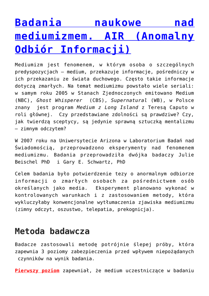 Badania naukowe nad mediumizmem. AIR (Anomalny Odbiór Informacji) Mediumizm jest fenomenem, w którym osoba o szczególnych predyspozycjach – medium, przekazuje informacje, pośredniczy w ich przekazaniu ze świata duchowego. Często takie informacje dotyczą zmarłych. Na temat mediumizmu powstało wiele seriali: w samym roku 2005 w Stanach Zjednoczonych emitowano Medium (NBC), Ghost Whisperer (CBS), Supernatural (WB), w Polsce znany jest program Medium z Long Island z Teresą Caputo w roli głównej. Czy przedstawiane zdolności są prawdziwe? Czy, jak twierdzą sceptycy, są jedynie sprawną sztuczką mentalizmu – zimnym odczytem? W 2007 roku na Uniwersytecie Arizona w Laboratorium Badań nad Świadomością, przeprowadzono eksperymenty nad fenomenem mediumizmu. Badania przeprowadziła dwójka badaczy Julie Beischel PhD i Gary E. Schwartz, PhD Celem badania było potwierdzenie tezy o anormalnym odbiorze informacji o zmarłych osobach za pośrednictwem osób określanych jako media. Eksperyment planowano wykonać w kontrolowanych warunkach i z zastosowaniem metody, która wykluczyłaby konwencjonalne wytłumaczenia zjawiska mediumizmu (zimny odczyt, oszustwo, telepatia, prekognicja). Metoda badawcza Badacze zastosowali metodę potrójnie ślepej próby, która zapewnia 3 poziomy zabezpieczenia przed wpływem niepożądanych czynników na wynik badania. Pierwszy poziom zapewniał, że medium uczestniczące w badaniu nie posiadało żadnych wiadomości na temat zmarłych (oprócz imienia), z którymi mało się komunikować ani żadnych danych na temat ich rodzin lub osób żyjących, które chciały nawiązać kontakt. Drugi poziom – zastąpienie osoby, która chciała się kontaktować ze zmarłym – niezależnym eksperymentatorem pośredniczącym przy kontaktach z medium. Eksperymentator nie znał informacji na temat kontaktującego się i zmarłego. Wprowadzenie pośrednika przy kontaktach miało wyeliminować czynnik potencjalnego „zimnego odczytu” czyli sytuacji, kiedy medium może odczytywać informacje o zmarłym na podstawie świadomego lub nieświadomego zachowania osoby kontaktującej się. Zastosowanie tej metody eliminuje także telepatię (odczytanie przez medium myśli osoby kontaktującej się ze zmarłym) jako jedno z wyjaśnień zjawiska. Trzeci poziom zabezpieczenia badania (oślepienia) – osoby, które kontaktowały się ze zmarłymi miały za zadanie ocenić wynik komunikacji, dostarczony przez medium. Ocena takiego wyniku nazwana jest tutaj scoringiem. Osoba wykonująca scoring, dostawała dwa zestawy odpowiedzi, nie wiedząc który z nich zawierał informację otrzymaną od jego bliskiego zmarłego. Uczestnicy badania: W badaniu uczestniczyło ośmiu studentów Uniwersytetu Arizona, którzy pełnili rolę komunikujących się ze swoimi bliskimi – zmarłymi. W doświadczeniach wzięło udział także ośmioro mediów, które wcześniej ujawniły zdolność do przekazywania dokładnych danych o osobach zmarłych. Procedura potrójnie ślepej próby: Informację o każdym ze zmarłych (z którym planowano się komunikować) były zbierane przez asystenta, który w późniejszym etapie nie kontaktował się z mediami. Opisy te były następnie przez asystenta układane w pary, w celu optymalizacji różnic pod względem wieku, fizycznego wyglądu, opisu osobowości, powodu śmierci, hobby opisanych zmarłych. Czterech zmarłych rodziców połączono z czterema zmarłymi rówieśnikami tej samej płci, co w sumie stanowi cztery pary badawcze. Warto zauważyć, że procedura ta „oślepia” oceniających wynik komunikacji (wykonujących scoring) poprzez połączenie w pary zmarłych tej samej płci a jednocześnie optymalizuje możliwość zróżnicowania wykonywanej oceny dwóch scorowanych przypadków komunikacji. Komunikacje ze zmarłymi Każde z ośmiu mediów przeprowadziło po dwie komunikacje: po jednym dla każdego z danej pary. Każda z czterech par była zatem komunikowana przez dwa różne media, co daje w sumie osiem komunikacji dla par badanych przypadków. Medium nie otrzymywało żadnych informacji o zmarłym, oprócz imienia tej osoby – co pozwalało medium na skoncentrowaniu się na odpowiednim zmarłym. Odpowiednio wcześniej komunikujący się członek rodziny prosił zmarłego o kontakt z medium; prośba ta mogła być wyrażona za pomocą myśli, słownej prośby lub modlitwy. Przy każdej komunikacji uczestniczył pośredniczący eksperymentator, który nie znał żadnych informacji na temat osób komunikujących się . Udział eksperymentatora w trakcie kontaktu był potrzebny, aby medium czuło się bardziej komfortowo (zazwyczaj media dokonują komunikacji w obecności osób zainteresowanych kontaktem). Studenci nieobecni uczestniczący w eksperymencie nie znali wyników komunikatu aż do momentu oceny wyników (scoringu). Pośredniczący eksperymentator zadawał także pytania medium (podane poniżej). By zoptymalizować warunki badania, komunikacja eksperymentator – medium odbywała się poprzez telefon w ustalonym wcześniej terminie. Każde posiedzenie – komunikacja, składało się z trzech części: 1. Etap ustanowienie kontaktu ze Zmarłym – w tej części eksperymentator podawał medium imię zmarłego. Eksperymentator prosił medium o uzyskanie jakichkolwiek informacji od zmarłego. 2. P r o c e d u r a p y t a ń n a t e m a t ż y c i a – w tej części eksperymentator zadawał medium szereg określonych pytań na temat fizycznego wyglądu, osobowości, hobby oraz przyczyny śmierci zmarłego. 3. Etap komunikacji zwrotnej –eksperymentator pytał czy zmarły ma jakieś pytania, komentarze czy prośby dla bliskiego. który się z nim komunikuje. Ocena wyników komunikacji – scoring Zapis każdej komunikacji był następnie przekształcany przez eksperymentatora w listę informacji i stwierdzeń. Oceny trafności przekazanych informacji dokonywali komunikujący się (studenci). Każdy z komunikujących się