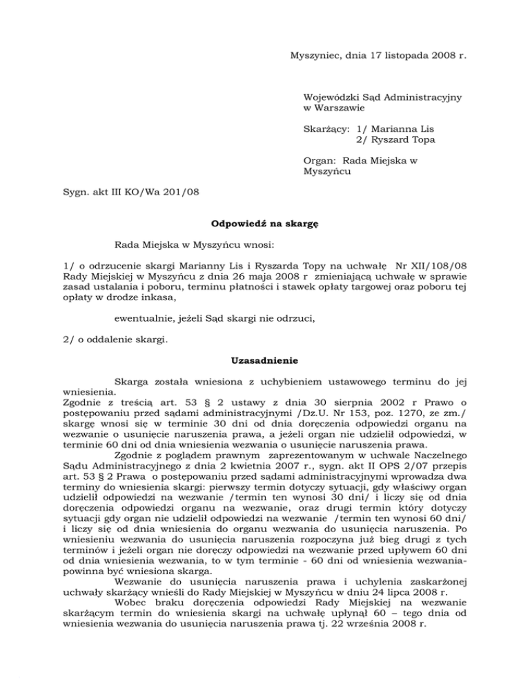 Myszyniec, dnia 17 listopada 2008 r. Wojewódzki Sąd Administracyjny w Warszawie Skarżący: 1/ Marianna Lis 2/ Ryszard Topa Organ: Rada Miejska w Myszyńcu Sygn. akt III KO/Wa 201/08 Odpowiedź na skargę Rada Miejska w Myszyńcu wnosi: 1/ o odrzucenie skargi Marianny Lis i Ryszarda Topy na uchwałę Nr XII/108/08 Rady Miejskiej w Myszyńcu z dnia 26 maja 2008 r zmieniającą uchwałę w sprawie zasad ustalania i poboru, terminu płatności i stawek opłaty targowej oraz poboru tej opłaty w drodze inkasa, ewentualnie, jeżeli Sąd skargi nie odrzuci, 2/ o oddalenie skargi. Uzasadnienie Skarga została wniesiona z uchybieniem ustawowego terminu do jej wniesienia. Zgodnie z treścią art. 53 § 2 ustawy z dnia 30 sierpnia 2002 r Prawo o postępowaniu przed sądami administracyjnymi /Dz.U. Nr 153, poz. 1270, ze zm./ skargę wnosi się w terminie 30 dni od dnia doręczenia odpowiedzi organu na wezwanie o usunięcie naruszenia prawa, a jeżeli organ nie udzielił odpowiedzi, w terminie 60 dni od dnia wniesienia wezwania o usunięcie naruszenia prawa. Zgodnie z poglądem prawnym zaprezentowanym w uchwale Naczelnego Sądu Administracyjnego z dnia 2 kwietnia 2007 r., sygn. akt II OPS 2/07 przepis art. 53 § 2 Prawa o postępowaniu przed sądami administracyjnymi wprowadza dwa terminy do wniesienia skargi: pierwszy termin dotyczy sytuacji, gdy właściwy organ udzielił odpowiedzi na wezwanie /termin ten wynosi 30 dni/ i liczy się od dnia doręczenia odpowiedzi organu na wezwanie, oraz drugi termin który dotyczy sytuacji gdy organ nie udzielił odpowiedzi na wezwanie /termin ten wynosi 60 dni/ i liczy się od dnia wniesienia do organu wezwania do usunięcia naruszenia. Po wniesieniu wezwania do usunięcia naruszenia rozpoczyna już bieg drugi z tych terminów i jeżeli organ nie doręczy odpowiedzi na wezwanie przed upływem 60 dni od dnia wniesienia wezwania, to w tym terminie - 60 dni od wniesienia wezwaniapowinna być wniesiona skarga. Wezwanie do usunięcia naruszenia prawa i uchylenia zaskarżonej uchwały skarżący wnieśli do Rady Miejskiej w Myszyńcu w dniu 24 lipca 2008 r. Wobec braku doręczenia odpowiedzi Rady Miejskiej na wezwanie skarżącym termin do wniesienia skargi na uchwałę upłynął 60 – tego dnia od wniesienia wezwania do usunięcia naruszenia prawa tj. 22 września 2008 r. Skarga, wniesiona do WSA w Warszawie w dniu 13 października 2008 r. a doręczona Radzie Miejskiej w Myszyńcu w dniu 20.10.2008r., jest skargą spóźnioną i podlega odrzuceniu na podstawie art. 58 § 1 pkt 2 Prawa o postępowaniu przed sądami administracyjnymi. Jak wskazuje przepis art. 101 ust. 1 ustawy z dnia 8 marca 1990 r o samorządzie gminnym /Dz. U. z 2001 r. Nr 142, poz. 1591, ze zm./, na który powołali się skarżący wzywając Radę Miejską do usunięcia naruszenia prawa i uchylenia zaskarżonej uchwały, legitymacja do złożenia skargi została oparta na kryterium interesu prawnego, co oznacza że ze skargą może wystąpić podmiot, który wykaże związek pomiędzy chronionym przez przepisy prawa materialnego interesem prawnym a uchwałą podjętą przez organ gminy z zakresu administracji publicznej. Do wniesienia skargi na podstawie art. 101 ust.1 ustawy o samorządzie gminnym nie legitymuje sprzeczność z prawem zaskarżonej uchwały; skarżący muszą ponadto wykazać, że zaskarżona uchwała, naruszając prawo, jednocześnie wpływa na ich sytuację prawnomaterialną, pozbawia ich np. pewnych uprawnień albo uniemożliwia ich realizację. Skarżący nie wykazali związku między zaskarżoną uchwałą a ich sytuacją prawną, nie wskazali przepisu prawa gwarantującego im konkretne uprawnienia, naruszone zaskarżoną uchwałą. Przywołany przez skarżących przepis m.in. art. 19 pkt 1/w skardze błędnie oznaczony jako „ust.1”/ ustawy z dnia 12 stycznia 1991 r. o podatkach i opłatach lokalnych /Dz.U. z 2006 r. Nr 121, poz. 844, ze zm./ pozostawia uznaniu rady określenie zasad ustalania i poboru oraz terminów płatności i wysokości stawek opłat, a jedyne ograniczenie jakie ustawodawca zawarł w powołanej ustawie w zakresie określania opłaty targowej polega na tym, że stawka opłaty targowej nie może przekroczyć 631,94 zł dziennie. Stawka dzienna opłaty targowej ustalona dla miejsc wymienionych w zaskarżonej uchwale jest zgodna z obowiązującym prawem i nie przekracza stawki ustawowej. Wbrew twierdzeniom skarżących, zaskarżona uchwała określająca zróżnicowane stawki w zależności od miejsca dokonywania sprzedaży nie narusza konstytucyjnych zasad równości wobec prawa, bowiem każda osoba fizyczna lub prawna oraz jednostka organizacyjna nie mająca osobowości prawnej dokonująca sprzedaży ma prawo wyboru miejsca, w którym chce tę sprzedaż prowadzić, a stawki opłaty targowej są takie same dla każdego kto targuje w określonym miejscu – w tym także w miejscach określonych zaskarżoną uchwałą. Podniesiona w skardze okoliczność, że ustalona zaskarżoną uchwałą opłata targowa wg stawki dziennej 100 zł jest restrykcyjna dla skarżących dokonujących sprzedaży w Myszyńcu na Placu Rynarzewskiego i Kardynała Stefana Wyszyńskiego, powoduje pogorszenie sytuacji finansowej, co zdaniem skarżących może doprowadzić do bankructwa, nie stanowi o naruszeniu ich interesu prawnego, lecz jedynie interesu faktycznego. Skoro brak jest bezpośredniego wpływu zaskarżonej uchwały na prawa i obowiązki skarżących, które wynikają z konkretnej normy prawnej, to tym samym ich interes prawny nie istnieje a żądanie wyeliminowania uchwały z obrotu prawnego jest nieuzasadnione. Z tych przyczyn wniosek Rady Miejskiej o oddalenie skargi jest uzasadniony. Przewodniczący Rady Miejskiej Sławomir Świtaj Załączniki: - odpis odpowiedzi na skargę.