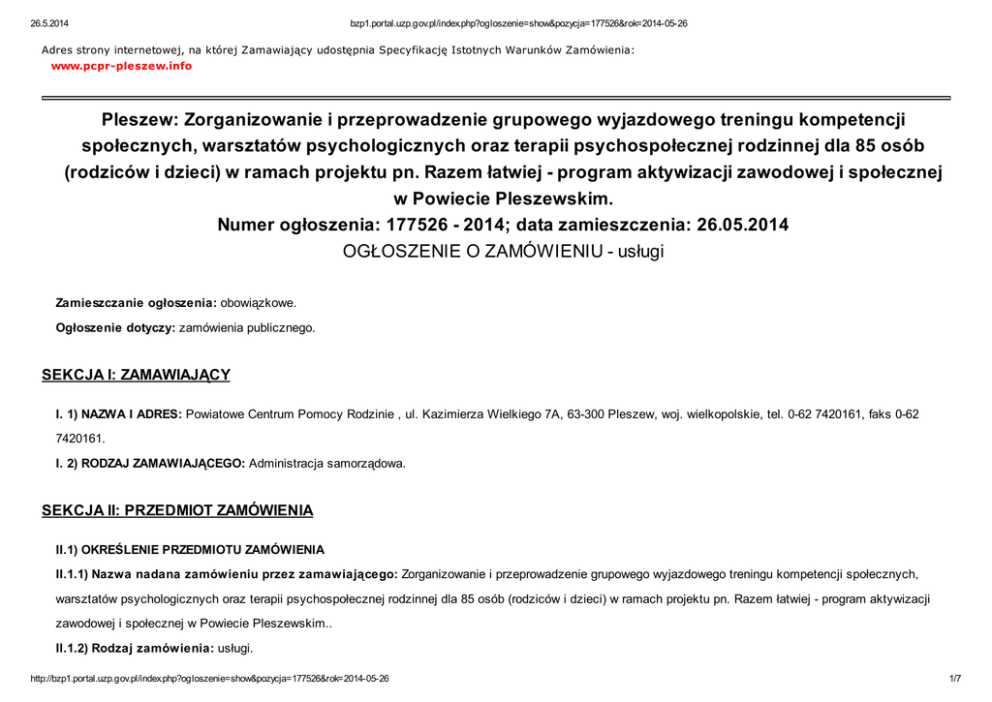 26.5.2014 bzp1.portal.uzp.gov.pl/index.php?ogloszenie=show&pozycja=177526&rok=2014-05-26 Adres strony internetowej, na której Zamawiający udostępnia Specyfikację Istotnych Warunków Zamówienia: www.pcpr-pleszew.info Pleszew: Zorganizowanie i przeprowadzenie grupowego wyjazdowego treningu kompetencji społecznych, warsztatów psychologicznych oraz terapii psychospołecznej rodzinnej dla 85 osób (rodziców i dzieci) w ramach projektu pn. Razem łatwiej - program aktywizacji zawodowej i społecznej w Powiecie Pleszewskim. Numer ogłoszenia: 177526 - 2014; data zamieszczenia: 26.05.2014 OGŁOSZENIE O ZAMÓWIENIU - usługi Zamieszczanie ogłoszenia: obowiązkowe. Ogłoszenie dotyczy: zamówienia publicznego. SEKCJA I: ZAMAWIAJĄCY I. 1) NAZWA I ADRES: Powiatowe Centrum Pomocy Rodzinie , ul. Kazimierza Wielkiego 7A, 63-300 Pleszew, woj. wielkopolskie, tel. 0-62 7420161, faks 0-62 7420161. I. 2) RODZAJ ZAMAWIAJĄCEGO: Administracja samorządowa. SEKCJA II: PRZEDMIOT ZAMÓWIENIA II.1) OKREŚLENIE PRZEDMIOTU ZAMÓWIENIA II.1.1) Nazwa nadana zamówieniu przez zamawiającego: Zorganizowanie i przeprowadzenie grupowego wyjazdowego treningu kompetencji społecznych, warsztatów psychologicznych oraz terapii psychospołecznej rodzinnej dla 85 osób (rodziców i dzieci) w ramach projektu pn. Razem łatwiej - program aktywizacji zawodowej i społecznej w Powiecie Pleszewskim.. II.1.2) Rodzaj zamówienia: usługi. http://bzp1.portal.uzp.gov.pl/index.php?ogloszenie=show&pozycja=177526&rok=2014-05-26 1/7 26.5.2014 bzp1.portal.uzp.gov.pl/index.php?ogloszenie=show&pozycja=177526&rok=2014-05-26 II.1.4) Określenie przedmiotu oraz wielkości lub zakresu zamówienia: 1. Przedmiotem zamówienia jest zorganizowanie i przeprowadzenie grupowego wyjazdowego treningu kompetencji społecznych, warsztatów psychologicznych oraz terapii psychospołecznej rodzinnej dla 85 osób ( 30 rodziców zastępczych oraz 5 dzieci lub rodziców biologicznych i 50 dzieci przysposobionych ) w ramach projektu pn. Razem Łatwiej - program aktywizacji zawodowej i społecznej w Powiecie Pleszewskim. Wszystkie treningi, warsztaty i terapie zrealizowane zostaną łącznie w ramach jednego wyjazdu.2. Zakres zamówienia obejmuje zorganizowanie i przeprowadzenie:1).Treningu kompetencji społecznych w zakresie komunikacji partnerskiej;2).Treningu kompetencji społecznych w zakresie rozwoju kompetencji rodzicielskich;3).Warsztatów psychologicznych - relaksacyjnych dla rodziców i dzieci z wykorzystaniem ćwiczeń dotykowych;4). Warsztatów psychologicznych treningu zastępowania agresji dla rodziców; 5).Terapii psychospołecznej - rodzinnej, w zakresie emocji, możliwości i ograniczeń. 3. Wykonawca zobowiązany będzie do:1). zapewnienia transportu grupy z miejscowości Pleszew na miejsce zajęć i z powrotem;2). zapewnienia zakwaterowania w hotelu / ośrodku w miejscowości nadmorskiej, w odległości maksymalnie 1,5 km od morza; 3). zapewnienia pełnego wyżywienia grupy podczas pobytu; 4). zapewnienia korzystania podczas zajęć z sali konferencyjnej wyposażonej w sprzęt audio- video, rzutnik multimedialny, ekran; 5).zapewnienia kadry posiadającej odpowiednie wykształcenie, doświadczenie zawodowe i uprawnienia; 6). zapewnienia uczestnikom podczas pobytu w ramach czasu wolnego minimum dwóch zajęć o charakterze integracyjno - rozrywkowym (w różnych dniach), aktywizujących dzieci i rodziców;7). zapewnienia opieki nad dziećmi na czas realizacji zajęć / warsztatów dla rodziców; 8). przygotowania programu zajęć / warsztatów, w oparciu o ramowe wytyczne zawarte w opisie przedmiotu zamówienia; 9). bieżącego prowadzenia dokumentacji przebiegu organizowanych zajęć; 10).zapewnienia nadzoru wewnętrznego;11). zapewnienia dla każdego uczestnika zajęć materiałów dydaktycznych;12). przeprowadzenia anonimowej ankiety oceny zajęć przez uczestników;13).wydania zaświadczeń lub innych dokumentów (certyfikatów), potwierdzających ukończenie poszczególnych zajęć; 14). Przedłożenia Zamawiającemu wraz z rozliczeniem wykonanych usług analizy badania opinii uczestników zajęć (ankiet oraz zestawień zbiorczych, dokonanych na podstawie ankiet oceniających zajęcia) oraz dokumentacji fotograficznej w formie papierowej (zdjęcia) oraz elektronicznej - płyta CD / pendrive. 4. Zamawiający zapewnia udział 2 pracowników PCPR (specjalistów pracy z rodziną, pracowników Sekcji ds. Pieczy Zastępczej).Wykonawca zapewni pracownikom PCPR pobyt na takich samych warunkach jak uczestnikom.. II.1.6) Wspólny Słownik Zamówień (CPV): 80.50.00.00-9, 80.57.00.00-0. II.1.7) Czy dopuszcza się złożenie oferty częściowej: nie. II.1.8) Czy dopuszcza się złożenie oferty wariantowej: nie. II.2) CZAS TRWANIA ZAMÓWIENIA LUB TERMIN WYKONANIA: Okres w dniach: 10. http://bzp1.portal.uzp.gov.pl/index.php?ogloszenie=show&pozycja=177526&rok=2014-05-26 2/7 26.5.2014 bzp1.portal.uzp.gov.pl/index.php?ogloszenie=show&pozycja=177526&rok=2014-05-26 SEKCJA III: INFORMACJE O CHARAKTERZE PRAWNYM, EKONOMICZNYM, FINANSOWYM I TECHNICZNYM III.1) WADIUM Informacja na temat wadium: Zamawiający nie wymaga wniesienia wadium. III.2) ZALICZKI przewiduje się udzielenie zaliczek na poczet wykonania zamówienia III.3) WARUNKI UDZIAŁU W POSTĘPOWANIU ORAZ OPIS SPOSOBU DOKONYWANIA OCENY SPEŁNIANIA TYCH WARUNKÓW III. 3.1) Uprawnienia do wykonywania określonej działalności lub czynności, jeżeli przepisy prawa nakładają obowiązek ich posiadania Opis sposobu dokonywania oceny spełniania tego warunku Wykonawca musi być instytucją szkoleniową, musi posiadać aktualny na 2014 r. wpis do rejestru instytucji szkoleniowych, prowadzony przez Wojewódzki Urząd Pracy, właściwy ze względu na siedzibę instytucji szkoleniowej, w rozumieniu art. 20 ustawy z dnia 20 kwietnia 2004 r. o promocji zatrudnienia i instytucjach rynku pracy. Zamawiający dokona oceny spełnienia w.w warunku na podstawie dokumentów załączonych do oferty. III.3.2) Wiedza