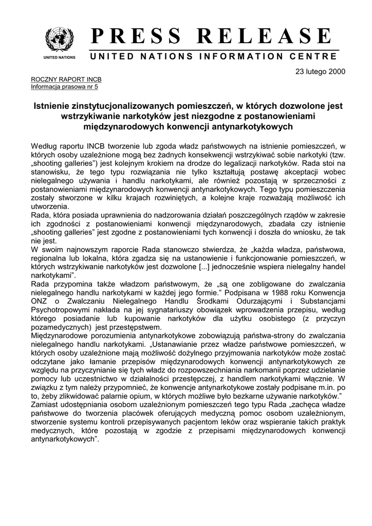 PRESS RELEASE UNITED NATIONS UNITED NATIONS INFORMATION CENTRE 23 lutego 2000 ROCZNY RAPORT INCB Informacja prasowa nr 5 Istnienie zinstytucjonalizowanych pomieszczeń, w których dozwolone jest wstrzykiwanie narkotyków jest niezgodne z postanowieniami międzynarodowych konwencji antynarkotykowych Według raportu INCB tworzenie lub zgoda władz państwowych na istnienie pomieszczeń, w których osoby uzależnione mogą bez żadnych konsekwencji wstrzykiwać sobie narkotyki (tzw. „shooting galleries”) jest kolejnym krokiem na drodze do legalizacji narkotyków. Rada stoi na stanowisku, że tego typu rozwiązania nie tylko kształtują postawę akceptacji wobec nielegalnego używania i handlu narkotykami, ale również pozostają w sprzeczności z postanowieniami międzynarodowych konwencji antynarkotykowych. Tego typu pomieszczenia zostały stworzone w kilku krajach rozwiniętych, a kolejne kraje rozważają możliwość ich utworzenia. Rada, która posiada uprawnienia do nadzorowania działań poszczególnych rządów w zakresie ich zgodności z postanowieniami konwencji międzynarodowych, zbadała czy istnienie „shooting galleries” jest zgodne z postanowieniami tych konwencji i doszła do wniosku, że tak nie jest. W swoim najnowszym raporcie Rada stanowczo stwierdza, że „każda władza, państwowa, regionalna lub lokalna, która zgadza się na ustanowienie i funkcjonowanie pomieszczeń, w których wstrzykiwanie narkotyków jest dozwolone [...] jednocześnie wspiera nielegalny handel narkotykami”. Rada przypomina także władzom państwowym, że „są one zobligowane do zwalczania nielegalnego handlu narkotykami w każdej jego formie.” Podpisana w 1988 roku Konwencja ONZ o Zwalczaniu Nielegalnego Handlu Środkami Odurzającymi i Substancjami Psychotropowymi nakłada na jej sygnatariuszy obowiązek wprowadzenia przepisu, według którego posiadanie lub kupowanie narkotyków dla użytku osobistego (z przyczyn pozamedycznych) jest przestępstwem. Międzynarodowe porozumienia antynarkotykowe zobowiązują państwa-strony do zwalczania nielegalnego handlu narkotykami. „Ustanawianie przez władze państwowe pomieszczeń, w których osoby uzależnione mają możliwość dożylnego przyjmowania narkotyków może zostać odczytane jako łamanie przepisów międzynarodowych konwencji antynarkotykowych ze względu na przyczynianie się tych władz do rozpowszechniania narkomanii poprzez udzielanie pomocy lub uczestnictwo w działalności przestępczej, z handlem narkotykami włącznie. W związku z tym należy przypomnieć, że konwencje antynarkotykowe zostały podpisane m.in. po to, żeby zlikwidować palarnie opium, w których możliwe było bezkarne używanie narkotyków.” Zamiast udostępniania osobom uzależnionym pomieszczeń tego typu Rada „zachęca władze państwowe do tworzenia placówek oferujących medyczną pomoc osobom uzależnionym, stworzenie systemu kontroli przepisywanych pacjentom leków oraz wspieranie takich praktyk medycznych, które pozostają w zgodzie z przepisami międzynarodowych konwencji antynarkotykowych”.