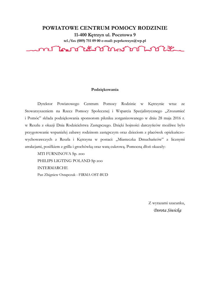 POWIATOWE CENTRUM POMOCY RODZINIE 11-400 Kętrzyn ul. Pocztowa 9 tel./fax (089) 751 09 00 e-mail: [email protected] Podziękowania Dyrektor Powiatowego Centrum Pomocy Rodzinie w Kętrzynie wraz ze Stowarzyszeniem na Rzecz Pomocy Społecznej i Wsparcia Specjalistycznego „Zrozumieć i Pomóc” składa podziękowania sponsorom pikniku zorganizowanego w dniu 28 maja 2016 r. w Reszlu z okazji Dnia Rodzicielstwa Zastępczego. Dzięki hojności darczyńców możliwe było przygotowanie wspaniałej zabawy rodzinom zastępczym oraz dzieciom z placówek opiekuńczowychowawczych z Reszla i Kętrzyna w postaci: „Miasteczka Dmuchańców” z licznymi atrakcjami, posiłkiem z grilla i grochówką oraz watą cukrową. Pomocną dłoń okazały: MTI FURNINOVA Sp. zoo PHILIPS LIGTING POLAND Sp zoo INTERMARCHE Pan Zbigniew Ostapczuk - FIRMA OST-BUD Z wyrazami szacunku, Dorota Siwicka