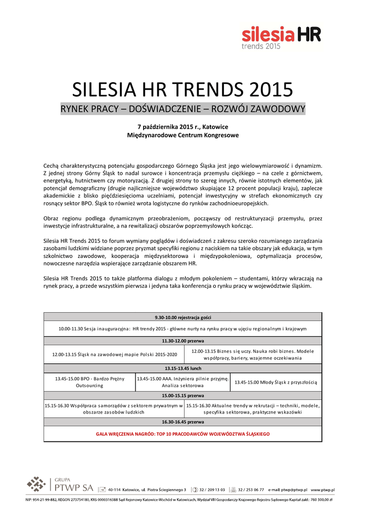 SILESIA HR TRENDS 2015 RYNEK PRACY – DOŚWIADCZENIE – ROZWÓJ ZAWODOWY 7 października 2015 r., Katowice Międzynarodowe Centrum Kongresowe Cechą charakterystyczną potencjału gospodarczego Górnego Śląska jest jego wielowymiarowość i dynamizm. Z jednej strony Górny Śląsk to nadal surowce i koncentracja przemysłu ciężkiego – na czele z górnictwem, energetyką, hutnictwem czy motoryzacją. Z drugiej strony to szereg innych, równie istotnych elementów, jak potencjał demograficzny (drugie najliczniejsze województwo skupiające 12 procent populacji kraju), zaplecze akademickie z blisko pięćdziesięcioma uczelniami, potencjał inwestycyjny w strefach ekonomicznych czy rosnący sektor BPO. Śląsk to również wrota logistyczne do rynków zachodnioeuropejskich. Obraz regionu podlega dynamicznym przeobrażeniom, począwszy od restrukturyzacji przemysłu, przez inwestycje infrastrukturalne, a na rewitalizacji obszarów poprzemysłowych kończąc. Silesia HR Trends 2015 to forum wymiany poglądów i doświadczeń z zakresu szeroko rozumianego zarządzania zasobami ludzkimi widziane poprzez pryzmat specyfiki regionu z naciskiem na takie obszary jak edukacja, w tym szkolnictwo zawodowe, kooperacja międzysektorowa i międzypokoleniowa, optymalizacja procesów, nowoczesne narzędzia wspierające zarządzanie obszarem HR. Silesia HR Trends 2015 to także platforma dialogu z młodym pokoleniem – studentami, którzy wkraczają na rynek pracy, a przede wszystkim pierwsza i jedyna taka konferencja o rynku pracy w województwie śląskim. 9.30-10.00 rejestracja gości 10.00-11.30 Ses ja i naugura cyjna: HR trendy 2015 - główne nurty na rynku pracy w ujęci u regiona l nym i kra jowym 11.30-12.00 przerwa 12.00-13.15 Śląs k na za wodowej ma pie Pol s ki 2015-2020 12.00-13.15 Biznes s ię uczy. Nauka robi bi znes . Model e ws półpra cy, ba ri ery, wza jemne oczekiwa ni a 13.15-13.45 lunch 13.45-15.00 BPO - Ba rdzo Prężny Outsourci ng 13.45-15.00 AAA. Inżyni era pi l ni e przyjmę. Ana li za s ektorowa 13.45-15.00 Młody Śl ąs k z przys złością 15.00-15.15 przerwa 15.15-16.30 Ws półpra ca s amorządów z s ektorem prywa tnym w 15.15-16.30 Aktua l ne trendy w rekrutacji – techniki , model e, obs zarze zas obów l udzki ch s pecyfika s ektorowa , pra ktyczne ws kazówki 16.30-16.45 przerwa GALA WRĘCZENIA NAGRÓD: TOP 10 PRACODAWCÓW WOJEWÓDZTWA ŚLĄSKIEGO 10.00-11.30 Sesja inauguracyjna HR trendy 2015 - główne nurty na rynku pracy w ujęciu regionalnym i krajowym • Nowy Śląsk, nowa Polska – nowa generacja pracownicza? • Rynek pracownika czy pracodawcy? • Migracje zarobkowe • Reforma szkolnictwa – szkolnictwo zawodowe • Europejskie zawody przyszłości 12.00–13.15 Sesja tematyczna Śląsk na zawodowej mapie Polski 2015-2020 • Przewagi wynikające ze specyfiki gospodarczo-demograficznej regionu • Tradycja i nowoczesność • Nowa perspektywa unijna a kapitał ludzki • Prognozy gospodarcze dla regionu • Jak państwo, agendy rządowe i samorząd powinny stymulować krajowy i lokalny rynek pracy? • Problem deficytu kadr 12.00–13.15 sesja tematyczna Biznes się uczy. Nauka robi biznes. Modele współpracy, bariery, wzajemne oczekiwania • Skuteczna współpraca na linii biznes-uczelnia jako warunek rozwoju sektora R&D • Polskie firmy na tle europejskich modeli współpracy akademickiej • Programy stypendialne • Wspólne programy badawcze, dobre praktyki 13.45–15.00 sesja tematyczna BPO – Bardzo Prężny Outsourcing • Masowe rekrutacje do BPO – wyzwania, dobre praktyki • Zatrudnianie obcokrajowców – aspekty prawne, metody rekrutacji, pomoc w przeprowadzce do Polski • HR Pool na Śląsku • Rotacja pracowników w ramach sektora BPO 13.45–15.00 sesja tematyczna AAA. Inżyniera pilnie przyjmę. Analiza sektorowa • Inżynier potrzebny od zaraz – powody niedoboru kadry na rynku pracy • Gradacja priorytetów w celu uzdrowienia rynku pracy inżynierów • Szukanie rozwiązań – jak zatrzymać emigrację, zatrudnianie inżynierów z zagranicy • Współpraca biznesu z uczelniami wyższymi – aktualne potrzeby i wyzwania 13.45–15.00 sesja tematyczna Młody Śląsk z przyszłością • Sytuacja i trendy na rynku pracy woj. śląskiego w kontekście demograficznym (migracje, deglomeracja, absolwenci, struktura zatrudnienia) • Konkurowanie o mieszkańców, pracowników i talenty między polskimi regionami. Atuty i słabości Śląska • Biznes w poszukiwaniu fachowców. • Edukacja w regionie wobec rynku pracy. Uczelnie, przedsiębiorcy, instytucje – meandry współpracy • Rola samorządów i ich partnerów społecznych w kreowaniu pozytywnych tendencji migracyjnych i demograficznych w woj. śląskim • Aktywizacja młodzieży i ruchów miejskich w promocji dobrego wizerunku regionu na rynku pracy • Kultura, jakość życia na Śląsku czynnikami determinującymi wybór redionu na miejsce do życia 15.15-16.30 sesja tematyczna Współpraca samorządów z sektorem prywatnym w obszarze zasobów ludzkich • • • • • • • • Główne założenia programu aktywizacji zawodowej w partnerstwie publiczno-prywatnym i droga ich realizacji Środki finansowe z MPiPS na wspólne działania aktywizacji bezrobotnych Zadania i odpowiedzialność po stronie urzędów, a po stronie agencji. Wspólne cele Współpraca z prywatnymi agencjami w kontekście reformy urzędów pracy Pierwsze efekty współpracy, wnioski Powiatowe urzędy pracy a lokalna przedsiębiorczość Szkolnictwo zawodowe jako element strategii JST w obszarze edukacji i zatrudnienia Lokalne programy wspierające przedsiębiorców 15.15–16.30 sesja tematyczna Aktualne trendy w rekrutacji – techniki, modele, specyfika sektorowa, praktyczne wskazówki • Nowoczesne modele i narzędzia rekrutacji • Jak konkurować na rynku pracy – perspektywa rekrutującego i rekruta • Employer branding • Personal branding • Zabezpieczenie prawno