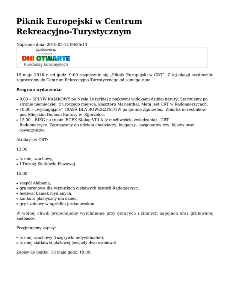 Piknik Europejski w Centrum Rekreacyjno-Turystycznym Napisano dnia: 2016-05-12 09:35:13 15 maja 2016 r. od godz. 9:00 rozpocznie się „Piknik Europejski w CRT”. Z tej okazji serdecznie zapraszamy do Centrum Rekreacyjno-Turystycznego od samego rana. Program wydarzenia: ● ● ● 9.00 – SPŁYW KAJAKOWY po Nysie Łużyckiej z pięknymi widokami dzikiej natury. Startujemy po stronie niemieckiej z uroczego miejsca, klasztoru Marienthal. Metą jest CRT w Radomierzycach. 10.00 – „wymagająca” TRASA DLA ROWERZYSTÓW po gminie Zgorzelec. Zbiórka uczestników pod Miejskim Domem Kultury w Zgorzelcu. 12.00 – BIEG na trasie: ECEK Stalag VIII A (z możliwością zwiedzania) - CRT Radomierzyce. Zapraszamy do udziału chodziarzy, biegaczy, pasjonatów tzw. kijków oraz rowerzystów. Atrakcje w CRT: 12.00 ● ● turniej szachowy, I Turniej Siatkówki Plażowej. 15.00 ● ● ● ● ● zespół Alabama, gra terenowa dla wszystkich ciekawych historii Radomierzyc, festiwal baniek mydlanych, konkurs plastyczny dla dzieci, gry i zabawy w ogródku jordanowskim. W wolnej chwili proponujemy wytchnienie przy gorących i zimnych napojach oraz grillowanej kiełbasce. Przyjmujemy zapisy: ● ● turniej szachowy (rozgrywki indywidualne), turniej siatkówki plażowej (zespoły dwu osobowe). Zapisy do piątku 13 maja godz. 18.00.