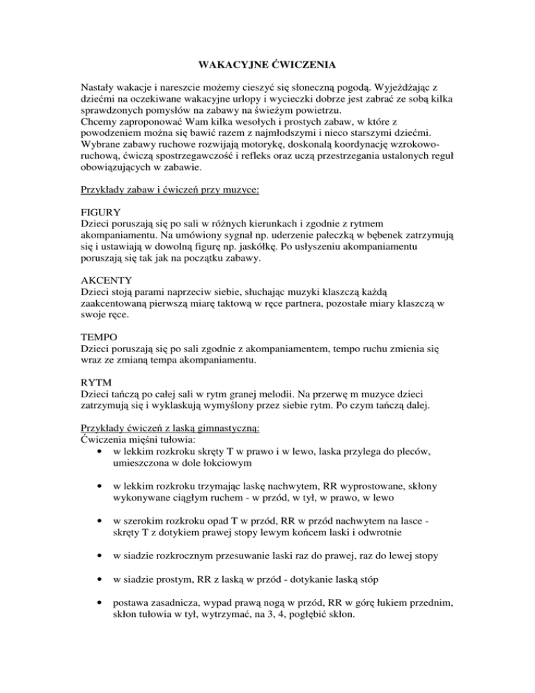 WAKACYJNE ĆWICZENIA Nastały wakacje i nareszcie możemy cieszyć się słoneczną pogodą. Wyjeżdżając z dziećmi na oczekiwane wakacyjne urlopy i wycieczki dobrze jest zabrać ze sobą kilka sprawdzonych pomysłów na zabawy na świeżym powietrzu. Chcemy zaproponować Wam kilka wesołych i prostych zabaw, w które z powodzeniem można się bawić razem z najmłodszymi i nieco starszymi dziećmi. Wybrane zabawy ruchowe rozwijają motorykę, doskonalą koordynację wzrokoworuchową, ćwiczą spostrzegawczość i refleks oraz uczą przestrzegania ustalonych reguł obowiązujących w zabawie. Przykłady zabaw i ćwiczeń przy muzyce: FIGURY Dzieci poruszają się po sali w różnych kierunkach i zgodnie z rytmem akompaniamentu. Na umówiony sygnał np. uderzenie pałeczką w bębenek zatrzymują się i ustawiają w dowolną figurę np. jaskółkę. Po usłyszeniu akompaniamentu poruszają się tak jak na początku zabawy. AKCENTY Dzieci stoją parami naprzeciw siebie, słuchając muzyki klaszczą każdą zaakcentowaną pierwszą miarę taktową w ręce partnera, pozostałe miary klaszczą w swoje ręce. TEMPO Dzieci poruszają się po sali zgodnie z akompaniamentem, tempo ruchu zmienia się wraz ze zmianą tempa akompaniamentu. RYTM Dzieci tańczą po całej sali w rytm granej melodii. Na przerwę m muzyce dzieci zatrzymują się i wyklaskują wymyślony przez siebie rytm. Po czym tańczą dalej. Przykłady ćwiczeń z laską gimnastyczną: Ćwiczenia mięśni tułowia: • w lekkim rozkroku skręty T w prawo i w lewo, laska przylega do pleców, umieszczona w dole łokciowym • w lekkim rozkroku trzymając laskę nachwytem, RR wyprostowane, skłony wykonywane ciągłym ruchem - w przód, w tył, w prawo, w lewo • w szerokim rozkroku opad T w przód, RR w przód nachwytem na lasce skręty T z dotykiem prawej stopy lewym końcem laski i odwrotnie • w siadzie rozkrocznym przesuwanie laski raz do prawej, raz do lewej stopy • w siadzie prostym, RR z laską w przód - dotykanie laską stóp • postawa zasadnicza, wypad prawą nogą w przód, RR w górę łukiem przednim, skłon tułowia w tył, wytrzymać, na 3, 4, pogłębić skłon. Ćwiczenia mięśni grzbietu: • leżenie przodem, RR z przodu nachwytem na lasce - unoszenie RR i klatki piersiowej w górę • w siadzie prostym z N ugiętą w stawie kolanowym, laska ułożona równolegle w przód z laską, druga R oparta na podłożu - unieść biodra ze wznosem R z laską dotykając laską podłoża, ciężar ciała pozostaje na ręce podpartej i ugiętej nodze w leżeniu przodem laska umieszczona za stopami. NN ugięte w stawach kolanowych przybliżanie T do NN poprzez unoszenie klatki piersiowej Ćwiczenia mięśni brzucha: • siad prosty w rozkroku, laska ułożona na stopach, podrzut nogami laski w górę i chwyt rękami przed sobą • w leżeniu tyłem NN ugięte w stawach kolanowych, laska w RR za głową unoszenie klatki piersiowej z jednoczesnym przeniesieniem RR w przód dotykając laską kolana • w leżeniu tyłem, laska przylega do karku, NN ugięte w stawach kolanowych (PN złożona na LN) - przybliżenie lewego końca laski do prawego kolana poprzez skręt T i uniesienie klatki piersiowej • j.w. - zmiana ułożenia (LN na PN), skręty T w prawo • leżenie tyłem, NN w lekkim rozkroku ugięte w stawach kolanowych, laska umieszczona w dole podkolanowym NN, RR nachwytem na lasce, łopatki uniesione - przybliżanie klatki piersiowej do kolan • leżenie tyłem, NN uniesione nad podłożem i ugięte w stawach kolanowych, laska umieszczona j.w. - przybliżanie klatki piersiowej do kolan, łopatki w górze w leżeniu tyłem, łopatki nie przylegają do podłoża, PN wyprostowana w górze, LN ugięta w stawie kolanowym oparta o podłoże, laska w RR z przodu - przybliżenie laski do PN i powrót do pozycji wyjściowej (zmiana ułożenia NN) Ćwiczenia zręczności: • chwyty laski podchwytem i nachwytem rzuconej przed sobą PR, LR i oburącz • próba utrzymania laski na jednym palcu lub dłoni • przerzut laski nad sobą trzymanej z tyłu podchwytem, chwyt z przodu nachwytem • p.w. RR wzniesione w przód, laska ułożona na barkach - opust ramion i chwyt przyboru nachwytem • p.w. leżenie przodem lub tyłem, laska ustawiona pionowo na dłoni stopniowe przejście do postawy i odwrotnie • dwóch ćwiczących ustawionych naprzeciw siebie rzucają sobie laski - jeden górą, drugi dołem • j.w. lecz przybór podajemy prawą i lewą ręką • p.w. j.w. lecz laska ustawiona pionowo przed sobą - na sygnał ćwiczący zmieniają miejsce i łapią przybór partnera KANGURZE SKOKI Zaznaczamy na piasku / boisku / trawie linie startu i mety. Dzieci ustawiają się na linii startu, po kolei wykonują po tyle samo kangurzych skoków w dal. Który kangur doskoczy do mety jako pierwszy? KOLOROWA PIŁKA Ustawiamy się w kole. Rzucając do siebie piłkę każdy mówi jakiś kolor. Umawiamy się, że gdy ktoś powie kolor czarny, nie wolno złapać piłki. Jeśli jednak gracz pomyli się i złapie wtedy piłkę, osoba, która piłkę rzuciła zadaje jej zadanie (oczywiście odpowiednio trudne do wieku gracza), np. stój na 1 nodze aż doliczę do 5, podrzucić 4 razy piłkę wysoko w górę i ją złap, przeturlaj piłkę do bramki, itp. 1, 2, 3, 4, BUM! Ustawiamy się w kole, po kolei podajemy sobie piłkę (w lewą lub prawą stronę), licząc od 1 do 5. Nie wolno jednak powiedzieć 5 – w zamian mówimy BUM! . Osoba, która pomyli się i powie 5 musi – jeśli graczy jest niewielu - wykonać jakieś zadanie lub – jeśli graczy jest więcej – odpada z gry. MINI PODCHODY Osoba dorosła chowa jakiś przedmiot i oznacza narysowanymi na kawałkach papieru / na piasku strzałkami drogę do kryjówki. Dzieci mają za zadanie wytropić kryjówkę, idąc według pozostawionych wskazówek. POJEMNIKI Z WODĄ Ustawiamy się na linii startu w rzędzie. Dzieci mają napełnione wiaderka z wodą, które stawiają na głowie i