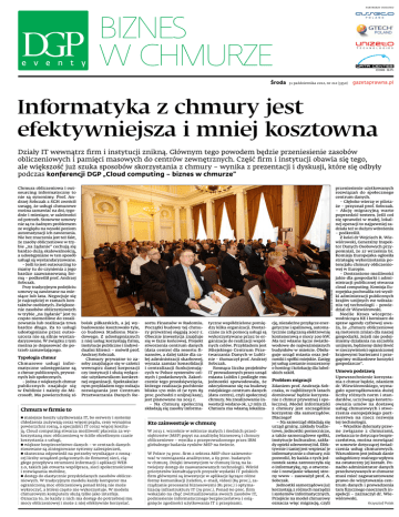 partnerzy dodatku e v e n t y biznes w chmurze Środa 31 października 2012, nr 212 (3350) gazetaprawna.pl Informatyka z chmury jest efektywniejsza i mniej kosztowna Chmura obliczeniowa i outsourcing informatyczny to nie są synonimy. Prof. Andrzej Sobczak z SGH zwrócił uwagę, że usługi chmurowe można zamawiać na dni, tygodnie i miesiące, w zależności od potrzeb. Stosowne umowy nie są tu żadnym problemem ze względu na wysoki poziom automatyzacji ich zawierania. Nie bez znaczenia jest też fakt, że zasoby obliczeniowe w trybie „na żądanie” cechują się bardzo dużą skalowalnością, a udostępniane w ten sposób usługi są wystandaryzowane. – Jeśli to jest outsourcing to mamy tu do czynienia z jego bardzo zaawansowaną formą – podkreślił prof. Andrzej Sobczak. Przy tradycyjnym podejściu umowy są zawierane na miesiące lub lata. Negocjuje się je najczęściej w ramach kontaktów osobistych. Zwiększenie zasobów obliczeniowych w trybie „na żądanie” jest tu często niemożliwe do zrealizowania lub realizacja trwa bardzo długo. Za to usługi udostępniane przez outsourcera nie są silnie wystandaryzowane. W związku z tym można je dopasować do potrzeb zamawiającego. Typologia chmur Chmurowe usługi informatyczne udostępniane są z chmur publicznych, prywatnych lub społecznych. – Jedna z większych chmur publicznych znajduje się w Dublinie i należy do Microsoft. Ma powierzchnię 16 fot. wojciech górski Działy IT wewnątrz firm i instytucji znikną. Głównym tego powodem będzie przeniesienie zasobów obliczeniowych i pamięci masowych do centrów zewnętrznych. Część firm i instytucji obawia się tego, ale większość już szuka sposobów skorzystania z chmury – wynika z prezentacji i dyskusji, które się odbyły podczas konferencji DGP „Cloud computing – biznes w chmurze” boisk piłkarskich, a jej wybudowanie kosztowało tyle, co budowa Stadionu Narodowego. Z udostępnianych z niej usług korzystają firmy, instytucje publiczne i indywidualni klienci – mówił prof. Andrzej Sobczak. Chmury prywatne to zasoby znajdujące się w całości wewnątrz danej korporacji czy instytucji i służą wyłącznie użytkownikom konkretnej organizacji. Spektakularnym przykładem tego rodzaju rozwiązania jest Centrum Przetwarzania Danych Re- Chmura w firmie to n mniejsze koszty użytkowania IT, bo serwery i systemy chłodzenia zużywają coraz więcej prądu, ceny wynajmu powierzchni rosną, a specjaliści IT coraz więcej kosztują. Cloud computing stwarza możliwość płacenia za wykorzystaną moc obliczeniową w ściśle określonym czasie korzystania z usługi, n większe bezpieczeństwo danych – w centrach danych stosowane są zintegrowane systemy zabezpieczeń, n skuteczna odpowiedź na potrzeby wynikające z rosnącej liczby urządzeń połączonych do firmowej sieci, ciągłego przepływu strumieni informacji i aplikacji WEB 2.0, takich jak otwarta współpraca, sieci społecznościowe i rozwiązania mobilne, n dostęp do elastycznie przydzielanych zasobów obliczeniowych. W tradycyjnym modelu każdy komputer ma ograniczoną moc obliczeniową ponad którą nie może wykroczyć, a której często nie wykorzystuje. W modelu chmurowym komputery służą tylko jako interfejs. Oznacza to, że każdy z nich ma dostęp do potrzebnej mu mocy obliczeniowej i może z niej efektywnie korzystać. sortu Finansów w Radomiu. Początki budowy tej chmury prywatnej sięgają 2007 r. Obecnie inwestycja znajduje się w fazie końcowej. Projekt stworzenia centrum danych (data centre) dla resortu finansów, a dalej także dla całej administracji skarbowej, wyraża zamiar konsolidacji i centralizacji funkcjonujących w Polsce systemów celnych i podatkowych. Zakończenie tego przedsięwzięcia, którego realizacja pochłonie blisko 170 mln zł (w tym 85 proc. pochodzi z unijnej kasy), jest planowane na 2013 r. – Na chmurę społeczną składają się zasoby informa- tyczne współdzielone pomiędzy kilka organizacji. Dostarczane za ich pomocą usługi są wykorzystywane przez te organizacje do realizacji wspólnych celów. Przykładem jest Miejskiego Centrum Przetwarzania Danych w Lublinie – tłumaczył prof. Andrzej Sobczak. Rosnąca liczba projektów IT prowadzonych przez urząd miasta Lublin i podległe mu jednostki spowodowała, że zdecydowano się na budowę miejskiego centrum danych (data centre), czyli społecznej chmury. Na zrealizowanie inwestycji wydano ok. 1,7 mln zł. Chmura ma własną lokaliza- Kto zainwestuje w chmurę W 2013 r. wzrośnie w sektorze małych i średnich przedsiębiorstw (MSP) popyt na analitykę biznesową i chmury obliczeniowe – wynika z przeprowadzonego przez IBM globalnego badania rynków MSP na świecie. W Polsce 74 proc. firm z sektora MSP chce zainwestować w rozwiązania analityczne, a 69 proc. badanych w chmurę. Dzięki inwestycjom w chmurę liczą na łatwiejszy dostęp do zaawansowanych technologii. Wśród priorytetów kształtujących przyszłe wydatki IT polskich firm głównymi są inwestycje w aplikacje łączące różne formy komunikacji (telefon, e–mail, video) (84 proc.), zarządzanie procesami biznesowymi (81 proc.) i optymalizację infrastruktury IT (79 proc.). Ponad 60 proc. firm wskazało na chęć zwirtualizowania swoich zasobów IT, podniesienie informatycznego bezpieczeństwa i osiągnięcie zgodności użytkowania IT z przepisami. cję, niezależne przyłącze energetyczne i spalinową, automatycznie załączaną elektrownię kontenerową o mocy 200 kW. Ma też własne łącze światłowodowe do najważniejszych budynków w mieście. Obsługuje urząd miasta oraz jednostki i spółki miejskie. Zasięg jej usług zostanie rozszerzony o hosting i kolokację dla lubelskich szkół. Problem migracji Zdaniem prof. Andrzeja Sobczaka, w najbliższych latach dominować będzie korzystanie z chmur prywatnej i społecznej. Model informatyki z chmury jest szczególnie korzystny dla samorządó