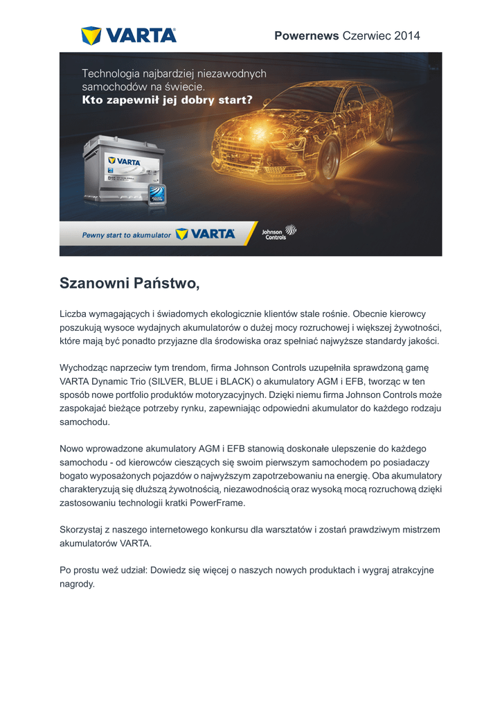 Powernews Czerwiec 2014 Szanowni Państwo, Liczba wymagających i świadomych ekologicznie klientów stale rośnie. Obecnie kierowcy poszukują wysoce wydajnych akumulatorów o dużej mocy rozruchowej i większej żywotności, które mają być ponadto przyjazne dla środowiska oraz spełniać najwyższe standardy jakości. Wychodząc naprzeciw tym trendom, firma Johnson Controls uzupełniła sprawdzoną gamę VARTA Dynamic Trio (SILVER, BLUE i BLACK) o akumulatory AGM i EFB, tworząc w ten sposób nowe portfolio produktów motoryzacyjnych. Dzięki niemu firma Johnson Controls może zaspokajać bieżące potrzeby rynku, zapewniając odpowiedni akumulator do każdego rodzaju samochodu. Nowo wprowadzone akumulatory AGM i EFB stanowią doskonałe ulepszenie do każdego samochodu - od kierowców cieszących się swoim pierwszym samochodem po posiadaczy bogato wyposażonych pojazdów o najwyższym zapotrzebowaniu na energię. Oba akumulatory charakteryzują się dłuższą żywotnością, niezawodnością oraz wysoką mocą rozruchową dzięki zastosowaniu technologii kratki PowerFrame. Skorzystaj z naszego internetowego konkursu dla warsztatów i zostań prawdziwym mistrzem akumulatorów VARTA. Po prostu weź udział: Dowiedz się więcej o naszych nowych produktach i wygraj atrakcyjne nagrody. Gama produktów motoryzacyjnych VARTA Nowe akumulatory VARTA BLUE DYNAMIC EFB oraz VARTA SILVER DYNAMIC AGM są już dostępne! Wprowadzając nową gamę produktów motoryzacyjnych VARTA, firma Johnson Controls uzupełniła swoje portfolio Dynamic Trio o najnowocześniejsze technologie: Akumulatory VARTA BLUE DYNAMIC EFB i VARTA SILVER DYNAMIC AGM. Dzięki nim możesz zaoferować swoim klientom doskonałe ulepszenie do każdego typu pojazdu. Akumulator VARTA BLUE DYNAMIC EFB Akumulator VARTA BLUE DYNAMIC EFB charakteryzuje się dwukrotnie dłuższą żywotnością w porównaniu do akumulatora konwencjonalnego. To doskonałe rozwiązanie do samochodów o najwyższym zapotrzebowaniu energetycznym, a także samochodów z konwencjonalnym systemem Start-Stop. 2× dłuższa żywotność Dłuższa żywotność w porównaniu do akumulatorów konwencjonalnych. Zaawansowana technologia EFB Technologia VARTA Enhanced Flooded Battery zapewnia niezmiennie wysoką wydajność dla bogato wyposażonych pojazdów. Start - Stop Ready Technologia EFB została zaprojektowana z myślą o pojazdach, które posiadają konwencjonalny zakres funkcjonalności Start-Stop. Bezpieczny i odporny na wycieki Dzięki swojej konstrukcji akumulator ten nie będzie przeciekał, nawet uszkodzony. Przyjazny środowisku Ekologiczna produkcja – do 20% mniejsze zużycie energii i 20% mniejsza emisja gazów cieplarnianych. Program recyklingowy ecosteps. Produkowane w Europie Produkowane zgodnie z najwyższymi standardami europejskimi w zakresie jakości produkcji. VARTA SILVER DYNAMIC AGM Akumulator VARTA SILVER DYNAMIC AGM - wysokiej jakości produkt wyprodukowany w Niemczech - zapewnia najwyższą moc rozruchową, wydajniejszą przewodność oraz trwałość trzykrotnie dłużą niż w przypadku akumulatora konwencjonalnego. Nowy akumulator AGM nadaje się również do pojazdów z zaawansowanym systemem Start-Stop z funkcją odzyskiwania energii hamowania, dzięki czemu klienci otrzymują najnowocześniejszą technologię. 3× dłuższa żywotność Dłuższa żywotność w porównaniu z konwencjonalnymi akumulatorami. Zaawansowana technologia AGM Technologia VARTA Absorbent Glass Mat to akumulatory o wyjątkowej mocy dla wysoko wydajnych systemów elektronicznych i bogato wyposażonych pojazdów. Start-Stop Plus Ready Zaprojektowany z myślą o pojazdach wykorzystujących zaawansowaną technologię Start-Stop z funkcją hamowania rekuperacyjnego. Technologia kratki PowerFrame Akumulatory VARTA to niezawodność nawet w ekstremalnych warunkach I dłuższa żywotność dzięki opatentowanej kratce PowerFrame. Produkowane w Niemczech Projektowane i produkowane zgodnie z najwyższymi standardami w zakresie jakości i precyzji. > Wyszukiwanie akumulatora > Portal Biznesowy A Johnson Controls Inc. Company Johnson Controls Akumulatory Sp. z o.o. Ul. Ceglana 4 40-514 Katowice Polska Tel: 0048 32 608 69 50 51 Fax: 0048 32 209 55 83 E-mail: [email protected]