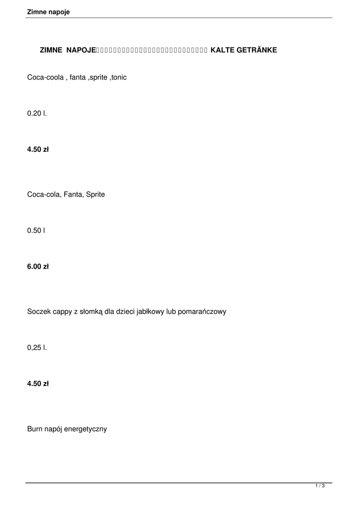 Zimne napoje ZIMNE NAPOJE KALTE GETRÄNKE Coca-coola , fanta ,sprite ,tonic 0.20 l. 4.50 zł Coca-cola, Fanta, Sprite 0.50 l 6.00 zł Soczek cappy z słomką dla dzieci jabłkowy lub pomarańczowy 0,25 l. 4.50 zł Burn napój energetyczny 1/3 Zimne napoje 0,25 l. 7.50 zł Woda kropla Beskidu DELICE 0,33 l. 4.50 zł Nestea 0,25 l. 5.00 zł Red bul 0,25 l. 9.50 zł 2/3 Zimne napoje Sok pomid. wieloowo. Grejpf. czarna porzeczka- w butelce 0,20 l. 4.50 zł Coca-cola zero 0,20 l. 4.50 zł Coca-cola puszka 0.33 l. 5.00 zł 3/3