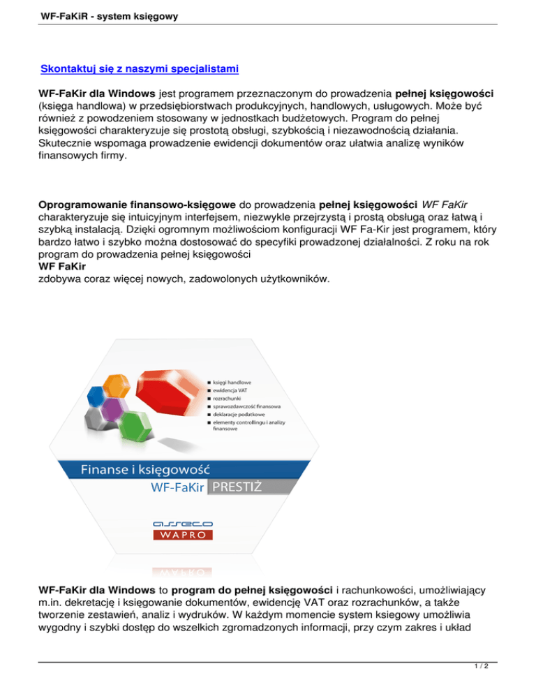 WF-FaKiR - system księgowy Skontaktuj się z naszymi specjalistami WF-FaKir dla Windows jest programem przeznaczonym do prowadzenia pełnej księgowości (księga handlowa) w przedsiębiorstwach produkcyjnych, handlowych, usługowych. Może być również z powodzeniem stosowany w jednostkach budżetowych. Program do pełnej księgowości charakteryzuje się prostotą obsługi, szybkością i niezawodnością działania. Skutecznie wspomaga prowadzenie ewidencji dokumentów oraz ułatwia analizę wyników finansowych firmy. Oprogramowanie finansowo-księgowe do prowadzenia pełnej księgowości WF FaKir charakteryzuje się intuicyjnym interfejsem, niezwykle przejrzystą i prostą obsługą oraz łatwą i szybką instalacją. Dzięki ogromnym możliwościom konfiguracji WF Fa-Kir jest programem, który bardzo łatwo i szybko można dostosować do specyfiki prowadzonej działalności. Z roku na rok program do prowadzenia pełnej księgowości WF FaKir zdobywa coraz więcej nowych, zadowolonych użytkowników. WF-FaKir dla Windows to program do pełnej księgowości i rachunkowości, umożliwiający m.in. dekretację i księgowanie dokumentów, ewidencję VAT oraz rozrachunków, a także tworzenie zestawień, analiz i wydruków. W każdym momencie system ksiegowy umożliwia wygodny i szybki dostęp do wszelkich zgromadzonych informacji, przy czym zakres i układ 1/2 WF-FaKiR - system księgowy wyświetlanych danych może być precyzyjnie określony przez użytkownika, a w razie potrzeby także zapisany w postaci definiowalnych filtrów i ustawień własnych. Użytkownik może ponadto określić i zapamiętać szereg parametrów związanych z pracą samej aplikacji. WF-FaKir jest pod tym względem bardzo elastyczny - użytkownik ma wpływ na szereg opcji związanych zarówno ze stroną merytoryczną działania programu (algorytmy) jak i jego wyglądem. Pozwala to na dostosowanie programu do specyfiki działania firmy jak i osobistych preferencji. Dostęp do wspomnianych wyżej opcji, jak również do danych gromadzonych w programie jest precyzyjnie kontrolowany przy pomocy wielowymiarowego systemu uprawnień. WF-FaKir dla Windows jest funkcjonalną kontynuacją dobrze znanej, obecnej na polskim rynku od kilku lat, wersji DOS-owej programu do księgowania. Jest on wynikiem połączenia dotychczasowych bogatych doświadczeń firmy, jako producenta aplikacji biznesowych, z możliwościami, jakie daje zastosowanie najnowszych technologii informatycznych. Program do pełnej księgowości WF Fa-KiR jest w pełni kompatybilny ze środowiskiem i interfejsem Microsoft Windows - pracuje pod kontrolą Windows 95, 98, 2000, NT, ME, XP, Vista, 7 maksymalnie wykorzystując zalety każdego z tych systemów operacyjnych. Program księgowy WF Fa-Kir, integruje się z innymi produktami Asseco WAPRO, np. WF-Ma g - program magazynowy , WF-GANG - program kadrowy , WF-bEST - ewidencja środków trwałych . 2/2