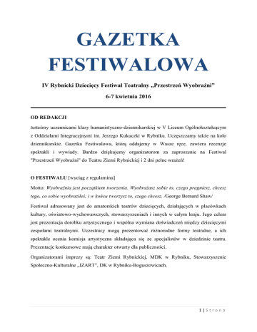 GAZETKA FESTIWALOWA IV Rybnicki Dziecięcy Festiwal Teatralny „Przestrzeń Wyobraźni” 6-7 kwietnia 2016 OD REDAKCJI Jesteśmy uczennicami klasy humanistyczno-dziennikarskiej w V Liceum Ogólnokształcącym z Oddziałami Integracyjnymi im. Jerzego Kukuczki w Rybniku. Uczęszczamy także na koło dziennikarskie. Gazetka Festiwalowa, którą oddajemy w Wasze ręce, zawiera recenzje spektakli i wywiady. Bardzo dziękujemy organizatorom za zaproszenie na Festiwal "Przestrzeń Wyobraźni" do Teatru Ziemi Rybnickiej i 2 dni pełne wrażeń! O FESTIWALU [wyciąg z regulaminu] Motto: Wyobraźnia jest początkiem tworzenia. Wyobrażasz sobie to, czego pragniesz, chcesz tego, co sobie wyobraziłeś, i w końcu tworzysz to, czego chcesz. /George Bernard Shaw/ Festiwal adresowany jest do amatorskich teatrów dziecięcych, działających w placówkach kultury, oświatowo-wychowawczych, stowarzyszeniach i innych w całym kraju. Jego celem jest prezentacja dorobku artystycznego i wspólna wymiana doświadczeń między dziecięcymi zespołami teatralnymi. Uczestnicy mogą prezentować różnorodne formy teatralne, a ich spektakle ocenia komisja artystyczna składająca się ze specjalistów w dziedzinie teatru. Prezentacje konkursowe mają charakter otwarty dla publiczności. Organizatorami imprezy są: Teatr Ziemi Rybnickiej, MDK w Rybniku, Stowarzyszenie Społeczno-Kulturalne „IZART”, DK w Rybniku-Boguszowicach. 1|Strona ZAWARTOŚĆ GAZETKI RECENZJE „A niech to Gęś kopnie” Teatr „Fik-Mik” z Rybnika-Boguszowic ………………………….6 „Chory kotek” Dziecięcy Teatr „Bajdurek” z Rzeszowa………………………………………9 „Dziewczynka z zapałkami” Teatr Lalkowy „Bajki i Baśni” z Bielska-Białej………….......11 „Maestro Mistyfeles” Dziecięcy Teatr „Bajdurek” z Rzeszowa…………………………….10 „Mama – nic” Teatr „Fika” ze Świerklan……………………………………………………...5 „Marzenia Tomaszka” Teatr „Bambino” z Sosnowca…………………………………………8 „My się nie wstydzimy…” Teatr 534 z Kędzierzyna-Koźla…………………………………..5 „O generale Basie i szeregowych ósemkach” Teatr Alis z Wrocławia………………………10 „Pan Walizka” Teatr „Pierrot” ze Świdnicy………………………………………………….11 „Podwórkowe opowieści” Teatr na Cztery Łapy z Marklowic………………………………..4 „Przyjaciel” Teatr Flug z Kędzierzyna-Koźla………………………………………………….7 „Sejdzio i Szejpian” Teatr „Zaczarowana Chata” z Rud Raciborskich………………………..3 „Sztuka latania” Teatr „Świetlik” z Czerwionki-Leszczyn i Lysek……………………............5 „Urodziny w Nigdylandii” Teatr Miodzio z Raciborza………………………………………..3 WYWIADY Jurorzy festiwalu……………………………………………………………………………..12 Teatr „Alis”…………………………………………………………………………………...10 Teatr „Bambino”……………………………………………………………………………….8 Teatr „Fik-Mik”………………………………………………………………………………..7 Teatr „Flug”……………………………………………………………………………………8 Teatr „Zaczarowana Chata”……………………………………………………………………3 WERDYKT JURY..................................................................................................................13 SKŁAD ZESPOŁU REDAKCYJNEGO…………………………………………………..15 2|Strona Urodziny w Nigdylandii, czyli jak z niczego zrobić coś W pierwszej części prezentacji konkursowych IV Rybnickiego Dziecięcego Festiwalu Teatralnego „Przestrzeń Wyobraźni” zaistniał Teatr „Miodzio” i „Małe Miodzio” w spektaklu pod tytułem „Urodziny w Nigdylandii”. Występ ten przedstawiał historię Małego Kota, który bardzo chciał znaleźć swoje miejsce na ziemi i swoją mamę. W przedstawieniu tym było bardzo dużo zwrotów akcji i zmian scenerii. Widowisko to miało na celu pokazanie nam, że czasem ważniejsza od więzów krwi jest miłość tego, pod którego skrzydłami się znajdujemy. Gra aktorska była niezwykle ciekawa, a momentami nawet brawurowa. Widać było ogromną wyobraźnię reżysera, jak i występujących. Scenariusz okazał się być bardzo oryginalny i nietuzinkowy. Dekoracje były doskonale dobrane do akcji. Efekty specjalne, zaprezentowane przez młodych aktorów, zdecydowanie pogłębiały zainteresowanie występem. Sądzę, że warto obejrzeć ten spektakl! /Anna Modrzejewska/ Czarujący spektakl Teatru „Zaczarowana Chata” Zdecydowanie najoryginalniejszym spektaklem festiwalu był „Sejdżio i Szejpian” Teatru „Zaczarowana Chata” z Rud Raciborskich. W przedstawieniu brały udział tylko trzy osoby. Jedna z nich nie była widoczna na scenie, natomiast dwie pozostałe kontrolowały ruch Lalek i wcielały się w bajkowe postacie. Treść sztuki była bardzo obszerna. Jednak wydaje nam się, że to, co w niej najciekawsze, to fakt, iż wszystkie lalki, przebrania oraz rekwizyty zostały wykonane własnoręcznie przez same aktorki. Również dźwięki i muzyka były wykonywane na żywo, poza sceną. Naszym zdaniem właśnie ta oryginalność daje już dużą przewagę nad innymi. Interesujące jest też to, że trzy wspomniane wcześniej osoby tworzą cały teatr i są odpowiedzialne za swoje spektakle od deski do deski. Posiadamy takie informacje, gdyż jedna z nich- Yasmeen- jest naszą koleżanką z klasy, a Teatr „Zaczarowana Chata” to dzieło niesamowitych kobiet: jej mamy, siostry i samej Yasmeen. /Adriana Grędziszewska, Paulina Mura