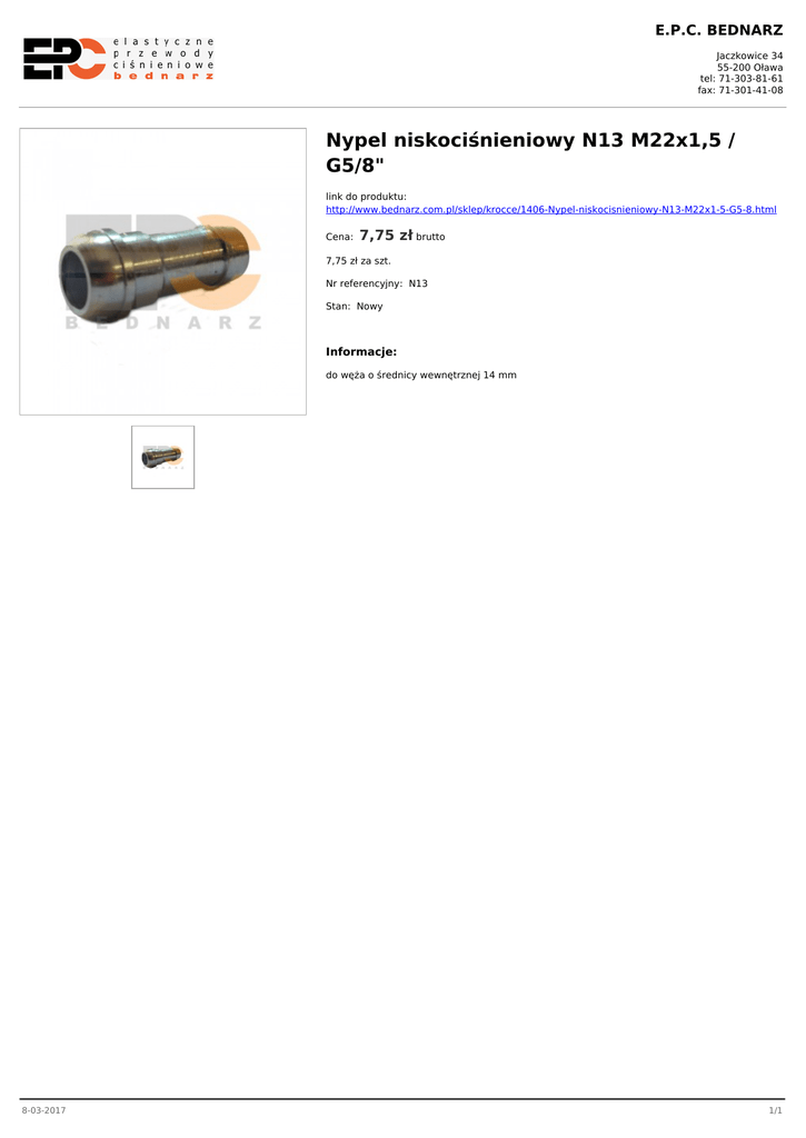 E.P.C. BEDNARZ Jaczkowice 34 55-200 Oława tel: 71-303-81-61 fax: 71-301-41-08 Nypel niskociśnieniowy N13 M22x1,5 / G5/8" link do produktu: http://www.bednarz.com.pl/sklep/krocce/1406-Nypel-niskocisnieniowy-N13-M22x1-5-G5-8.html Cena: 7,75 zł brutto 7,75 zł za szt. Nr referencyjny: N13 Stan: Nowy Informacje: do węża o średnicy wewnętrznej 14 mm 8-03-2017 1/1