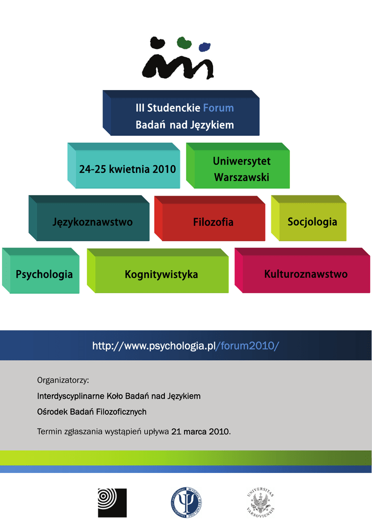 III Studenckie Forum Badań nad Językiem Uniwersytet 24-25 kwietnia 2010 Językoznawstwo Psychologia Warszawski Socjologia Filozofia Kognitywistyka Kulturoznawstwo http://www.psychologia.pl/forum2010/ Organizatorzy: Interdyscyplinarne Koło Badań nad Językiem Ośrodek Badań Filozoficznych Termin zgłaszania wystąpień upływa 21 marca 2010.