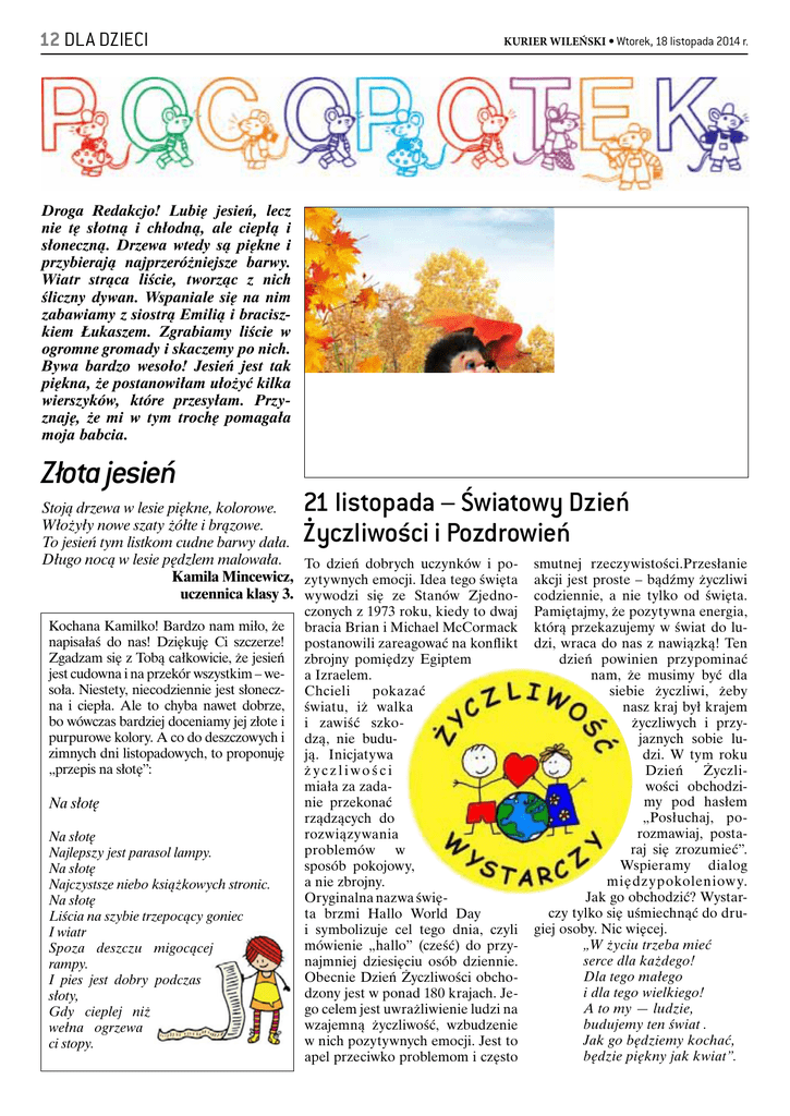 12 DLA DZIECI KURIER WILEŃSKI • Wtorek, 18 listopada 2014 r. Droga Redakcjo! Lubię jesień, lecz nie tę słotną i chłodną, ale ciepłą i słoneczną. Drzewa wtedy są piękne i przybierają najprzeróżniejsze barwy. Wiatr strąca liście, tworząc z nich śliczny dywan. Wspaniale się na nim zabawiamy z siostrą Emilią i braciszkiem Łukaszem. Zgrabiamy liście w ogromne gromady i skaczemy po nich. Bywa bardzo wesoło! Jesień jest tak piękna, że postanowiłam ułożyć kilka wierszyków, które przesyłam. Przyznaję, że mi w tym trochę pomagała moja babcia. Złota jesień 21 listopada – Światowy Dzień Życzliwości i Pozdrowień Stoją drzewa w lesie piękne, kolorowe. Włożyły nowe szaty żółte i brązowe. To jesień tym listkom cudne barwy dała. Długo nocą w lesie pędzlem malowała. To dzień dobrych uczynków i poKamila Mincewicz, zytywnych emocji. Idea tego święta uczennica klasy 3. wywodzi się ze Stanów ZjednoKochana Kamilko! Bardzo nam miło, że napisałaś do nas! Dziękuję Ci szczerze! Zgadzam się z Tobą całkowicie, że jesień jest cudowna i na przekór wszystkim – wesoła. Niestety, niecodziennie jest słoneczna i ciepła. Ale to chyba nawet dobrze, bo wówczas bardziej doceniamy jej złote i purpurowe kolory. A co do deszczowych i zimnych dni listopadowych, to proponuję „przepis na słotę”: Na słotę Na słotę Najlepszy jest parasol lampy. Na słotę Najczystsze niebo książkowych stronic. Na słotę Liścia na szybie trzepocący goniec I wiatr Spoza deszczu migocącej rampy. I pies jest dobry podczas słoty, Gdy cieplej niż wełna ogrzewa ci stopy. czonych z 1973 roku, kiedy to dwaj bracia Brian i Michael McCormack postanowili zareagować na konflikt zbrojny pomiędzy Egiptem a Izraelem. Chcieli pokazać światu, iż walka i zawiść szkodzą, nie budują. Inicjatywa ż yczl iwo śc i miała za zadanie przekonać rządzących do rozwiązywania problemów w sposób pokojowy, a nie zbrojny. Oryginalna nazwa święta brzmi Hallo World Day i symbolizuje cel tego dnia, czyli mówienie „hallo” (cześć) do przynajmniej dziesięciu osób dziennie. Obecnie Dzień Życzliwości obchodzony jest w ponad 180 krajach. Jego celem jest uwrażliwienie ludzi na wzajemną życzliwość, wzbudzenie w nich pozytywnych emocji. Jest to apel przeciwko problemom i często smutnej rzeczywistości.Przesłanie akcji jest proste – bądźmy życzliwi codziennie, a nie tylko od święta. Pamiętajmy, że pozytywna energia, którą przekazujemy w świat do ludzi, wraca do nas z nawiązką! Ten dzień powinien przypominać nam, że musimy być dla siebie życzliwi, żeby nasz kraj był krajem życzliwych i przyjaznych sobie ludzi. W tym roku Dzień Życzliwości obchodzimy pod hasłem „Posłuchaj, porozmawiaj, postaraj się zrozumieć”. Wspieramy dialog międzypokoleniowy. Jak go obchodzić? Wystarczy tylko się uśmiechnąć do drugiej osoby. Nic więcej. „W życiu trzeba mieć serce dla każdego! Dla tego małego i dla tego wielkiego! A to my — ludzie, budujemy ten świat . Jak go będziemy kochać, będzie piękny jak kwiat”. DLA DZIECI 13 KURIER WILEŃSKI • Wtorek, 18 listopada 2014 r. W filharmonii W filharmonii zachowujemy się nieco inaczej niż w kinie. Przeczytajcie – jak! Co wybrać? Słuchanie niektórych dzieł może okazać się za trudne. Będziecie wtedy myśleć, że w filharmonii jest nudno. Na pewno polubicie wizyty tutaj, jeśli wybierzecie się na koncert przeznaczony specjalnie dla młodych słuchaczy. Kiedy kupić bilet? Najlepiej telefonicznie lub przez internet zarezerwujcie bilet odpowiednio wcześniej. Będzie na Was czekał w kasie i odbierzecie go przed koncertem. W co się ubrać? Wizyta w filharmonii to święto – w końcu nie chodzicie tam codziennie! Czekają tam na Was artyści, by wystąpić specjalnie dla Was. Uszanujcie to i ubierzcie się odpowiednio. Nie musi to być balowa suknia czy garnitur. Po prostu ubierzcie się schludnie, elegancko, nie jak na podwórko. Kurtkę, parasol czy dużą torbę zostawcie w szatni. Kiedy przyjść? Postarajcie się być w filharmonii przynajmniej kwadrans przed koncertem. Lepiej przyjść wcześniej, niż się spóźnić. Jeśli się spóźnicie, możecie przegapić koncert. Liczcie się, z tym że możecie nie zostać wpuszczeni na salę (przeszkodzilibyście muzykom i widzom). Wasze miejsce wskaże Wam ktoś z obsługi. Nie przeciskajcie się między rzędami tyłem do siedzących. Czego nie wypada robić w filharmonii? Spóźniać się. Wchodzić w kurtce i z plecakiem. Drzemać. Wiercić się. Głośno rozmawiać. Jeść i pić podczas koncertu – na przekąskę będzie czas podczas przerwy. Korzystać z komórki – robić zdjęcia, nagrywać, rozmawiać czy wysyłać SMS-y. Pamiętajcie, by wyłączyć telefon!. Kiedy klaskać? Wbrew pozorom nie jest to takie oczywiste. Z reguły klaszczemy, kiedy utwór się skończy. Ale przecież utwór może składać się z kilku części. Nie wyskakujemy więc z brawami za każdym razem, kiedy muzycy przestają grać. Możecie sprawdzić w programie, ile części ma utwór i je odliczyć. A najlepiej poczekajcie, aż dyrygent odwróci się do widowni, a dorośli zaczną klaskać – wtedy się do nich przyłączcie. Pokoloruj Zimowe śpiochy: Nietoperz Nietoperze to jedyne latające ssaki. W strefie umiarkowanej nie są one w stanie zdobyć wystarczającej ilości pożywienia. Niektóre gatunki emigrują w cieplejsze strony, inne zapadają w głęboki letarg. Znajdźcie 10 szczegółów, którymi różnią się te obrazki Jednak w okresach ocieplenia mogą się przebudzić, by polować na jakieś owady. Gromadzą się w miejscach snu około października i listopada. Wybierają siedliska o dużej wilgotności powietrza, co chroni je przed utratą wody. Jest wiele gatunków tych ssaków np. Nocek Bechsteina, Nocek Duży, Borowiec Wielki, Podkowiec Duży, Podkowiec Mały, Mroczek Posrebrzany i inne.