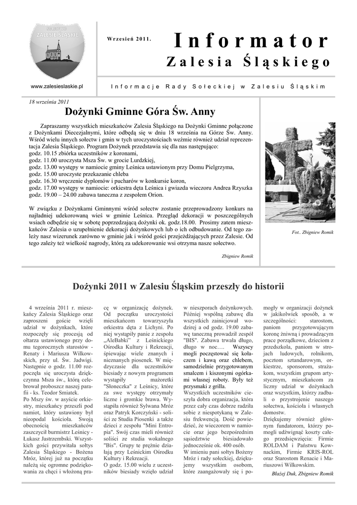 Informator Wrzesień 2011. Zalesia Śląskiego www.zalesieslaskie.pl I n f o r m a c j e R a d y S o ł e c k i e j w Z a l e s i u Ś l ą s k i m 18 września 2011 Dożynki Gminne Góra Św. Anny Zapraszamy wszystkich mieszkańców Zalesia Śląskiego na Dożynki Gminne połączone z Dożynkami Diecezjalnymi, które odbędą się w dniu 18 września na Górze Św. Anny. Wśród wielu innych sołectw i gmin w tych uroczystościach weźmie również udział reprezentacja Zalesia Śląskiego. Program Dożynek przedstawia się dla nas następująco: godz. 10.15 zbiórka uczestników z koronami, godz. 11.00 uroczysta Msza Św. w grocie Lurdzkiej, godz. 13.00 występy w namiocie gminy Leśnica ustawionym przy Domu Pielgrzyma, godz. 15.00 uroczyste przekazanie chleba godz. 16.30 wręczenie dyplomów i pucharów w konkursie koron, godz. 17.00 występy w namiocie: orkiestra dęta Leśnica i gwiazda wieczoru Andrea Rzyszka godz. 19.00 – 24.00 zabawa taneczna z zespołem Orion. W związku z Dożynkami Gminnymi wśród sołectw zostanie przeprowadzony konkurs na najładniej udekorowaną wieś w gminie Leśnica. Przegląd dekoracji w poszczególnych wsiach odbędzie się w sobotę poprzedzającą dożynki ok. godz.18.00. Prosimy zatem mieszkańców Zalesia o uzupełnienie dekoracji dożynkowych lub o ich odbudowanie. Od tego zależy nasz wizerunek zarówno w gminie jak i wśród gości przejeżdżających przez Zalesie. Od tego zależy też wielkość nagrody, którą za udekorowanie wsi otrzyma nasze sołectwo. Fot.. Zbigniew Romik Zbigniew Romik Dożynki 2011 w Zalesiu Śląskim przeszły do historii 4 września 2011 r. mieszkańcy Zalesia Śląskiego oraz zaproszeni goście wzięli udział w dożynkach, które rozpoczęły się procesją od ołtarza ustawionego przy domu tegorocznych starostów Renaty i Mariusza Wilkowskich, przy ul. Św. Jadwigi. Następnie o godz. 11.00 rozpoczęła się uroczysta dziękczynna Msza św., którą celebrował proboszcz naszej parafii - ks. Teodor Smiatek. Po Mszy św. w asyście orkiestry, mieszkańcy przeszli pod namiot, który ustawiony był nieopodal kościoła. Swoją obecnością mieszkańców zaszczycił burmistrz Leśnicy Łukasz Jastrzembski. Wszystkich gości przywitała sołtys Zalesia Śląskiego - Bożena Mróz, której już na początku należą się ogromne podziękowania za chęci i włożoną pra- cę w organizację dożynek. Od początku uroczystości mieszkańcom towarzyszyła orkiestra dęta z Lichyni. Po niej wystąpiły panie z zespołu „AleBabki” z Leśnickiego Ośrodka Kultury i Rekreacji, śpiewając wiele znanych i nieznanych piosenek. W międzyczasie dla uczestników biesiady z nowym programem wystąpiły mażoretki "Słoneczka" z Leśnicy, które za swe występy otrzymały liczne i gromkie brawa. Wystąpiła również Sylwana Mróz oraz Patryk Korczyński - soliści ze Studia Piosenki a także dzieci z zespołu "Mini Entropia". Swój czas mieli również soliści ze studia wokalnego "Bis". Grupy te prężnie działają przy Leśnickim Ośrodku Kultury i Rekreacji. O godz. 15.00 wielu z uczestników biesiady wzięło udział w nieszporach dożynkowych. Później wspólną zabawę dla wszystkich zainicjował wodzirej a od godz. 19.00 zabawę taneczną prowadził zespół "BIS". Zabawa trwała długo, długo w noc…. Wszyscy mogli poczęstować się kołaczem i kawą oraz chlebem, samodzielnie przygotowanym smalcem i kiszonymi ogórkami własnej roboty. Były też przysmaki z grilla. Wszystkich uczestników cieszyła dobra organizacja, która przez cały czas dobrze radziła sobie z niespotykaną w Zalesiu frekwencją. Dość powiedzieć, że wieczorem w namiocie oraz jego bezpośrednim sąsiedztwie biesiadowało jednocześnie ok. 400 osób. W imieniu pani sołtys Bożeny Mróz i rady sołeckiej, dziękujemy wszystkim osobom, które zaangażowały się i po- mogły w organizacji dożynek w jakikolwiek sposób, a w szczególności: starostom, paniom przygotowującym koronę żniwną i prowadzącym prace porządkowe, dzieciom z przedszkola, paniom w strojach ludowych, rolnikom, pocztom sztandarowym, orkiestrze, sponsorom, strażakom, wszystkim grupom artystycznym, mieszkańcom za liczny udział w dożynkach oraz wszystkim, którzy zadbali o przystrojenie naszego sołectwa, kościoła i własnych domostw. Dziękujemy również głównym fundatorom, którzy pomogli udźwignąć koszty całego przedsięwzięcia: Firmie ROLDAM i Państwu Kownackim, Firmie KRIS-ROL oraz Starostom Renacie i Mariuszowi Wilkowskim. Błażej Duk, Zbigniew Romik Informator Zalesia Śląskiego Wrzesień 2011 Spotkania rady sołeckiej i grupy odnowy wsi odbywają się w każdą, pierwszą środę miesiąca w domu spotkań MN o godzinie 20.00. Zebrania są otwarte dla wszystkich zainteresowanych. Serdecznie zapraszamy. Zbigniew Romik Zebranie wiejskie Sołtys Zalesia Śląskiego zawiadamia, że w dniu 26 września 2011 r. o godz.. 20.00 w Domu Spotkań Mniejszości Niemieckiej w Zalesiu Śląskim przy ul. Św. Jadwigi odbędzie się zebranie wiejskie. Program zebrania obejmuje dyskusję nad projektem rozdysponowania funduszu sołeckiego na 2012 rok, uchwalenie projektu przez zebranie wiejskie, dyskusję nad realizacją funduszu w roku 2011 i uchwalenie ewentualnych zmian. W programie także zmiany w radzie sołeckiej. Ze względu na wagę omawianych spraw prosimy mieszkańców o przybycie. Nasze plany na najbliższe miesiące 24 – 25 września – „Szlakami Gór Opawskich” – wycieczka dla amatorów górskich wędrówek z ogniskiem i noclegiem w Pokrzywnej. Uwaga: Spotkanie organizacyjne osób wyjeżdżających - czwartek 22 września o godz. 20.00 w Domu Spotkań. 26 września - zebranie wiejskie nt. funduszu sołeckiego i zmian w radzie sołeckiej. 8 października - „Święto pieczonego ziemniaka” - kolejna biesiada przy ognisku na placu przy byłej stacji kolejowej, udział bezpłatny, bufet we własnym zakresie. 17 października 2011 r. o godz. 15.