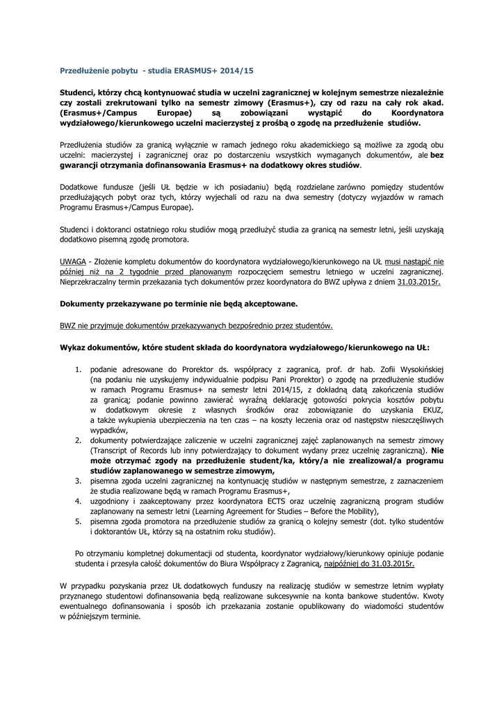 Przedłużenie pobytu - studia ERASMUS+ 2014/15 Studenci, którzy chcą kontynuować studia w uczelni zagranicznej w kolejnym semestrze niezależnie czy zostali zrekrutowani tylko na semestr zimowy (Erasmus+), czy od razu na cały rok akad. (Erasmus+/Campus Europae) są zobowiązani wystąpić do Koordynatora wydziałowego/kierunkowego uczelni macierzystej z prośbą o zgodę na przedłużenie studiów. Przedłużenia studiów za granicą wyłącznie w ramach jednego roku akademickiego są możliwe za zgodą obu uczelni: macierzystej i zagranicznej oraz po dostarczeniu wszystkich wymaganych dokumentów, ale bez gwarancji otrzymania dofinansowania Erasmus+ na dodatkowy okres studiów. Dodatkowe fundusze (jeśli UŁ będzie w ich posiadaniu) będą rozdzielane zarówno pomiędzy studentów przedłużających pobyt oraz tych, którzy wyjechali od razu na dwa semestry (dotyczy wyjazdów w ramach Programu Erasmus+/Campus Europae). Studenci i doktoranci ostatniego roku studiów mogą przedłużyć studia za granicą na semestr letni, jeśli uzyskają dodatkowo pisemną zgodę promotora. UWAGA - Złożenie kompletu dokumentów do koordynatora wydziałowego/kierunkowego na UŁ musi nastąpić nie później niż na 2 tygodnie przed planowanym rozpoczęciem semestru letniego w uczelni zagranicznej. Nieprzekraczalny termin przekazania tych dokumentów przez koordynatora do BWZ upływa z dniem 31.03.2015r. Dokumenty przekazywane po terminie nie będą akceptowane. BWZ nie przyjmuje dokumentów przekazywanych bezpośrednio przez studentów. Wykaz dokumentów, które student składa do koordynatora wydziałowego/kierunkowego na UŁ: 1. 2. 3. 4. 5. podanie adresowane do Prorektor ds. współpracy z zagranicą, prof. dr hab. Zofii Wysokińskiej (na podaniu nie uzyskujemy indywidualnie podpisu Pani Prorektor) o zgodę na przedłużenie studiów w ramach Programu Erasmus+ na semestr letni 2014/15, z dokładną datą zakończenia studiów za granicą; podanie powinno zawierać wyraźną deklarację gotowości pokrycia kosztów pobytu w dodatkowym okresie z własnych środków oraz zobowiązanie do uzyskania EKUZ, a także wykupienia ubezpieczenia na ten czas – na koszty leczenia oraz od następstw nieszczęśliwych wypadków, dokumenty potwierdzające zaliczenie w uczelni zagranicznej zajęć zaplanowanych na semestr zimowy (Transcript of Records lub inny potwierdzający to dokument wydany przez uczelnię zagraniczną). Nie może otrzymać zgody na przedłużenie student/ka, który/a nie zrealizował/a programu studiów zaplanowanego w semestrze zimowym, pisemna zgoda uczelni zagranicznej na kontynuację studiów w następnym semestrze, z zaznaczeniem że studia realizowane będą w ramach Programu Erasmus+, uzgodniony i zaakceptowany przez koordynatora ECTS oraz uczelnię zagraniczną program studiów zaplanowany na semestr letni (Learning Agreement for Studies – Before the Mobility), pisemna zgoda promotora na przedłużenie studiów za granicą o kolejny semestr (dot. tylko studentów i doktorantów UŁ, którzy są na ostatnim roku studiów). Po otrzymaniu kompletnej dokumentacji od studenta, koordynator wydziałowy/kierunkowy opiniuje podanie studenta i przesyła całość dokumentów do Biura Współpracy z Zagranicą, najpóźniej do 31.03.2015r. W przypadku pozyskania przez UŁ dodatkowych funduszy na realizację studiów w semestrze letnim wypłaty przyznanego studentowi dofinansowania będą realizowane sukcesywnie na konta bankowe studentów. Kwoty ewentualnego dofinansowania i sposób ich przekazania zostanie opublikowany do wiadomości studentów w późniejszym terminie.