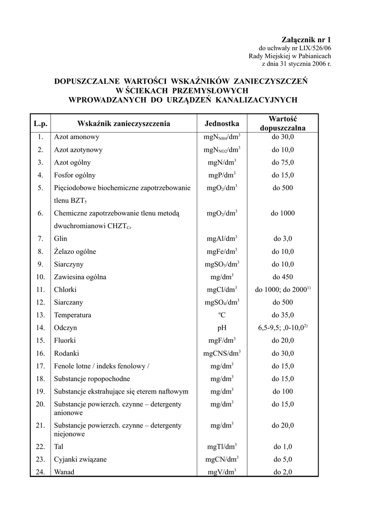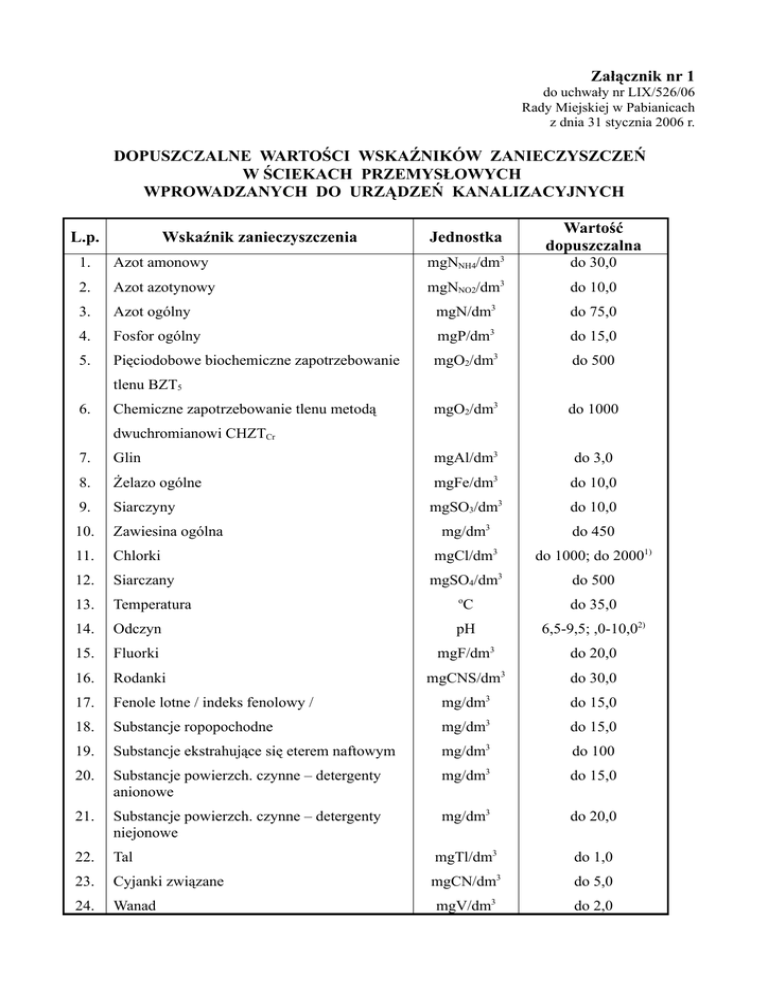 Załącznik nr 1 do uchwały nr LIX/526/06 Rady Miejskiej w Pabianicach z dnia 31 stycznia 2006 r. DOPUSZCZALNE WARTOŚCI WSKAŹNIKÓW ZANIECZYSZCZEŃ W ŚCIEKACH PRZEMYSŁOWYCH WPROWADZANYCH DO URZĄDZEŃ KANALIZACYJNYCH L.p. Wskaźnik zanieczyszczenia Jednostka Wartość dopuszczalna 1. Azot amonowy mgNNH4/dm3 do 30,0 2. Azot azotynowy mgNNO2/dm3 do 10,0 3. Azot ogólny mgN/dm3 do 75,0 4. Fosfor ogólny mgP/dm3 do 15,0 5. Pięciodobowe biochemiczne zapotrzebowanie mgO2/dm3 do 500 mgO2/dm3 do 1000 tlenu BZT5 6. Chemiczne zapotrzebowanie tlenu metodą dwuchromianowi CHZTCr 7. Glin mgAl/dm3 do 3,0 8. Żelazo ogólne mgFe/dm3 do 10,0 9. Siarczyny mgSO3/dm3 do 10,0 10. Zawiesina ogólna mg/dm3 do 450 11. Chlorki mgCl/dm3 do 1000; do 20001) 12. Siarczany mgSO4/dm3 do 500 13. Temperatura o C do 35,0 14. Odczyn pH 6,5-9,5; ,0-10,02) 15. Fluorki mgF/dm3 do 20,0 16. Rodanki mgCNS/dm3 do 30,0 17. Fenole lotne / indeks fenolowy / mg/dm3 do 15,0 18. Substancje ropopochodne mg/dm3 do 15,0 19. Substancje ekstrahujące się eterem naftowym mg/dm3 do 100 20. Substancje powierzch. czynne – detergenty anionowe mg/dm3 do 15,0 21. Substancje powierzch. czynne – detergenty niejonowe mg/dm3 do 20,0 22. Tal mgTl/dm3 do 1,0 23. Cyjanki związane mgCN/dm3 do 5,0 24. Wanad mgV/dm3 do 2,0 25. Tytan mgTi/dm3 do 2,0 26. Selen mgSe/dm3 do 1,0 27. Molibden mgMo/dm3 do 1,0 28. Kobalt mgCo/dm3 do 1,0 29. Cynk mgZn/dm3 do 2,0 30. Cyna mgSn/dm3 do 2,0 31. Bor mgB/dm3 do 10,0 32. Beryl mgBe/dm3 do 1,0 33. Bar mgBa/dm3 do 5,0 34. Siarczki mgS/dm3 do 1,0 35. Cyjanki wolne mgCN/dm3 do 0,50 36. Chlor pozostały całkowity mgCl2/dm3 do 2,0; do 4,03) 37. Chlor pozostały wolny mgCl2/dm3 do 0,5; do 1,53) 38. Srebro mgAg/dm3 do 0,50 39. Ołów mgPb/dm3 do 0,20 40. Nikiel mgNi/dm3 do 0,15 41. Miedź mgCu/dm3 do 0,10 42. Chrom ogólny mgCr/dm3 do 0,10 43. Chrom +6 mgCr/dm3 do 0,10 44. Arsen mgAs/dm3 do 0,50 45 Antymon mgSb/dm3 do 0,50 46. Kadm mgCd/dm3 do 0,05 47. Rtęć mgHg/dm3 do 0,01 1) 3 Przy stężeniu siarczanów do 100 mgSO4/dm ; Dla ścieków zawierających cyjanki lub siarczki; 3) Dla zdezynfekowanych ścieków ze szpitali i sanatoriów oraz zakładów weterynaryjnych. 2)