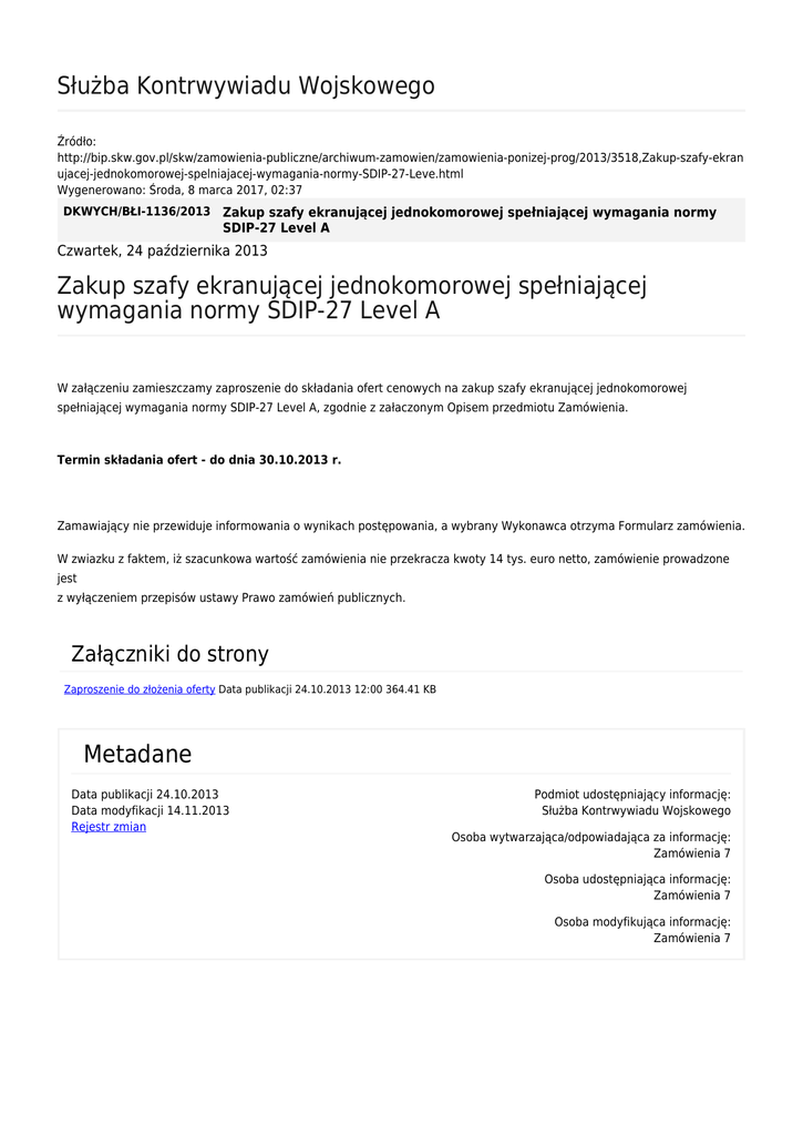 Służba Kontrwywiadu Wojskowego Źródło: http://bip.skw.gov.pl/skw/zamowienia-publiczne/archiwum-zamowien/zamowienia-ponizej-prog/2013/3518,Zakup-szafy-ekran ujacej-jednokomorowej-spelniajacej-wymagania-normy-SDIP-27-Leve.html Wygenerowano: Środa, 8 marca 2017, 02:37 DKWYCH/BŁI-1136/2013 Zakup szafy ekranującej jednokomorowej spełniającej wymagania normy SDIP-27 Level A Czwartek, 24 października 2013 Zakup szafy ekranującej jednokomorowej spełniającej wymagania normy SDIP-27 Level A W załączeniu zamieszczamy zaproszenie do składania ofert cenowych na zakup szafy ekranującej jednokomorowej spełniającej wymagania normy SDIP-27 Level A, zgodnie z załaczonym Opisem przedmiotu Zamówienia. Termin składania ofert - do dnia 30.10.2013 r. Zamawiający nie przewiduje informowania o wynikach postępowania, a wybrany Wykonawca otrzyma Formularz zamówienia. W zwiazku z faktem, iż szacunkowa wartość zamówienia nie przekracza kwoty 14 tys. euro netto, zamówienie prowadzone jest z wyłączeniem przepisów ustawy Prawo zamówień publicznych. Załączniki do strony Zaproszenie do złożenia oferty Data publikacji 24.10.2013 12:00 364.41 KB Metadane Data publikacji 24.10.2013 Data modyfikacji 14.11.2013 Rejestr zmian Podmiot udostępniający informację: Służba Kontrwywiadu Wojskowego Osoba wytwarzająca/odpowiadająca za informację: Zamówienia 7 Osoba udostępniająca informację: Zamówienia 7 Osoba modyfikująca informację: Zamówienia 7