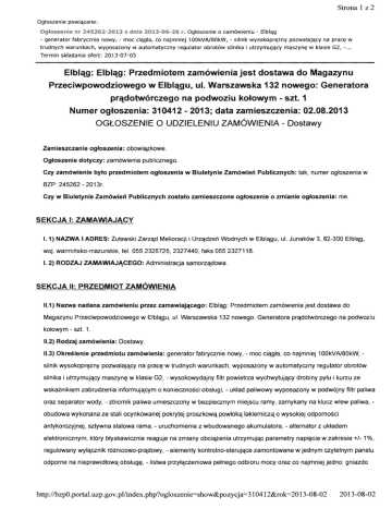 Strona 1 z 2 Og~oszenie powietzane: Ogioszenie nr 245262-2013 z dnia 2013-06-26 r. Og~oszenie 0 zam6wieniu - Elbletg - generator fabryeznie nowy, - moe eietg~a, co najmniej 100kVA/80kW, - silnik wysokopr~zny pozwalajetey na prae~ w trudnyeh warunkaeh, wyposaiony w automatyezny regulator obrot6w silnika i utrzymujetey maszyn~ w klasie G2, - ... Termin sk~adania ofert: 2013-07-05 E1b1ctg: Elb1ctg: przedmiotem zamowienia jest dostawa do Magazynu Przeciwpowodziowego w Elblctgu, ul. Warszawska 132 nowego: Generatora prCldotworczego na podwoziu kofowym - szt. 1 Numer ogfoszenia: 310412 - 2013; data zamieszczenia: 02.08.2013 OGlOSZENIE 0 UDZIELENIU ZAMGWIENIA - Dostawy Zamieszczanie ogloszenia: obowiqzkowe. Ogtoszenie dotyczy: zam6wienia publicznego. Czy zam6wienie byto przedmiotem ogloszenia w Biuletynie Zam6wieri Publicznych: tak, numer og~oszenia w BZP: 245262 - 2013r. Czy w Biuletynie Zam6wieri Publicznych zostalo zamieszczone ogtoszenie 0 zmianie ogtoszenia: nie. SEKCJA I: ZAMAWIAJACY I. 1) NAZWA I AD RES: lumwski Zarzqd Melioracji i Urzqdzen Wodnych w Elblqgu, ul. Junak6w 3, 82-300 Elblqg, woj . warminsko-mazurskie, tel. 0552325725 , 2327440, faks 055 2327118. I. 2) RODZAJ ZAMAWIAJJ\.CEGO: Administracja samorzqdowa. SEKCJA II: PRZEDMIOT ZAMOWIENIA 11.1) Nazwa nadana zam6wieniu przez zamawiajctcego: Elblqg : przedmiotem zam6wienia jest dostawa do Magazynu Przeciwpowodziowego w Elblqgu , ul. Warszawska 132 nowego: Generatora prqdotw6rczego na podwoziu k~owym - szt. 1. 11.2) Rodzaj zam6wienia: Dostawy. 11.3) Okreslenie przedmiotu zam6wienia: generator fabrycznie nowy, - moc ciqgm , co najmniej 100kVN80kW, silnik wysokopr~zny silnika i utrzymujqcy pozwalajq,cy na maszyn~ prac~ w trudnych warunkach, wyposazony w automatyczny regulator obrot6w w klasie G2 , - wysokowydajny filtr powietrza wychwytujqcydrobiny wskaznikiem zabrudzenia informujq,cym 0 koniecznosci obs~ugi, py~u i kurzu ze - uktad paliwowy wyposatony w podw6jny filtr paliwa oraz separator wody , - zbiomik paliwa umieszczony w bezpiecznym miejscu ramy, zamykany na klucz wlew paliwa, obudowa wykonana ze stali ocynkowanej pokrytej proszkowq powrokq, lakierniczq, 0 wysokiej odpornosci antykorozyjnej, sztywna stalowa rama, - uruchomienie z wbudowanego akumulatora, - alternator z elektronicznym, kt6ry regulowany wy~q,cznik b~skawicznie reaguje na zmiany obciqzenia utrzymujqc parametry napi~cia uk~adem w zakresie +/- 1%, r6znicowo-prqdowy, - elementy kontrolno-sterujq,ce zamontowane w jednym czytelnym panelu odporne na nieprawidtowq, obstug~ , - listwa przytqczeniowa p~nego odbioru mocy oraz co najmniej jedno: gniazdo http://bzpO.portal.uzp.gov .pUindex.php?ogloszenie=show&pozycja=31 0412&rok=20 13-08-02 2013-08-02 Strona 2 z 2 tr6jfazowe 16 A, gniazdo tr6jfazowe 32 A, gniazdo jednofazowe 16 A, - podwozie k%we z zaczepem i homologacjq. Zamawiajqcy wymaga do/qczenia stosownych atest6w, certyfikat6w, deklaracji zgodnosci oraz instrukcji j~zyku ob~ugi polskim ... 11.4) Wsp61ny Slownik Zam6wieri (CPV): 31 .12.00.00-3. SEKCJA III: PROCEDURA 111.1) TRYB UOZIELENIA ZAMOWIENIA: Przetarg nieograniczony 111.2) INFORMACJE ADMINISTRACYJNE Zam6wienie dotyczy projektu/programu finansowanego ze srodk6w Unil Europejskiej: nie SEKCJA IV: UDZIELENIE ZAMOWIENIA IV.1) DATA UDZIELENIA ZAMOWIENIA: 02.08.2013. IV.2) LlCZBA OTRZYMANYCH OFERT: 4. IV.3) LlCZBA OORZUCONYCH OFERT: O. IV.4) NAZWA I AORES WYKONAWCY, KTOREMU UDZIELONO ZAMOWIENIA: GENPOWER Sp. z 0.0 ., Buszewo 33 62-045 Pniewy, 62-045 Buszewo 33, krajlwoj. wielkopolskie. IV.5) Szacunkowa wartoSc zam6wienia (bez VAT) : 73170.73 PLN. IV.S) INFORMACJA 0 CENIE WYBRANEJ OFERTY ORAZ 0 OFERTACH Z NAJNIZSZJ\ I NAJWYZSZJ\ CENA. Cena wybranej oferty: 62020,06 Oferta z najniiszct cenct: 62020,061 Oferta z najwyzszct cenct: 67527,00 Waluta: PLN. L Ifl , . IruWSkl http://bzpO.portal.uzp.gov .pllindex.php?ogloszenie=show&pozycja=31 0412&rok=20 13-08-02 20l3-08-02