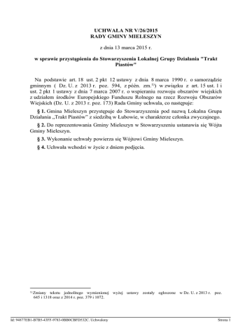 UCHWAŁA NR V/26/2015 RADY GMINY MIELESZYN z dnia 13 marca 2015 r. w sprawie przystąpienia do Stowarzyszenia Lokalnej Grupy Działania "Trakt Piastów" Na podstawie art. 18 ust. 2 pkt 12 ustawy z dnia 8 marca 1990 r. o samorządzie gminnym ( Dz. U. z 2013 r. poz. 594, z późn. zm.1)) w związku z art. 15 ust. 1 i ust. 2 pkt 1 ustawy z dnia 7 marca 2007 r. o wspieraniu rozwoju obszarów wiejskich z udziałem środków Europejskiego Funduszu Rolnego na rzecz Rozwoju Obszarów Wiejskich (Dz. U. z 2013 r. poz. 173) Rada Gminy uchwala, co następuje: § 1. Gmina Mieleszyn przystępuje do Stowarzyszenia pod nazwą Lokalna Grupa Działania „Trakt Piastów” z siedzibą w Łubowie, w charakterze członka zwyczajnego. § 2. Do reprezentowania Gminy Mieleszyn w Stowarzyszeniu ustanawia się Wójta Gminy Mieleszyn. § 3. Wykonanie uchwały powierza się Wójtowi Gminy Mieleszyn. § 4. Uchwała wchodzi w życie z dniem podjęcia. 1) Zmiany tekstu jednolitego wymienionej wyżej ustawy zostały ogłoszone w Dz. U. z 2013 r. poz. 645 i 1318 oraz z 2014 r. poz. 379 i 1072. Id: 94877EB1-B7B5-43FF-9783-0BB0CBFD532C. Uchwalony Strona 1 UZASADNIENIE do uchwały Nr V/26/2015 Rady Gminy Mieleszyn z dnia 13 marca 2015 r. Celem programu LEADER jest przede wszystkim aktywizacja mieszkańców obszarów wiejskich, a także polepszenie zarządzania lokalnymi zasobami i ich waloryzacja. Warunkiem korzystania z tego programu jest utworzenie Lokalnej Grupy Działania (LGD) oraz opracowanie Lokalnej Strategii Rozwoju (LSR), która umożliwi pozyskiwanie środków z UE. LGD ma na celu: - działanie na rzecz zrównoważonego rozwoju obszarów wiejskich; - podejmowanie inicjatyw i działań mających na celu pobudzenie aktywności społeczności lokalnych oraz ich czynny udział w realizacji Lokalnej Strategii Rozwoju; - upowszechnianie i wymianę informacji o inicjatywach związanych z aktywizacją ludności na obszarach wiejskich położonych w obszarze działania LGD; - propagowanie działań na rzecz realizacji LSR w obszarze działania LGD, pozyskiwanie partnerów i źródeł finansowania LSR, w tym z programów pomocowych; - promocja obszarów wiejskich położonych w obszarze działania LGD; - współuczestniczenie w rozwoju obszarów wiejskich, w szczególności leżących na terenie działania LGD; - udzielanie wsparcia mieszkańcom obszaru objętego LSR w zakresie przygotowania projektów i pozyskiwania środków na ich realizację ze źródeł zewnętrznych; - promocja jednostek samorządu terytorialnego, które są członkami LGD. Obszar objęty partnerstwem w ramach LGD "Trakt Piastów", obejmuje obszar wytyczony granicami gmin m.in. Kłecko, Gniezno, Kleszczewo, Łubowo, Pobiedziska, Swarzędz. Siedzibą Stowarzyszenia będzie Łubowo 1, 62-260 Łubowo. W związku z powyższym zasadne staje się podjęcie uchwały w sprawie przystąpienia Gminy Mieleszyn do Lokalnej Grupy Działania „Trakt Piastów”. Id: 94877EB1-B7B5-43FF-9783-0BB0CBFD532C. Uchwalony Strona 1
