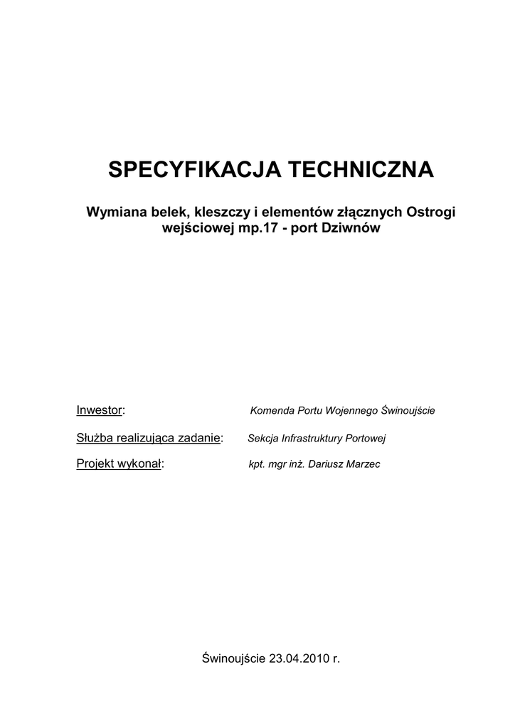 SPECYFIKACJA TECHNICZNA Wymiana belek, kleszczy i elementów złącznych Ostrogi wejściowej mp.17 - port Dziwnów Inwestor: Komenda Portu Wojennego Świnoujście Służba realizująca zadanie: Sekcja Infrastruktury Portowej Projekt wykonał: kpt. mgr inż. Dariusz Marzec Świnoujście 23.04.2010 r. OPIS Ostroga Wejściowa – dł 76m szerokość 4 m Typ konstrukcji – żelbetowa, korytowa nadbudowa wypełniona piaskiem, posadowiona na 4 rzędach pali ( 2 rzędy pale proste, 2 rzędy pale skośne) – pokazano na załączonych rysunkach. Roboty naprawcze Ostrogi wejściowej mp.17 polegają na wymianie belek stalowych – dwa ceowniki 200x75x8,5 umieszczone jeden pod drugim i przymocowane poziomo do zewnętrznego rzędu pali, które stanowią osłonę przeciwlodową oraz brakujących i uszkodzonych kleszczy. Wszystkie elementy podlegające wymianie znajdują się pod lustrem wody.