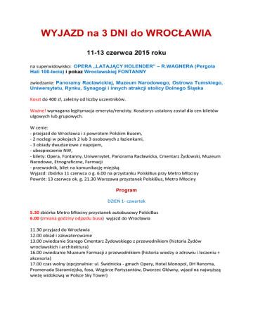 WYJAZD na 3 DNI do WROCŁAWIA 11-13 czerwca 2015 roku na superwidowisko: OPERA „LATAJĄCY HOLENDER” – R.WAGNERA (Pergola Hali 100-lecia) i pokaz Wrocławskiej FONTANNY zwiedzanie: Panoramy Racławickiej, Muzeum Narodowego, Ostrowa Tumskiego, Uniwersytetu, Rynku, Synagogi i innych atrakcji stolicy Dolnego Śląska Koszt do 400 zł, zależny od liczby uczestników. Ważne! wymagana legitymacja emeryta/rencisty. Kosztorys ustalony został dla cen biletów ulgowych lub grupowych. W cenie: - przejazd do Wrocławia i z powrotem Polskim Busem, - 2 noclegi w pokojach 2 lub 3 osobowych z łazienkami, - 3 obiady dwudaniowe z napojem, - ubezpieczenie NW, - bilety: Opera, Fontanny, Uniwersytet, Panorama Racławicka, Cmentarz Żydowski, Muzeum Narodowe, Etnograficzne, Farmacji - przewodnik, bilet na komunikację miejską Wyjazd: zbiórka 11 czerwca o g. 6.00 na przystanku PolskiBus przy Metro Młociny Powrót: 13 czerwca ok. g. 21.30 Warszawa przystanek PolskiBus, Metro Młociny Program DZIEŃ 1- czwartek 5.30 zbiórka Metro Młociny przystanek autobusowy PolskiBus 6.00 (zmiana godziny odjazdu busa) wyjazd do Wrocławia 11.30 przyjazd do Wrocławia 12.00 obiad i zakwaterowanie 13.00 zwiedzanie Starego Cmentarz Żydowskiego z przewodnikiem (historia Żydów wrocławskich i architektura) 16.00 zwiedzanie Muzeum Farmacji z przewodnikiem (historia wiedzy o zdrowiu i leczeniu + akcesoria) 17.00 czas wolny (opcjonalnie: ul. Świdnicka - gmach Opery, Hotel Monopol, DH Renoma, Promenada Staromiejska, fosa, Wzgórze Partyzantów, Dworzec Główny, wjazd na najwyższą wieżę widokową w Polsce Sky Tower) DZIEŃ 2 - piątek 7.45 zbiórka 9.00-16.00/17.00 zwiedzanie Wrocławia z przewodnikiem: dawne fortyfikacje i znaczenie Odry dla Wrocławia, pomnik Jana XXIII, Ostrów Tumski, katedra św. Jan, najstarszy kościół św. Idziego, brama Kluskowa, pomnik Nepomucena, mosty młyńskie, Hala Targowa, pl. Nankiera, katedra grekokatolicka –miejsce pochówku Henryka Pobożnego, kaplica barokowa, Zaułek Ossolińskich, Uniwersytet Wrocławski: Aula Leopoldyna, Oratorium Marianum, kościół barokowy -pieta, freski, Wieża matematyczna, Szermierz, Stare Miasto: jatki, kościół św. Elżbiety, Muzeum Krasnali, fasady kamieniczek na Rynku, Ratusz, kościół Marii Magdaleny - mostek Pokutny, Pl. Solny, Synagoga Pod Białym Bocianem. W przerwie 12.30 – 13.30 obiad. 16.00/17.00 – 20.00 czas wolny 20.00 wyjazd do Hali 100-lecia, poznanie jej historii i architektury 22.00 super widowisko- opera: LATAJĄCY HOLENDER - R. Wagnera, przed spektaklem pokaz Wrocławskiej FONTANNY z muzyką i światłem na Pergoli. DZIEŃ 3 - sobota 7.45 zbiórka 9.00-10.00 Panorama Racławicka, Wzgórze Polskie, Zatoka Gondoli 10.00 – 14.00 czas wolny: opcjonalnie - Muzeum Narodowe/Muzeum Etnograficzne – wstęp w cenie biletu do Panoramy Racławickiej, Ogród Botaniczny lub Ogród Japoński + Centrum Poznawcze Hali 100-lecia lub ZOO + Afrykarium 14.45-15.30 obiad 16.30 wyjazd do Warszawy 21.30 przyjazd do Warszawy Metro Młociny przystanek PolskiBus Koszty dodatkowe - bilety opcjonalne (ulgowy/zwykły): Sky Tower – 5,00/10,00 ZOO + Afrykarium – 12,00/25,00 Ogród Japoński + Centrum Poznawcze Hali 100- lecia – 10,00/14,00 Ogród Botaniczny – 5,00/15,00 W miejscu zakwaterowania kuchnia z wyposażeniem do samodzielnego przygotowania posiłków, można też zamówić indywidualnie posiłki: śniadanie 12 zł i kolacja 17 zł.