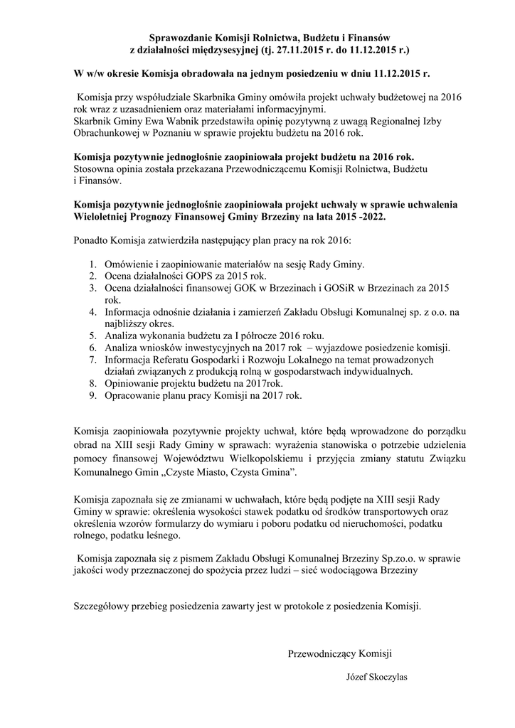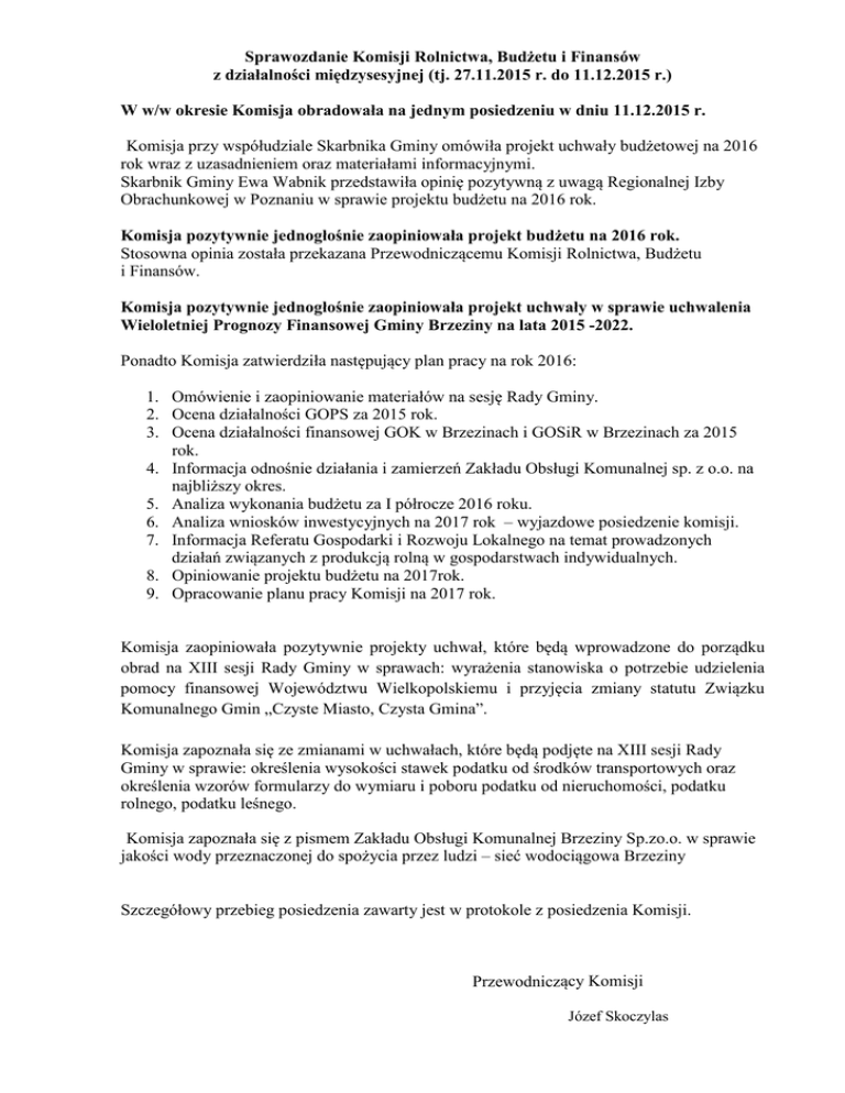 Sprawozdanie Komisji Rolnictwa, Budżetu i Finansów z działalności międzysesyjnej (tj. 27.11.2015 r. do 11.12.2015 r.) W w/w okresie Komisja obradowała na jednym posiedzeniu w dniu 11.12.2015 r. Komisja przy współudziale Skarbnika Gminy omówiła projekt uchwały budżetowej na 2016 rok wraz z uzasadnieniem oraz materiałami informacyjnymi. Skarbnik Gminy Ewa Wabnik przedstawiła opinię pozytywną z uwagą Regionalnej Izby Obrachunkowej w Poznaniu w sprawie projektu budżetu na 2016 rok. Komisja pozytywnie jednogłośnie zaopiniowała projekt budżetu na 2016 rok. Stosowna opinia została przekazana Przewodniczącemu Komisji Rolnictwa, Budżetu i Finansów. Komisja pozytywnie jednogłośnie zaopiniowała projekt uchwały w sprawie uchwalenia Wieloletniej Prognozy Finansowej Gminy Brzeziny na lata 2015 -2022. Ponadto Komisja zatwierdziła następujący plan pracy na rok 2016: 1. Omówienie i zaopiniowanie materiałów na sesję Rady Gminy. 2. Ocena działalności GOPS za 2015 rok. 3. Ocena działalności finansowej GOK w Brzezinach i GOSiR w Brzezinach za 2015 rok. 4. Informacja odnośnie działania i zamierzeń Zakładu Obsługi Komunalnej sp. z o.o. na najbliższy okres. 5. Analiza wykonania budżetu za I półrocze 2016 roku. 6. Analiza wniosków inwestycyjnych na 2017 rok – wyjazdowe posiedzenie komisji. 7. Informacja Referatu Gospodarki i Rozwoju Lokalnego na temat prowadzonych działań związanych z produkcją rolną w gospodarstwach indywidualnych. 8. Opiniowanie projektu budżetu na 2017rok. 9. Opracowanie planu pracy Komisji na 2017 rok. Komisja zaopiniowała pozytywnie projekty uchwał, które będą wprowadzone do porządku obrad na XIII sesji Rady Gminy w sprawach: wyrażenia stanowiska o potrzebie udzielenia pomocy finansowej Województwu Wielkopolskiemu i przyjęcia zmiany statutu Związku Komunalnego Gmin „Czyste Miasto, Czysta Gmina”. Komisja zapoznała się ze zmianami w uchwałach, które będą podjęte na XIII sesji Rady Gminy w sprawie: określenia wysokości stawek podatku od środków transportowych oraz określenia wzorów formularzy do wymiaru i poboru podatku od nieruchomości, podatku rolnego, podatku leśnego. Komisja zapoznała się z pismem Zakładu Obsługi Komunalnej Brzeziny Sp.zo.o. w sprawie jakości wody przeznaczonej do spożycia przez ludzi – sieć wodociągowa Brzeziny Szczegółowy przebieg posiedzenia zawarty jest w protokole z posiedzenia Komisji. Przewodniczący Komisji Józef Skoczylas