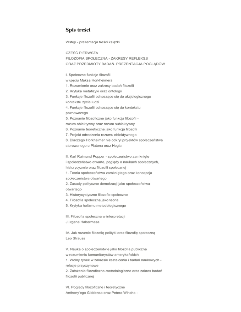 Spis treści Wstęp - prezentacja treści książki CZEŚĆ PIERWSZA FILOZOFIA SPOŁECZNA - ZAKRESY REFLEKSJI ORAZ PRZEDMIOTY BADAŃ. PREZENTACJA POGLĄDÓW I. Społeczne funkcje filozofii w ujęciu Maksa Horkheimera 1. Rozumienie oraz zakresy badań filozofii 2. Krytyka metafizyki oraz ontologii 3. Funkcje filozofii odnoszące się do aksjologicznego kontekstu życia ludzi 4. Funkcje filozofii odnoszące się do kontekstu poznawczego 5. Poznanie filozoficzne jako funkcja filozofii rozum obiektywny oraz rozum subiektywny 6. Poznanie teoretyczne jako funkcja filozofii 7. Projekt odrodzenia rozumu obiektywnego 8. Dlaczego Horkheimer nie odkrył projektów społeczeństwa sterowanego u Platona oraz Hegla II. Karl Raimund Popper - społeczeństwo zamknięte i społeczeństwo otwarte, poglądy o naukach społecznych, historycyzmie oraz filozofii społecznej 1. Teoria społeczeństwa zamkniętego oraz koncepcja społeczeństwa otwartego 2. Zasady polityczne demokracji jako społeczeństwa otwartego 3. Historycystyczne filozofie społeczne 4. Filozofia społeczna jako teoria 5. Krytyka holizmu metodologicznego III. Filozofia społeczna w interpretacji Jrgena Habermasa IV. Jak rozumie filozofię polityki oraz filozofię społeczną Leo Strauss V. Nauka o społeczeństwie jako filozofia publiczna w rozumieniu komunitarystów amerykańskich 1. Wolny rynek w zakresie kształcenia i badań naukowych relacje przyczynowe 2. Założenia filozoficzno-metodologiczne oraz zakres badań filozofii publicznej VI. Poglądy filozoficzne i teoretyczne Anthony‘ego Giddensa oraz Petera Wincha - odniesienie do nauk społecznych VII. Filozofia społeczna w ujęciu filozofów polskich 1. Neotomistyczna (personalistyczna) filozofia społeczna Józefa Majki oraz Stanisława Kowalczyka 2. Ontologia społeczeństwa Józefa Lipca VIII. Filozofia prawa a filozofia społeczna 1. Poglądy Zygmunta Ziembińskiego 2. Poglądy Romana Tokarczyka 3. Filozofia społeczna w rozumieniu Kazimierza Opałka IX. Jak rozumieć filozofię społeczną i filozofię polityki? Projekt zakresów badań filozofii społecznej oraz sugestie (dyrektywy) metodologiczne CZĘŚĆ DRUGA ZAGADNIENIA FILOZOFICZNO-TEORETYCZNE I. Demokracja proceduralna demokracja republikańska 1. Dwa modele demokracji 2. Proceduralny model demokracji 3. Demokracja republikańska 4. Czy Unia Europejska jest demokracją proceduralną? II. Dobro wspólne w demokracji a polityka demokratyczna 1. Trzy koncepcje dobra wspólnego 2. Nieteoretyczny status dobra wspólnego 3. Ontologiczne zagadnienia dobra wspólnego 4. Filozoficzna koncepcja dobra wspólnego 4.1. Struktura wartości dobra wspólnego 4.2. Sprawiedliwość jako wartość prymarna 4.3. Pokój społeczny 4.4. Demokracja, państwo, demokratyczne prawo i procedury prawne 4.5. Wolność pozytywna 4.6. Wartość osoby ludzkiej 4.7. Gospodarka jako dobro wspólne 5. Dobro wspólne w państwie demokratycznym 6. Trzy polityki demokratyczne ufundowane na wartości sprawiedliwości 6.1. Polityka gospodarcza 6.2. Polityka edukacyjna 6.3. Polityka społeczna III. Religia w społeczeństwie otwartym (demokratycznym) 1. Poglądy Michaela Walzera oraz Jrgena Habermasa dotyczące usytuowania wartości chrześcijańskich w demokracji 2. Koncepcja demokracji chrześcijańskiej (personalistycznej) Jacques‘a Maritaina 3. Poglądy Jana Pawła II dotyczące demokracji 4. Religia i Kościół w demokracji 5. Aksjologiczne i funkcjonalne znaczenie religii i Kościoła w demokracji IV. Zagadnienia filozoficzne w analizach społeczeństwa informacyjnego 1. Zagadnienia pojęcia społeczeństwa informacyjnego 2. Dystrybutywne analizy społeczeństwa informacyjnego 3. Otwartość ontologiczna społeczeństwa informacyjnego 4. Zakresy otwartości 5. Projektowane pojęcie społeczeństwa informacyjnego 6. Wyjaśnienie przyczyn powstania oraz rozwoju społeczeństwa informacyjnego 7. Struktura społeczeństwa informacyjnego 8. Społeczeństwo informacyjne a demokracja 9. Internet - sieci obywatelskie - rewolucje społeczne CZĘŚĆ TRZECIA ZAGADNIENIA EMPIRYCZNE I. Typologia społeczeństwa obywatelskiego w Polsce cztery formy oraz projekt inteligentnego społeczeństwa obywatelskiego 1. Cztery formy stowarzyszeń w ujęciu Alexisa de Tocqueville‘a 2. Pojęcia społeczeństwa obywatelskiego 3. Cztery formy społeczeństwa obywatelskiego w Polsce 3.1. Polityczne społeczeństwo obywatelskie 3.2. Gospodarcze społeczeństwo obywatelskie 3.3. Społeczeństwo obywatelskie w sferze kultury 3.4. Lokalne społeczeństwo obywatelskie 4. Przyczynek do charakterystyki społeczeństwa obywatelskiego w Polsce: czy istnieje stagnacja obywatelska? 5. Konkluzje - dyskursy społeczne oraz demokracja deliberacyjna 6. Projekt inteligentnego społeczeństwa obywatelskiego II. Społeczna odpowiedzialność biznesu a dobro wspólne 1. Trzy zasady Andrew Carnegiego, które fundują społeczną odpowiedzialność biznesu 2. Dwa stanowiska krytyczne wobec idei społecznej odpowiedzialności biznesu 2.1. Libertarianie - Milton Friedman 2.2. Józef Bocheński - cel immanentny przedsiębiorstwa to produkcja 3. Nieteologiczne (świeckie) koncepcje społecznej odpowiedzialności biznesu 4. Wartości dobra wspólnego a społeczna odpowiedzialność biznesu 4.1. Przedmiotowy zakres odpowiedzialności biznesu oraz zasady (normy) powszechnych obowiązków 4.2. Podmiotowy zakres odpowiedzialności oraz zasady (normy) indywidualnych zobowiązań III. Problemy empiryczne zarządzania przez państwo niektórymi instytucjami publicznymi 1. Fragmentacja i autonomizacja oraz partykularyzm biurokracji 2. Fragmentacja organizacyjna 3. Fragmentacja funkcjonalna Zakończenie: Sprawne państwo w tworzeniu polityki demokratycznej i zarządzaniu nią Bibliografia Indeks nazwisk ISBN: 978-83-7383710-2